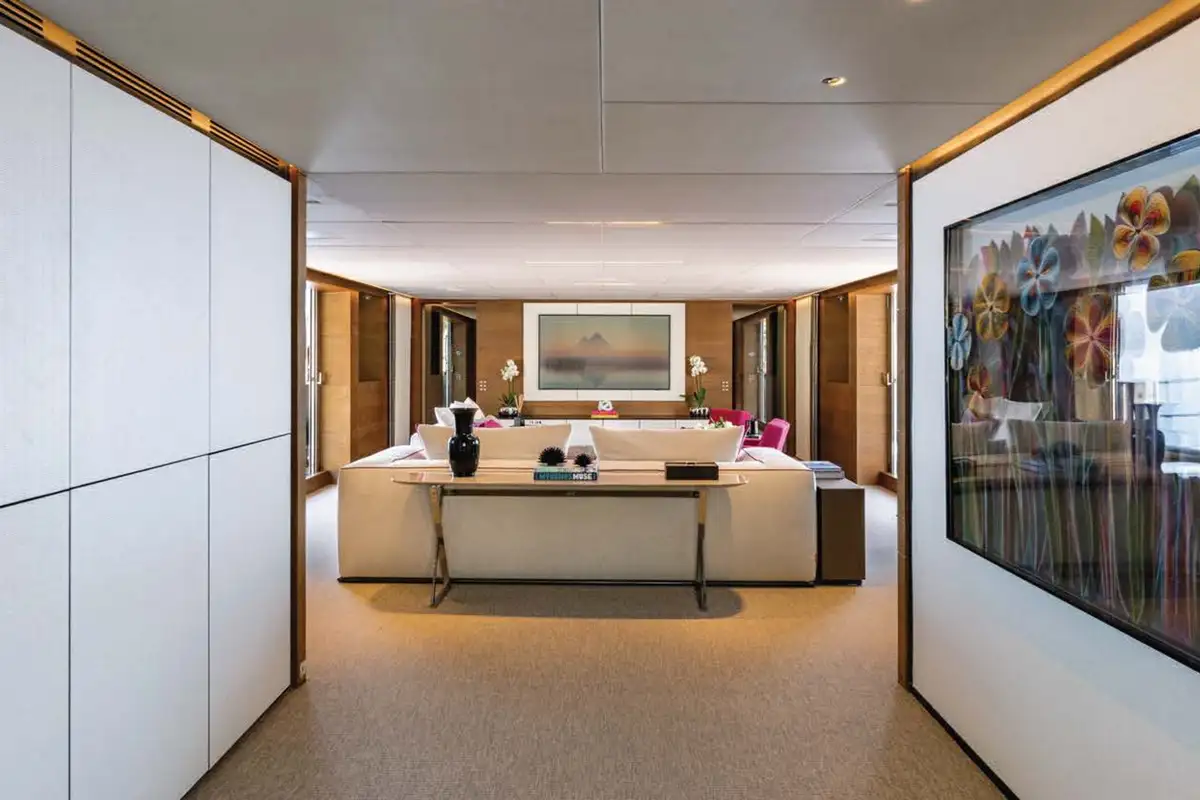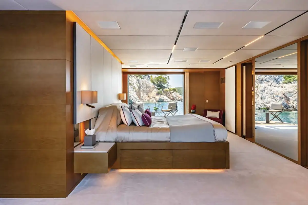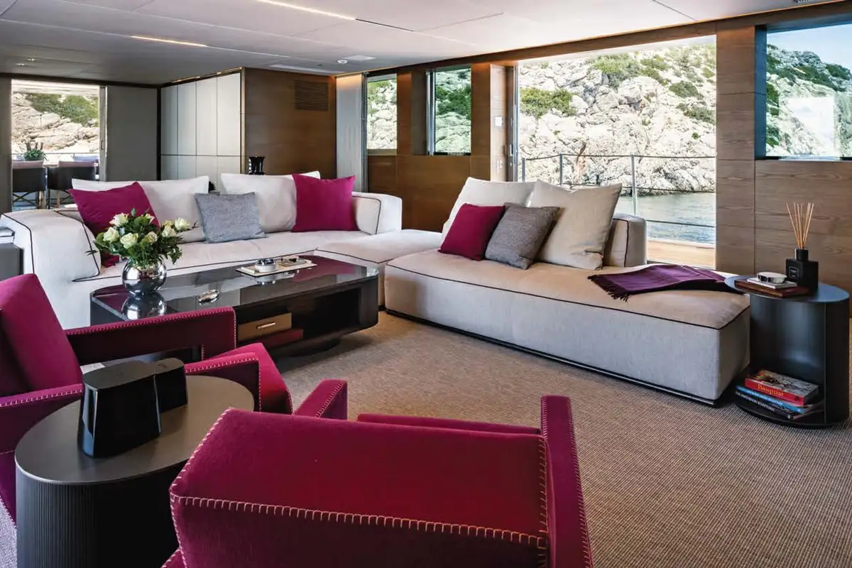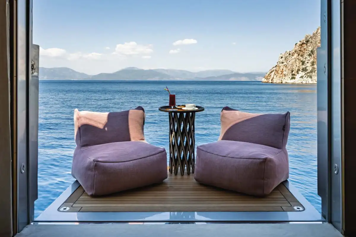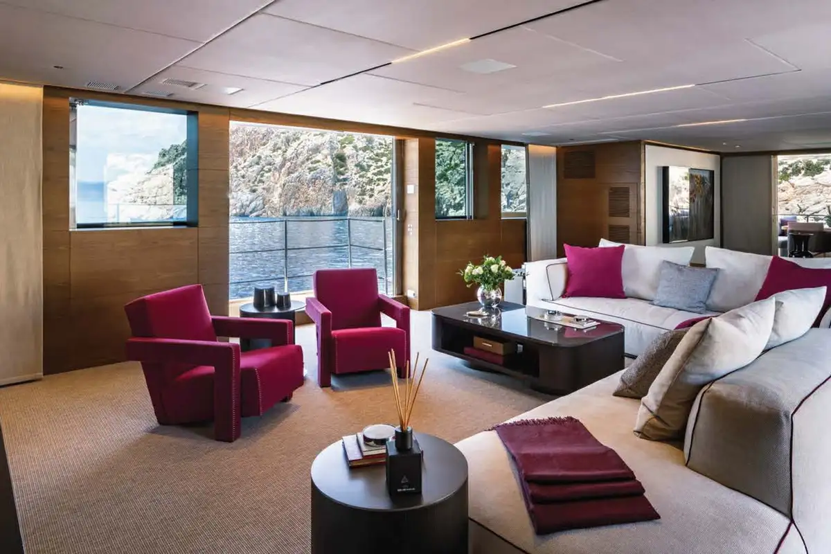 Her main deck lounge is an elegant living room with L-shaped sofas, design classic armchairs and floor-to-ceiling glass on three sides. With both balconies deployed and a gentle sea breeze flowing through, it’s an exquisite and tranquil place to unwind.