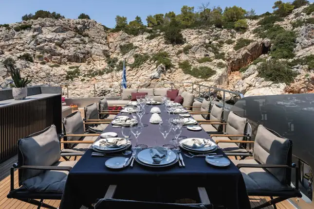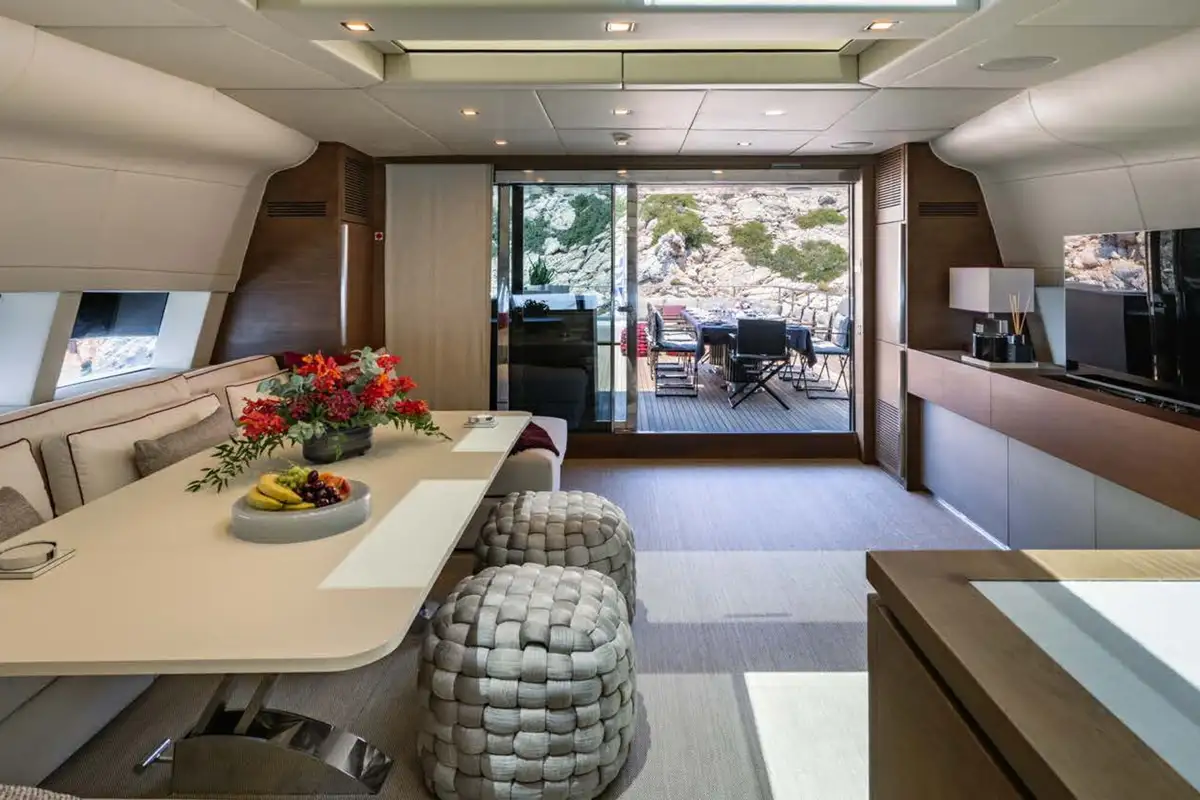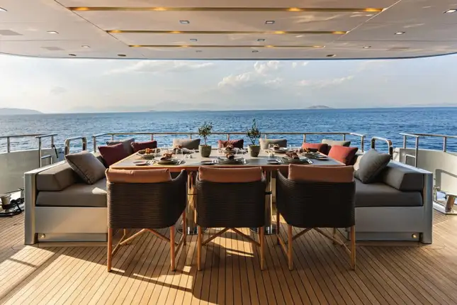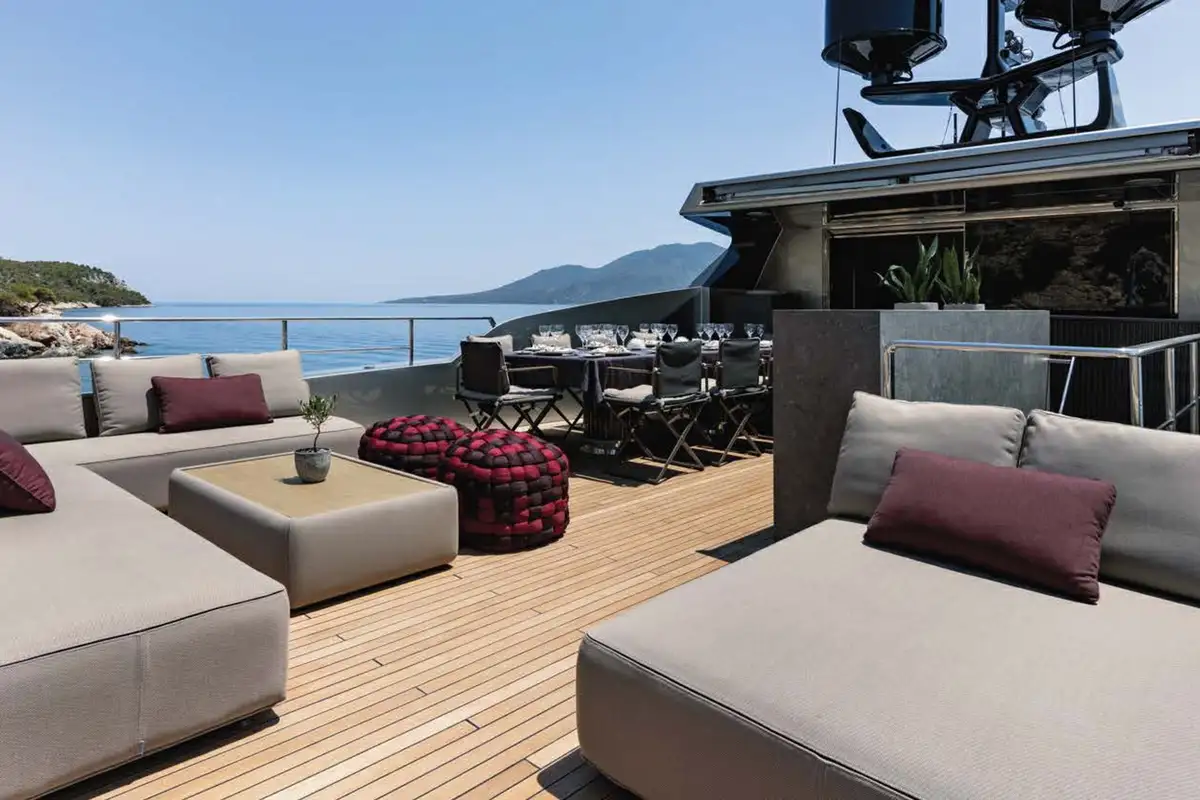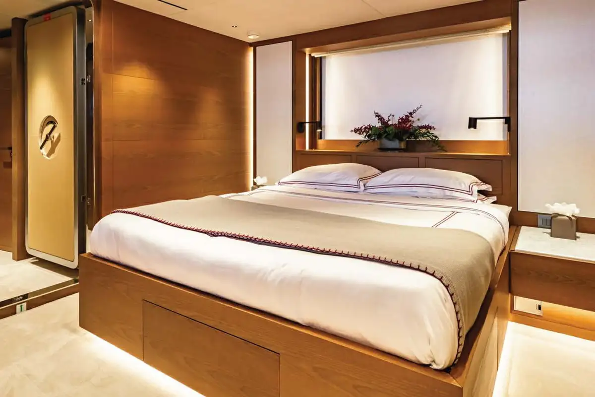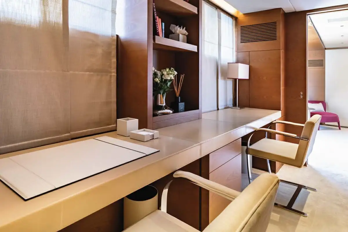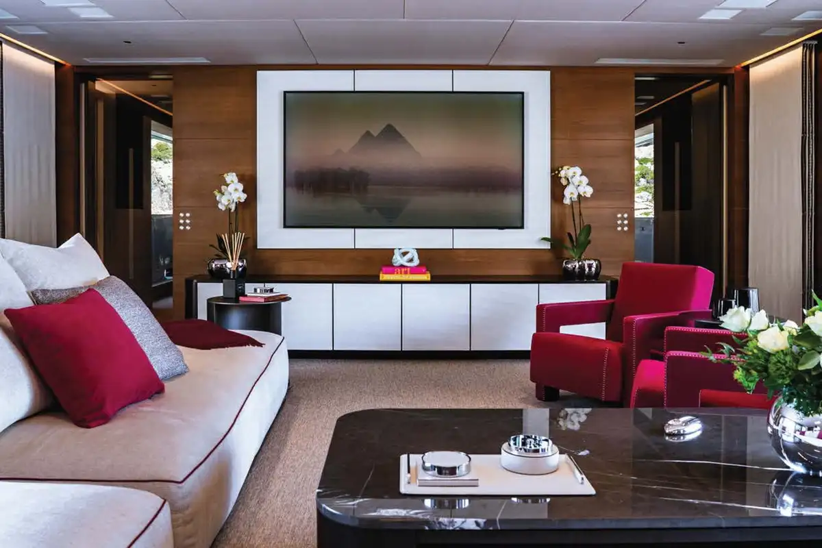 Her main deck lounge is an elegant living room with L-shaped sofas, design classic armchairs and floor-to-ceiling glass on three sides. With both balconies deployed and a gentle sea breeze flowing through, it’s an exquisite and tranquil place to unwind.
