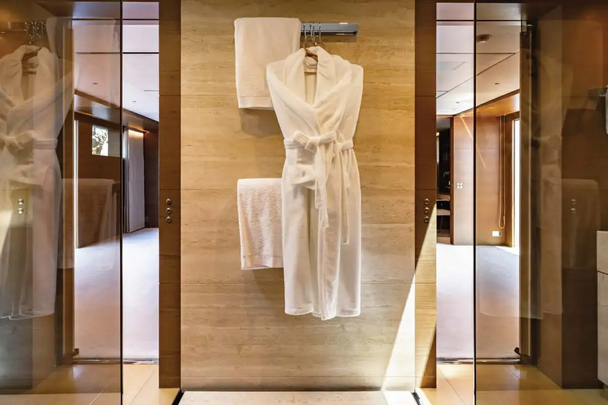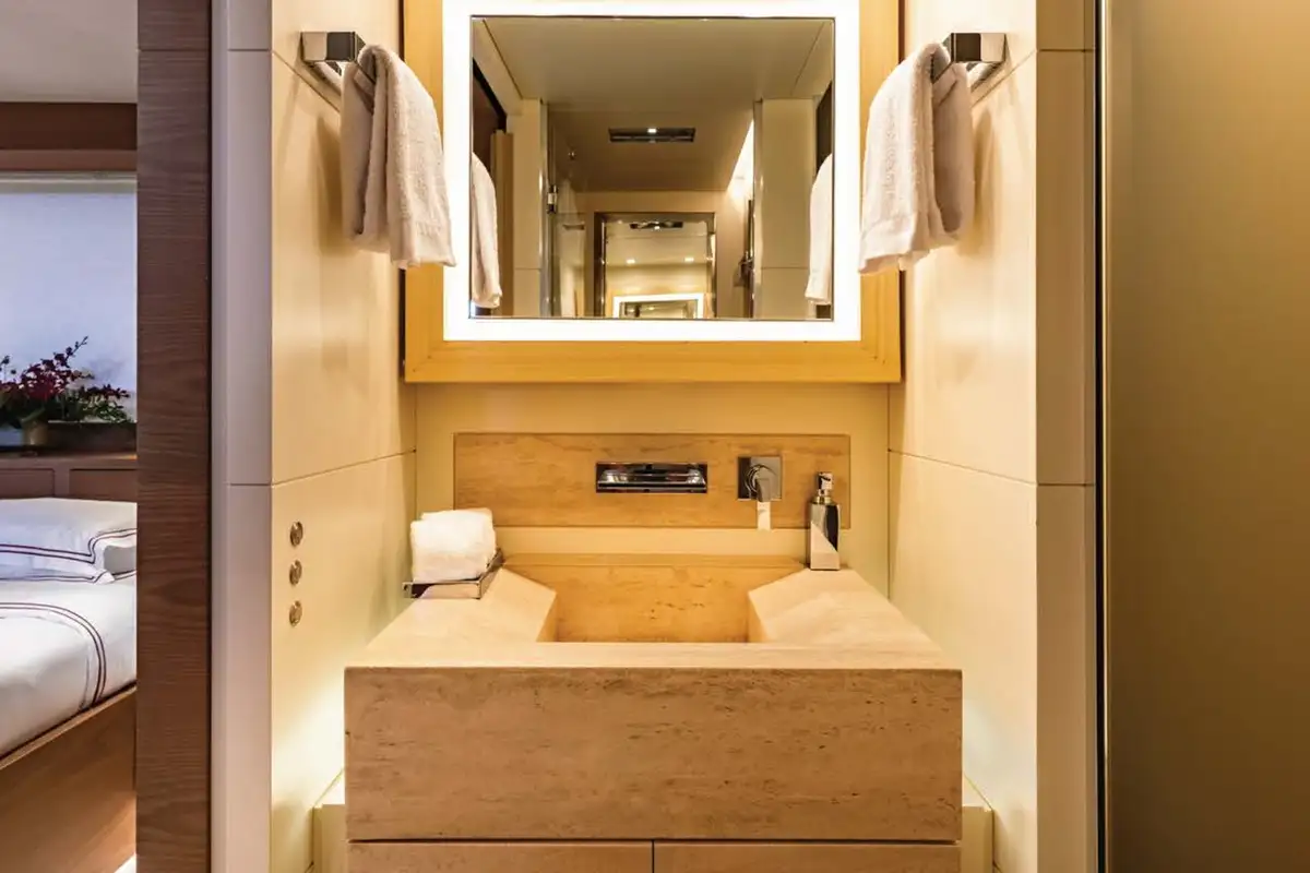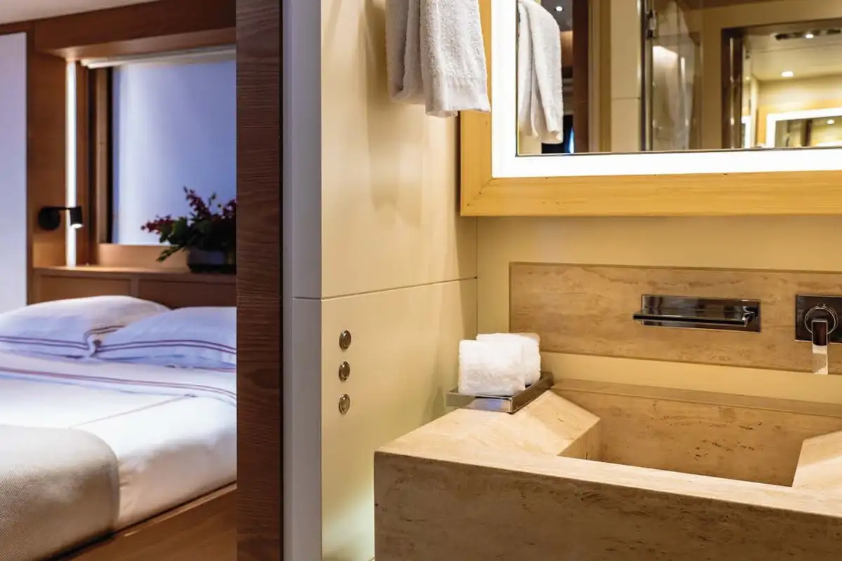 Up front on the main deck level is the full-beam master suite, where a study area with a two-seat office desk leads into the main cabin. Here again you can open up the room when the yacht is anchored, with fold-out balcony terraces on both sides. The en suite bathroom is a his-and-hers configuration with a full marble finish and a rain room shower.