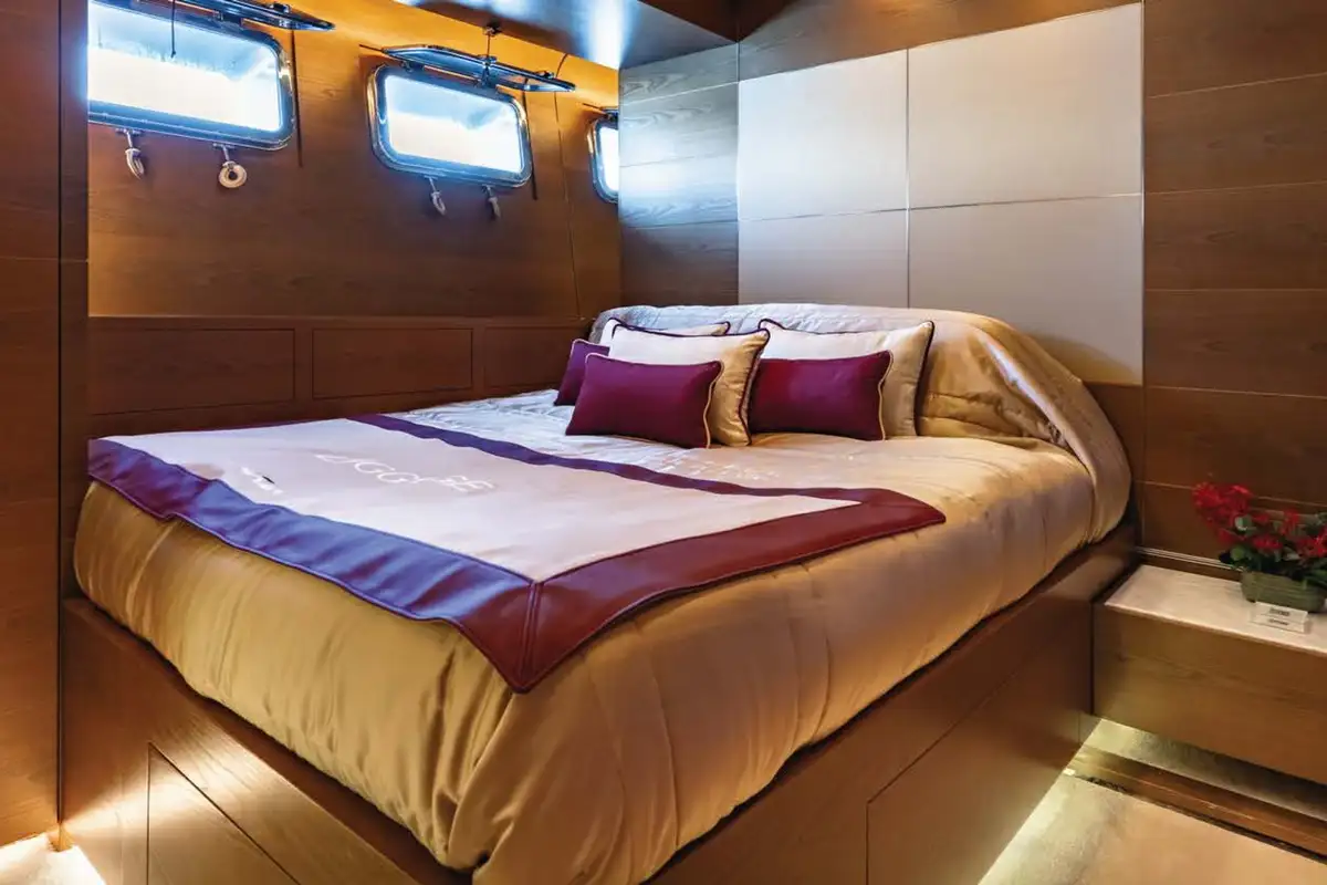 Notably fast and powerful – with an exhilarating top speed of 26 knots and 16 knots when throttled back to efficient, comfortable cruising revs – this tri-deck vessel can significantly expand the range and scope of your voyaging. She’s designed to host 10 guests on board in five cabins with seven crew at your service.