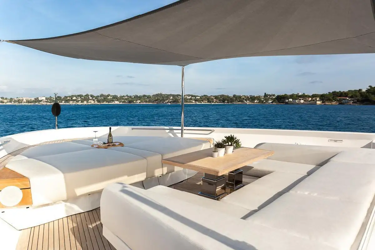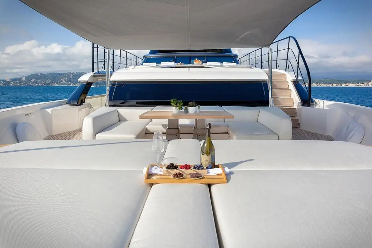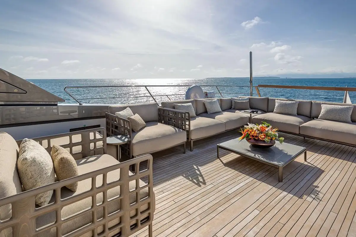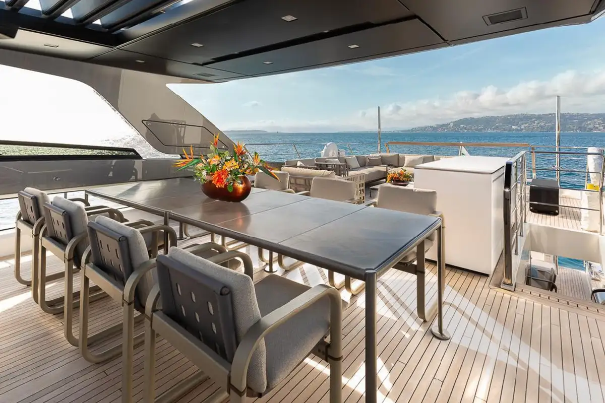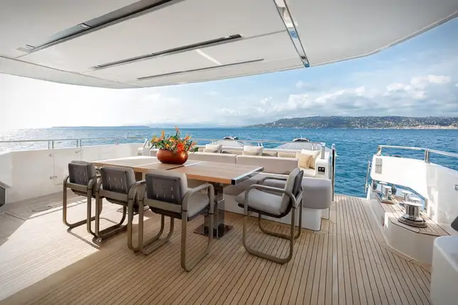 The main deck aft cockpit has an eight-seat lounge-dining area with shade from the sundeck overhang, and day beds in full sun astern. The sundeck has a lounge with L-shaped sofas aft, a bar and another eight-seat dining table under the hardtop, which has a wide-opening sunroof, and a flybridge helm up forward.