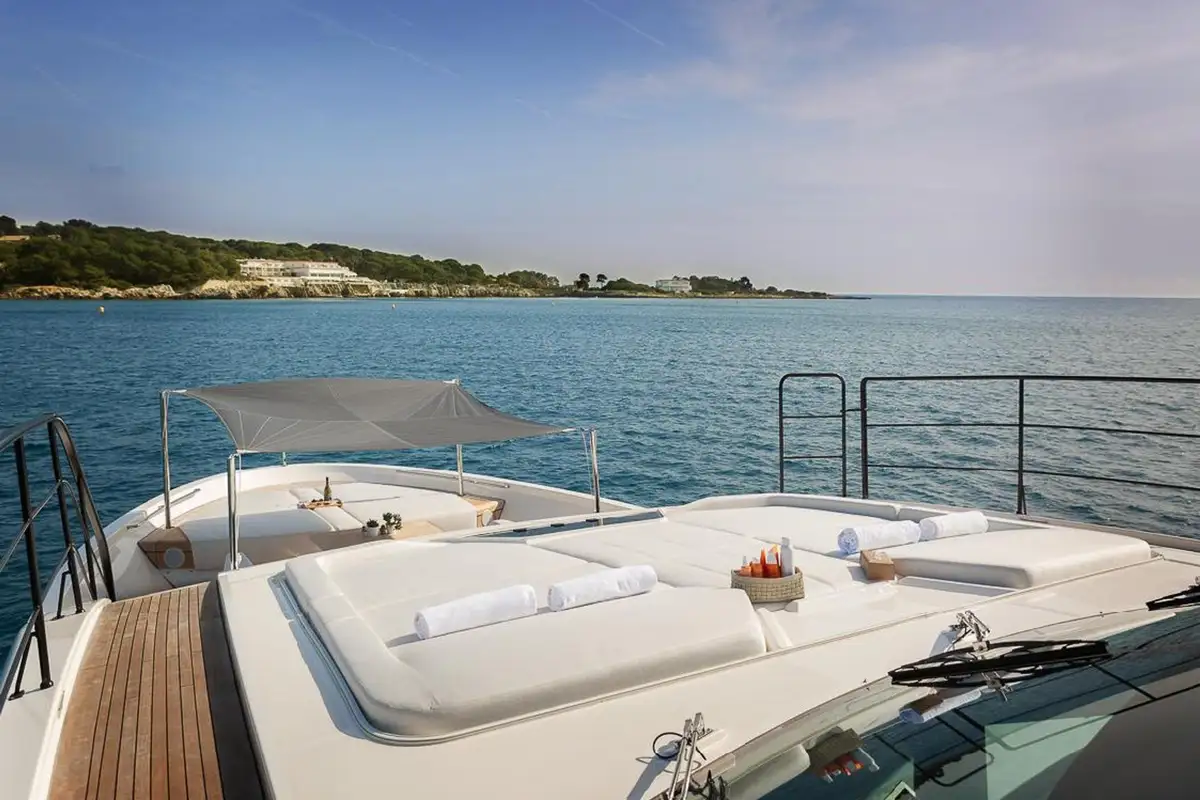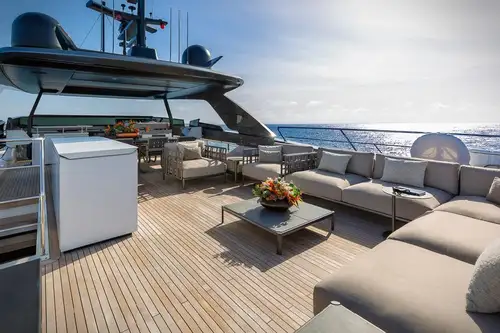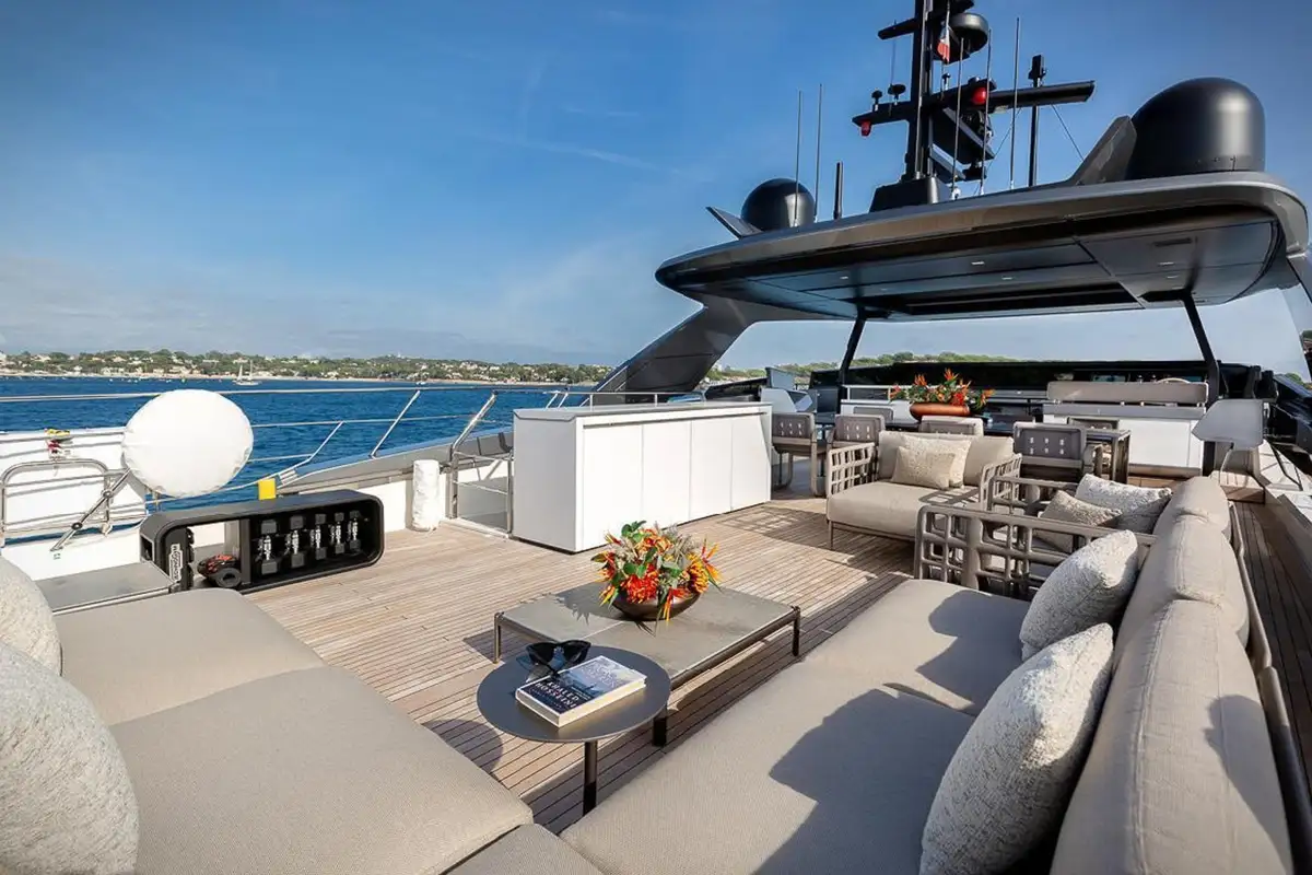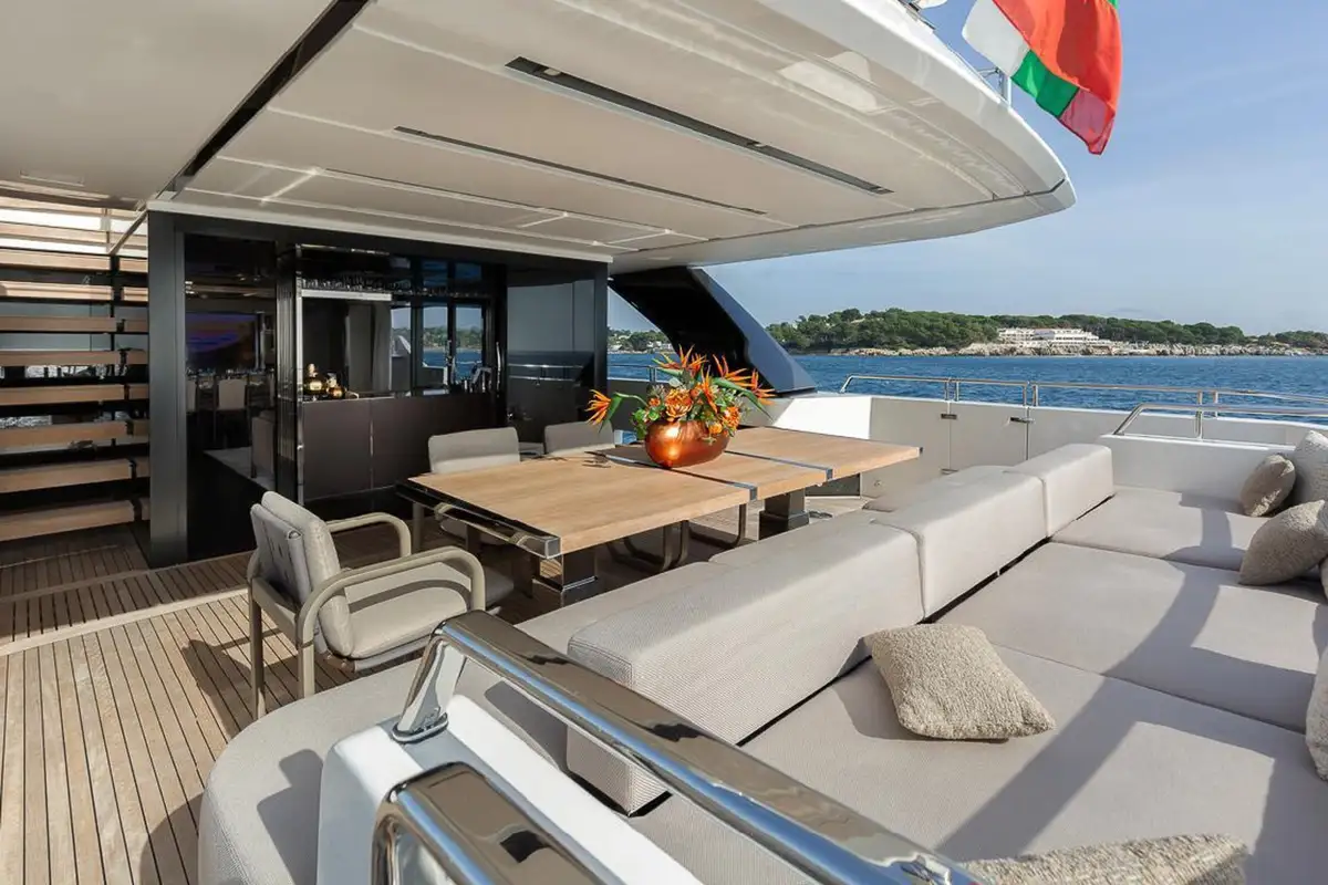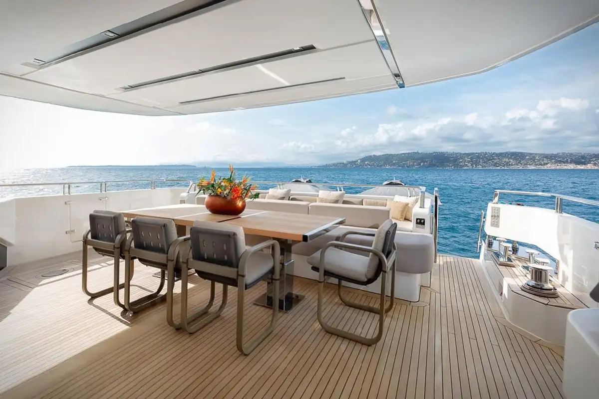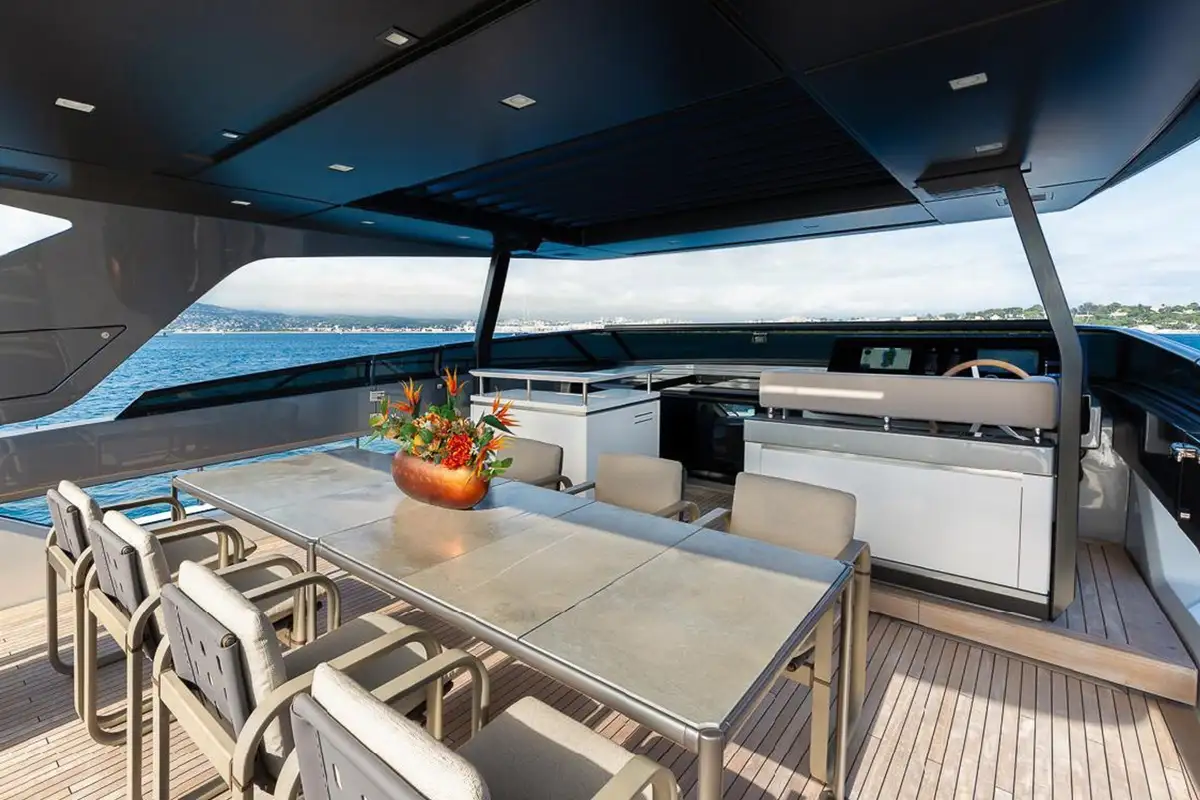 The main deck aft cockpit has an eight-seat lounge-dining area with shade from the sundeck overhang, and day beds in full sun astern. The sundeck has a lounge with L-shaped sofas aft, a bar and another eight-seat dining table under the hardtop, which has a wide-opening sunroof, and a flybridge helm up forward.