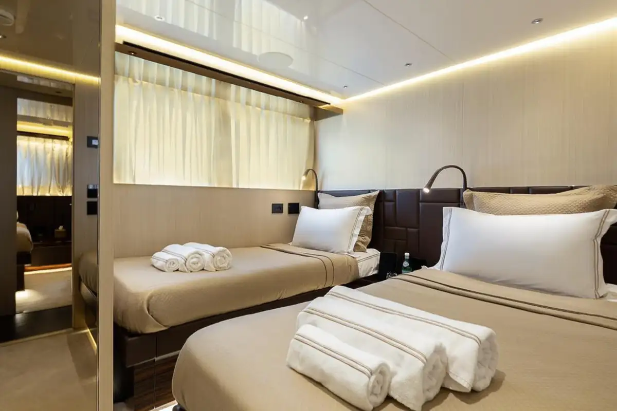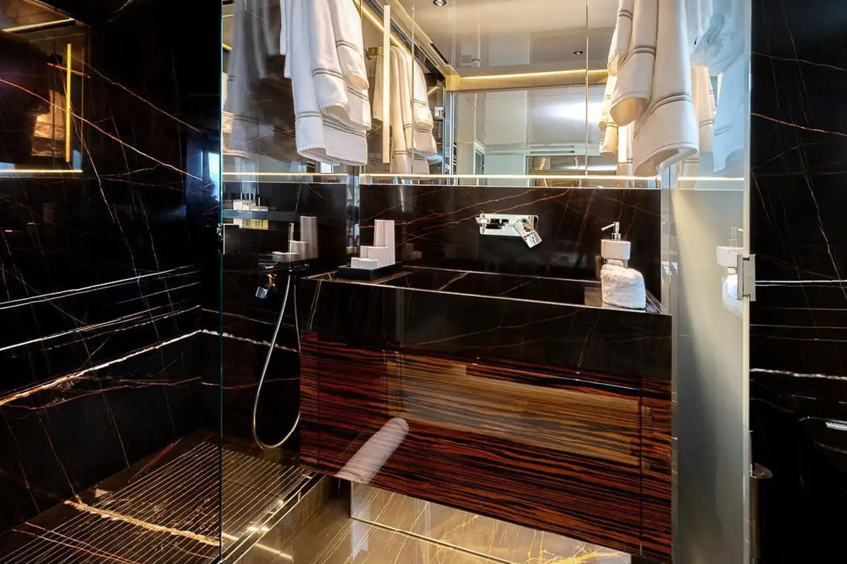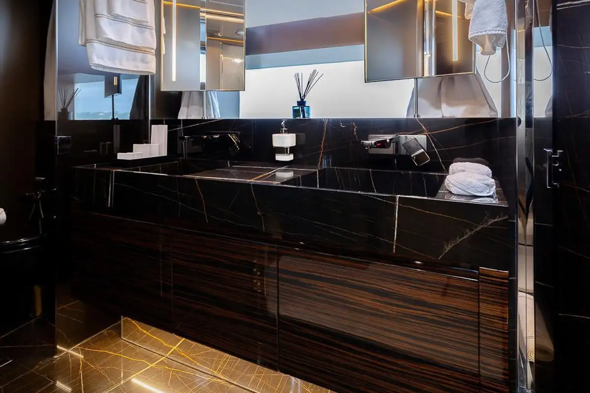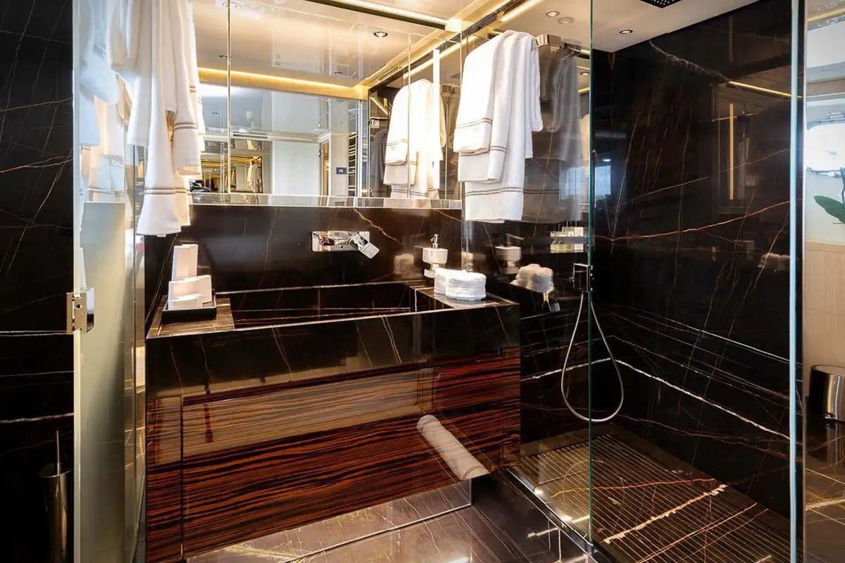 Up forward on the main deck, the master suite is a full-beam cabin with big windows on three sides, including one facing forward. There’s a king size bed on the centreline, an armchair and a black marble en suite bathroom with a rain room shower. The other four cabins – three doubles and a twin, all on the lower deck – are finished in a similar luxe contemporary style.