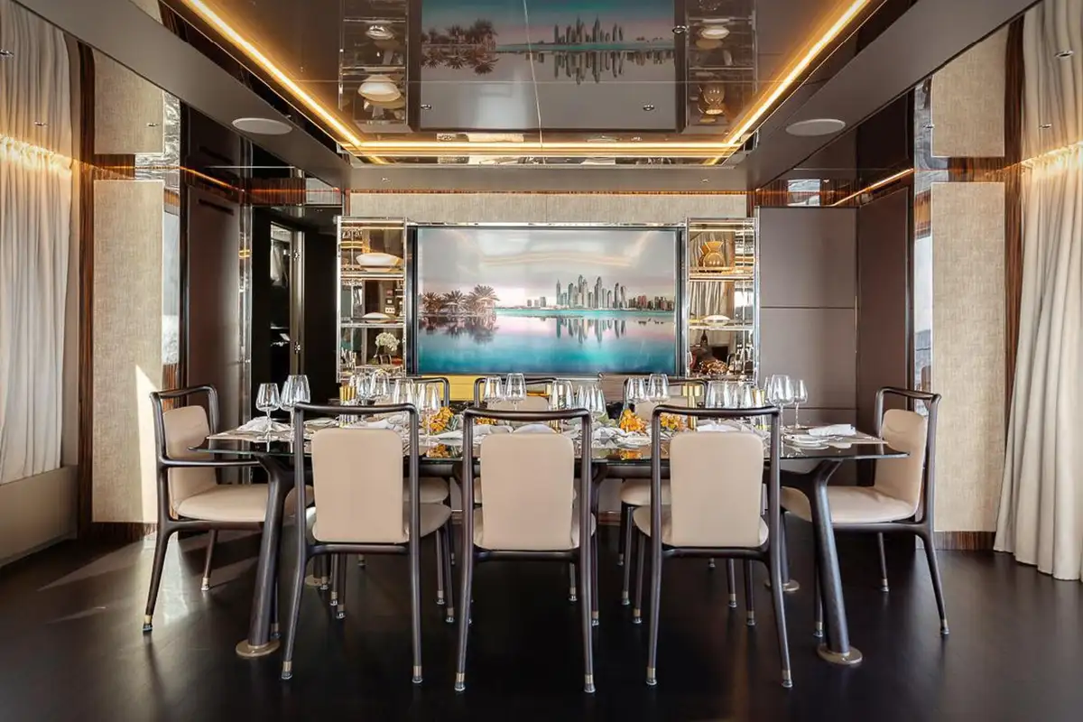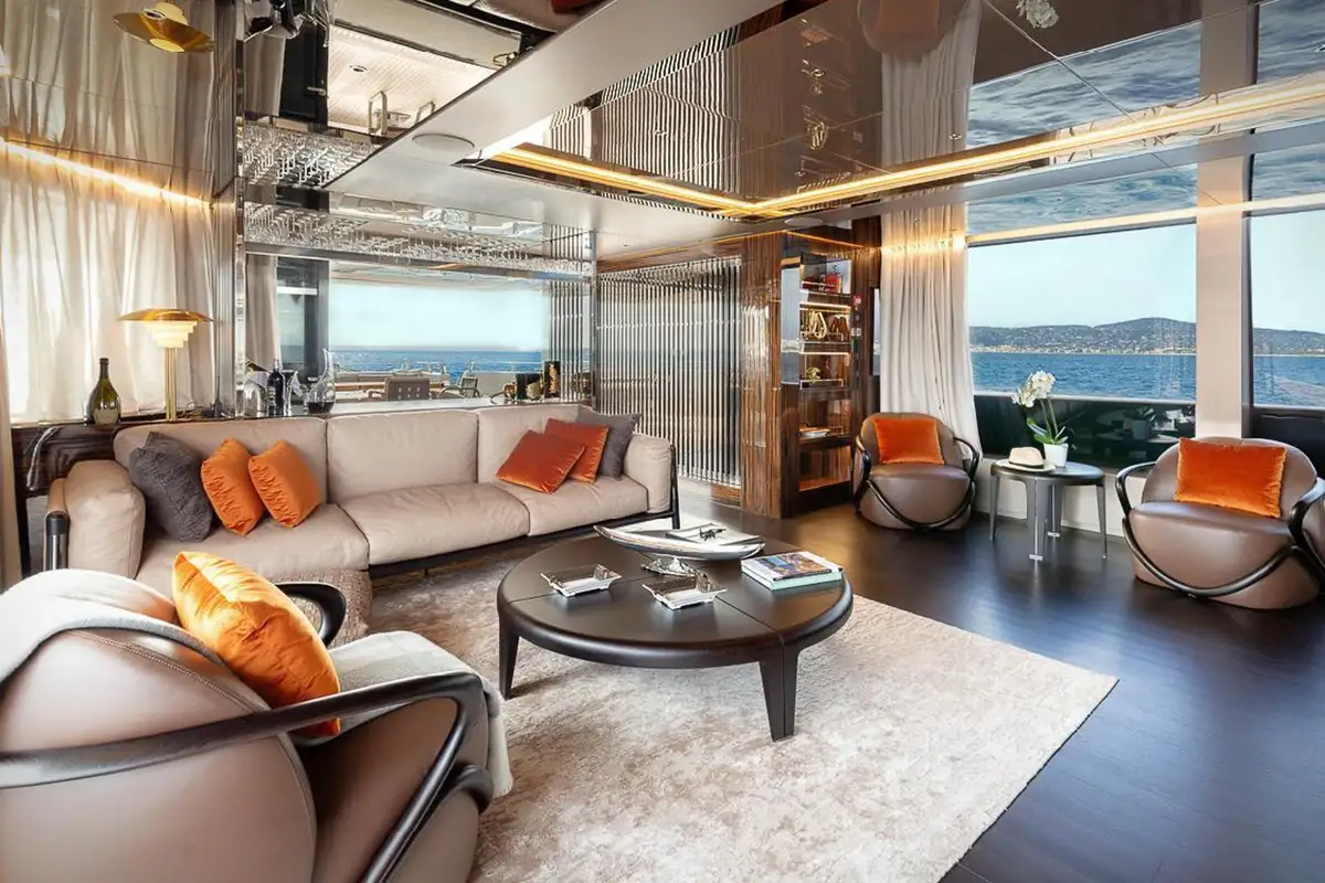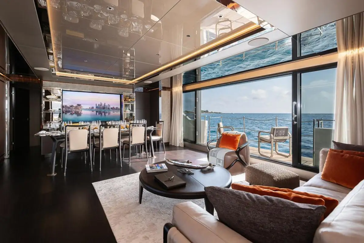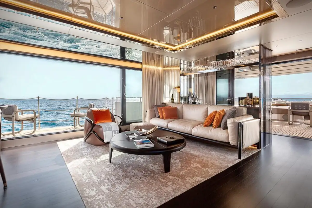 The main deck lounge is where this yacht’s asymmetric accommodation layout really shines. There’s floor to ceiling glass along the whole starboard side of the lounge, which slides open wide to let the sea breeze flow through. A balcony terrace folds out of her topside to almost seamlessly merge with the lounge. The décor in here is stunning, styled by Zuccon International, with clever use of high-gloss surfaces and a superb quality of finish.