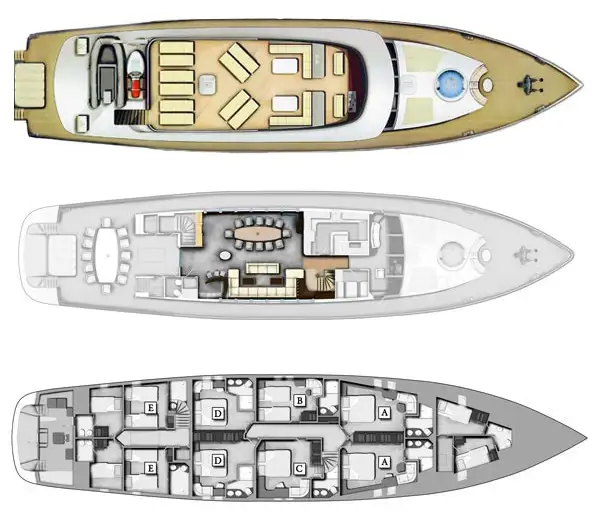 Her outside spaces include an expansive sun deck with separate lounge and sunbathing zones, a foredeck lounge with a jacuzzi pool, a shaded and sheltered main deck aft cockpit with a big dining table, and daybeds on the stern overlooking the bathing platform. Most of these areas, including the sundeck, can be shaded with awnings when required.