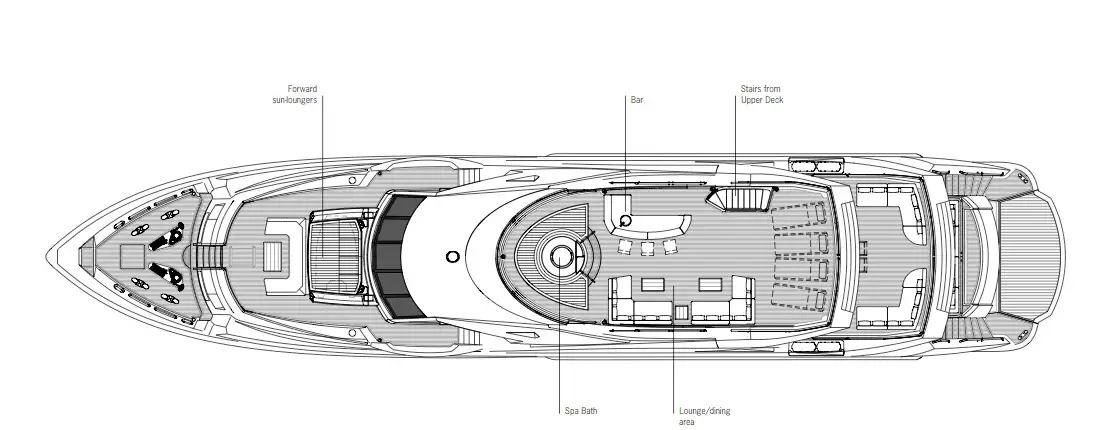 If you are seeking a little solitude on the open sun deck: a forward-facing sun pad surrounding the spa pool is the perfect area to unwind. This deck also serves as an outdoor gym area with the yacht’s Watt exercise bike, free weights and yoga mats. Towards the aft, there is a full bar and covered area with L-shaped sofas and small tables.