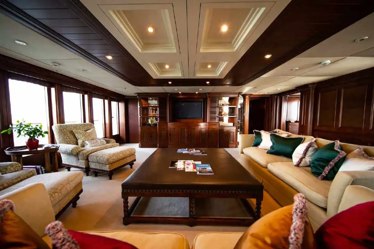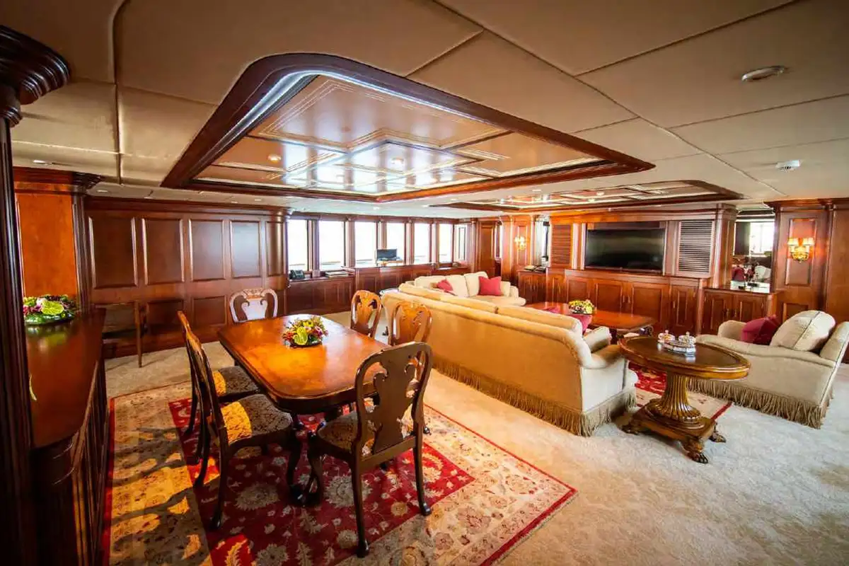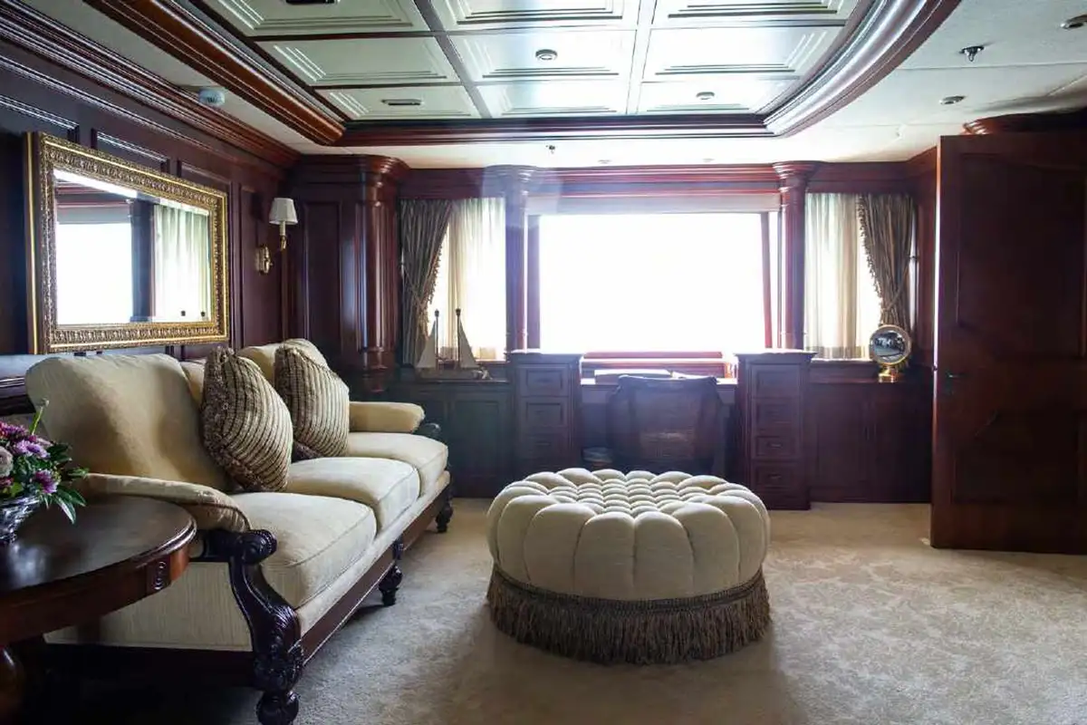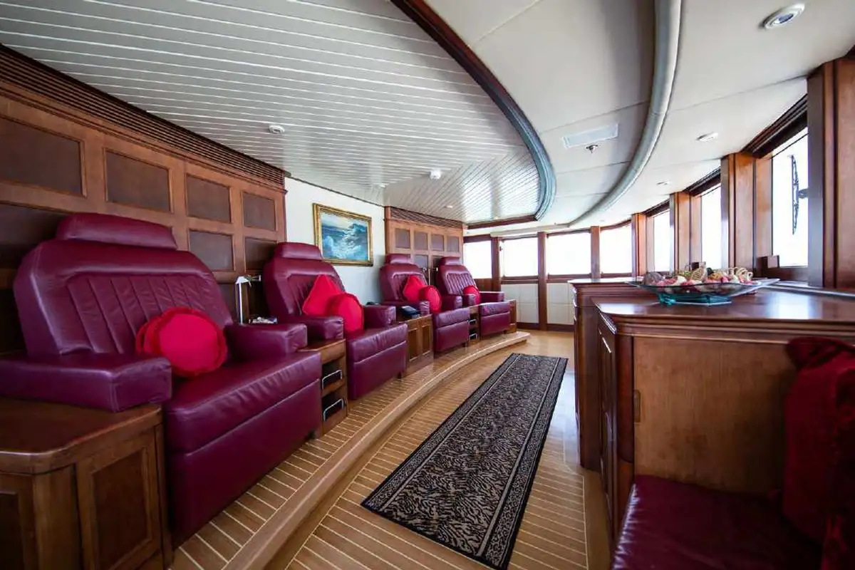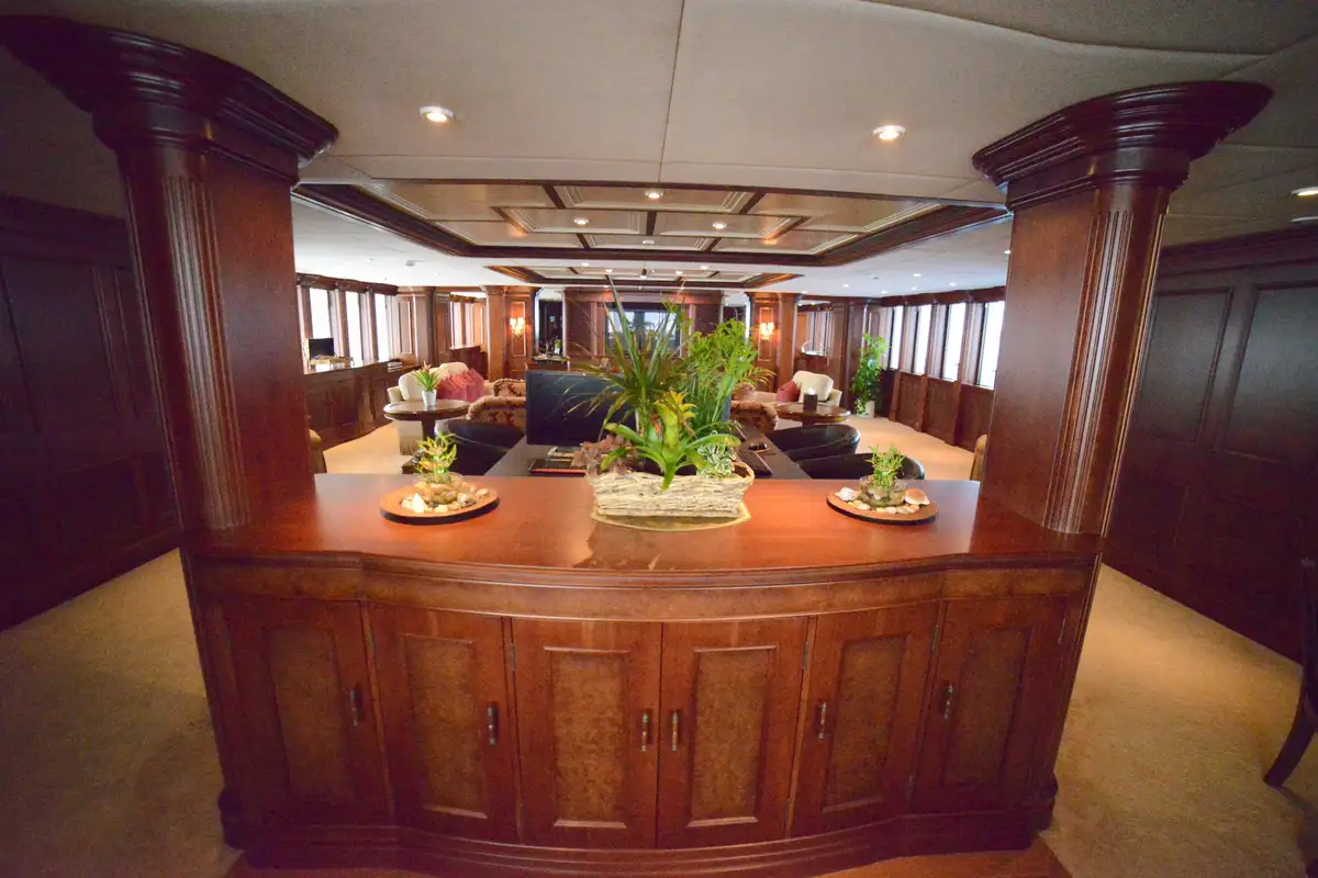 NOMAD's harmonious and classic interior offers generous reception areas decorated with intricate wood panelling and lavish antique furnishings. A secluded cinema has state of the art surround sound and projection systems and tiered seating on sumptuous sofas and chairs. She also has a spectacular observation lounge, large formal dining and lounge areas on both her main and upper decks. She accommodates up to 12 guests in six luxurious and well appointed cabins including a full width master cabin on the main deck with dressing area and library. Two VIP cabins are located on the lower deck amidships, and she has a further double cabin and two twin cabins with additional pullman berths.