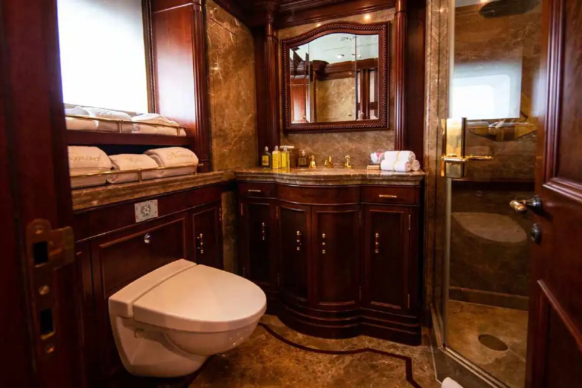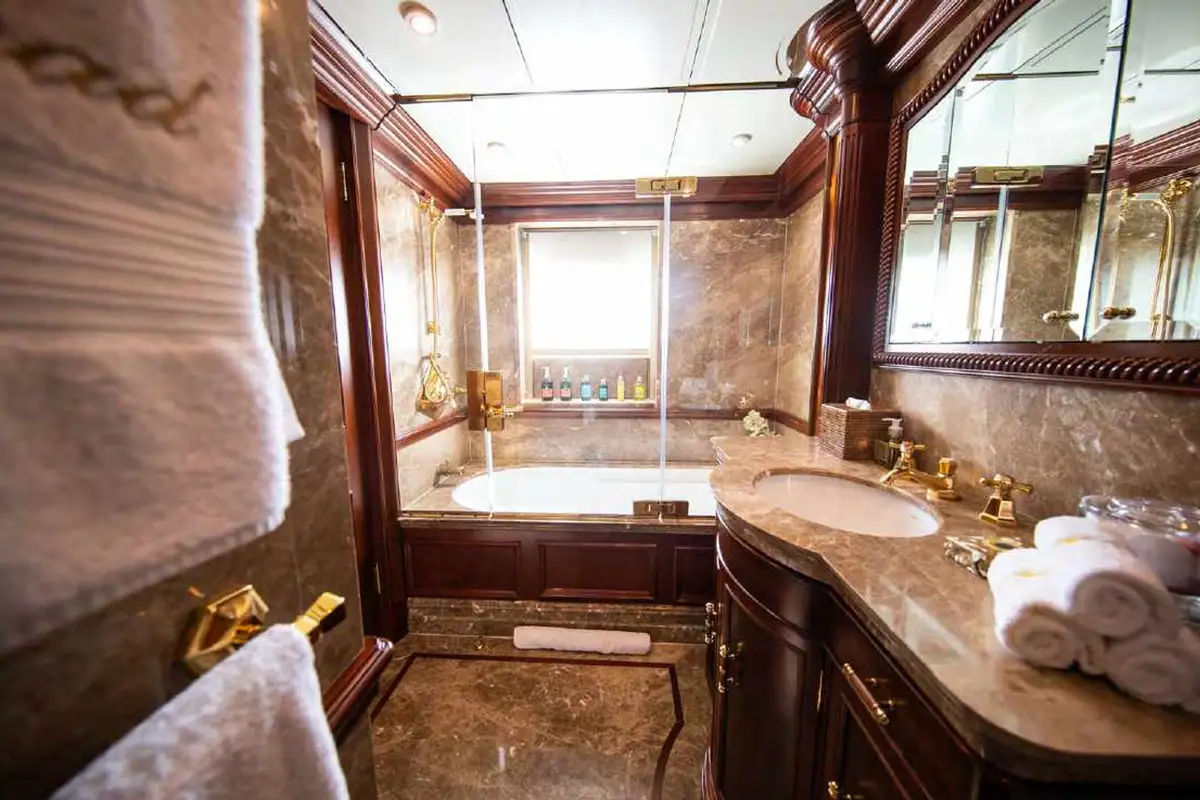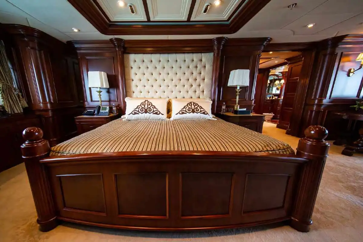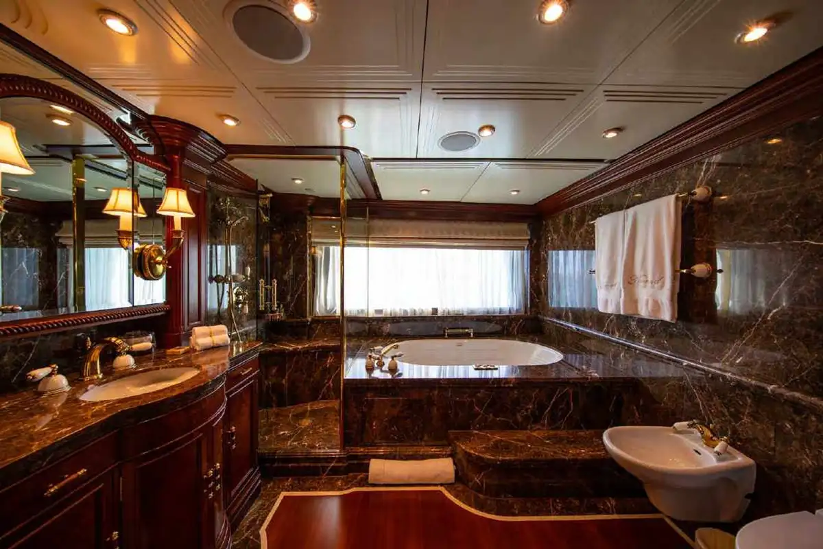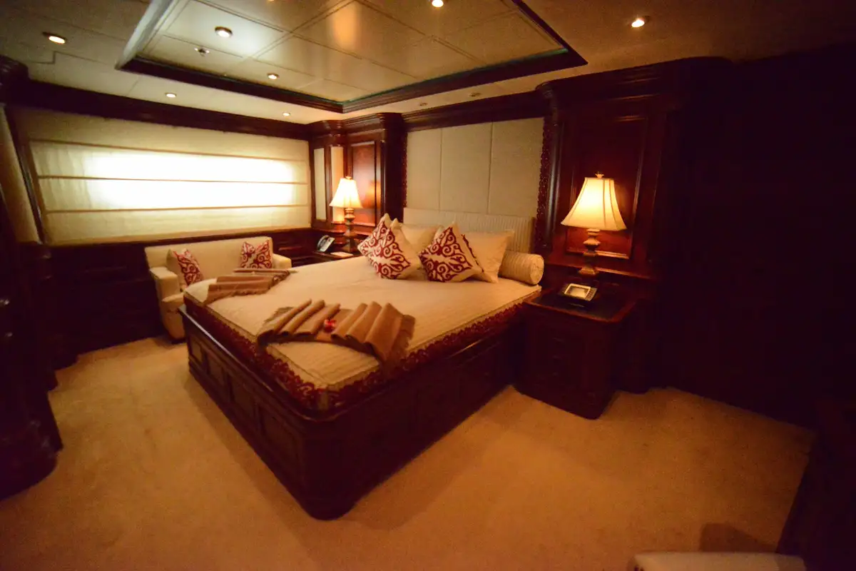 NOMAD's harmonious and classic interior offers generous reception areas decorated with intricate wood panelling and lavish antique furnishings. A secluded cinema has state of the art surround sound and projection systems and tiered seating on sumptuous sofas and chairs. She also has a spectacular observation lounge, large formal dining and lounge areas on both her main and upper decks. She accommodates up to 12 guests in six luxurious and well appointed cabins including a full width master cabin on the main deck with dressing area and library. Two VIP cabins are located on the lower deck amidships, and she has a further double cabin and two twin cabins with additional pullman berths.