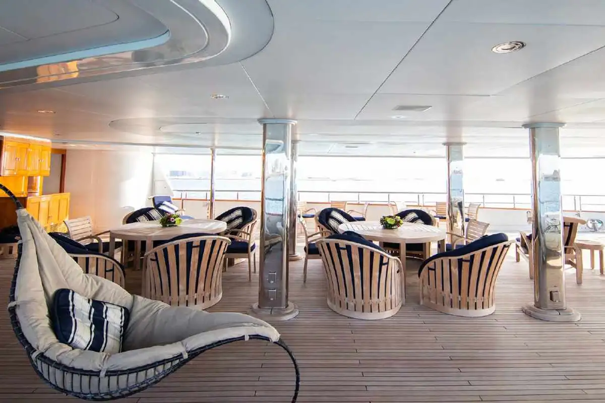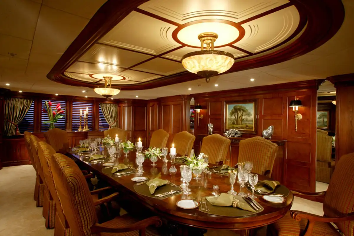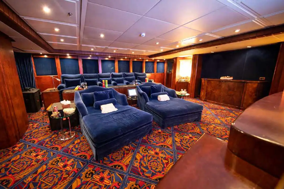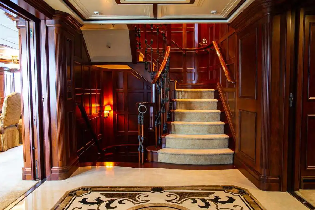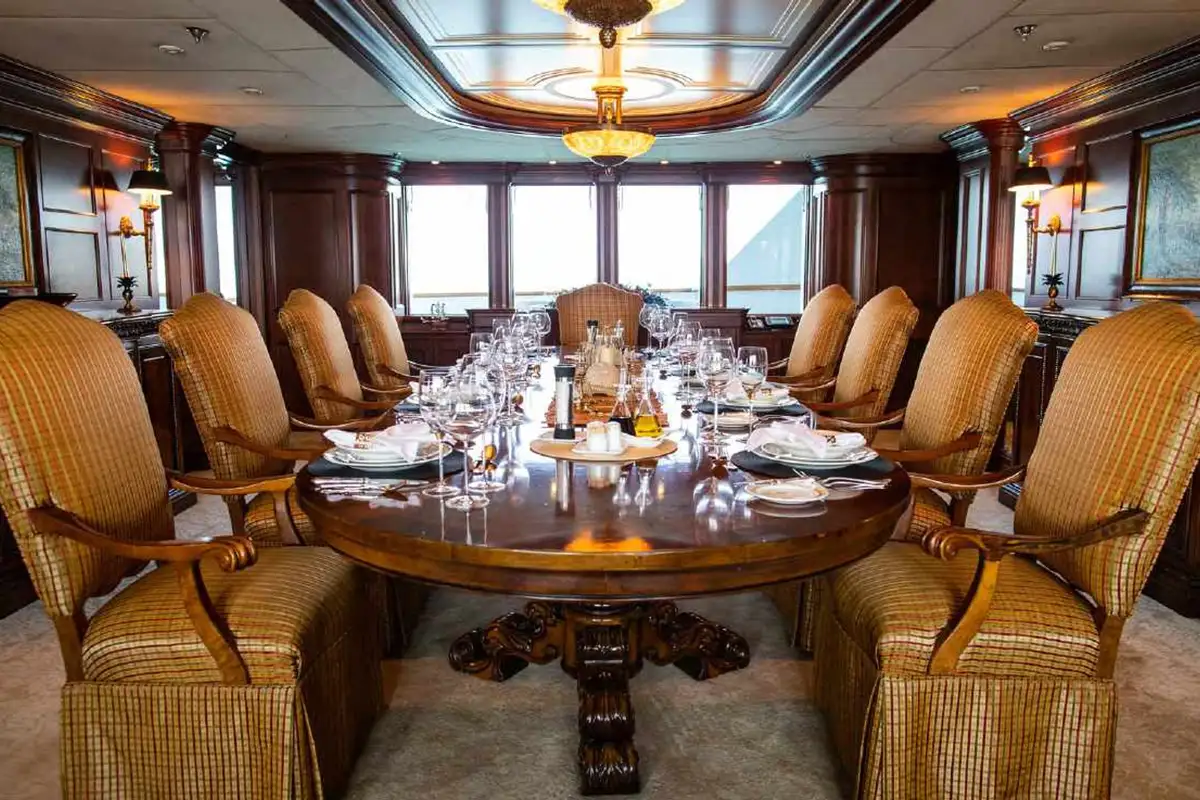 NOMAD's harmonious and classic interior offers generous reception areas decorated with intricate wood panelling and lavish antique furnishings. A secluded cinema has state of the art surround sound and projection systems and tiered seating on sumptuous sofas and chairs. She also has a spectacular observation lounge, large formal dining and lounge areas on both her main and upper decks. She accommodates up to 12 guests in six luxurious and well appointed cabins including a full width master cabin on the main deck with dressing area and library. Two VIP cabins are located on the lower deck amidships, and she has a further double cabin and two twin cabins with additional pullman berths.