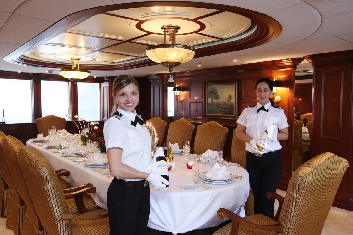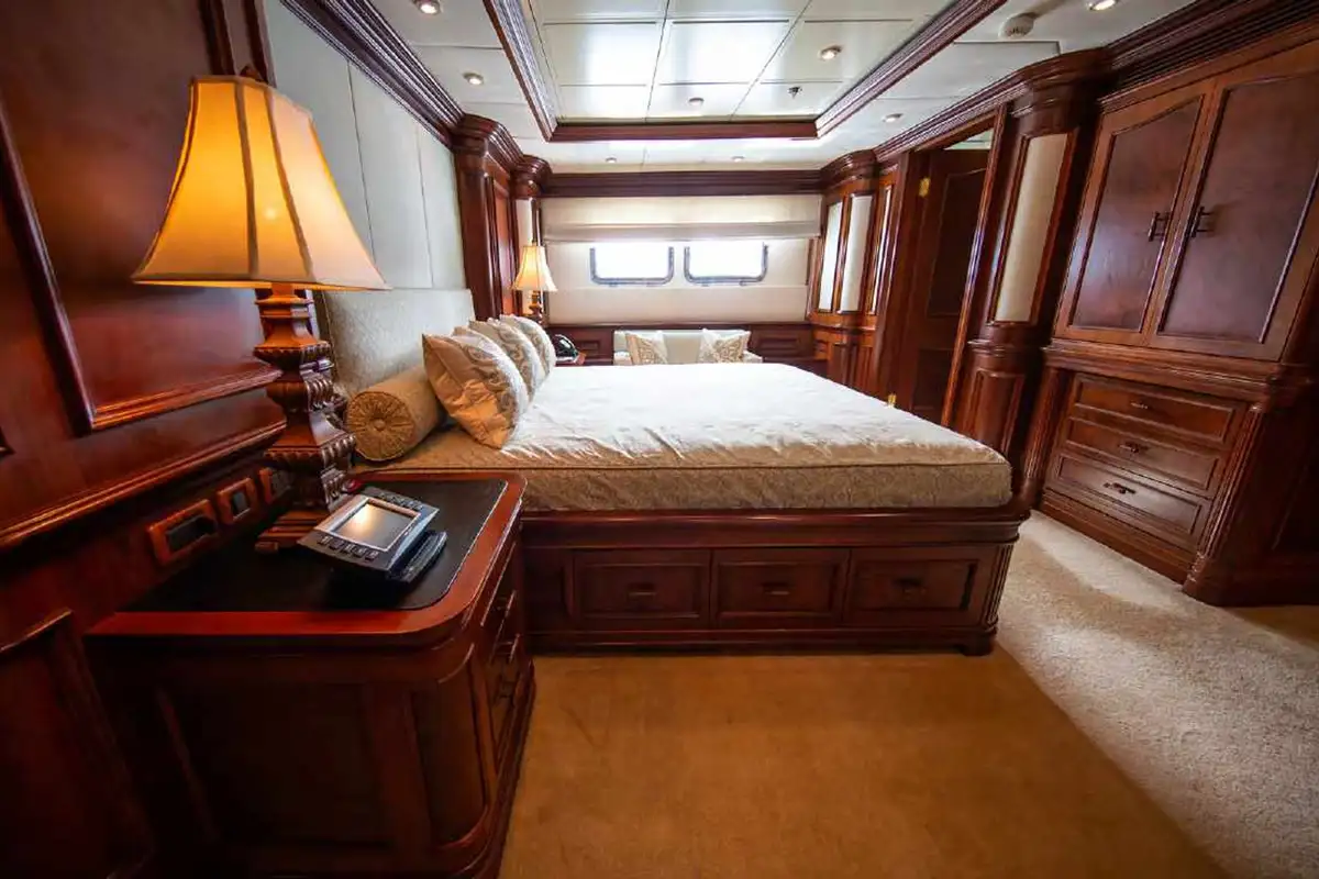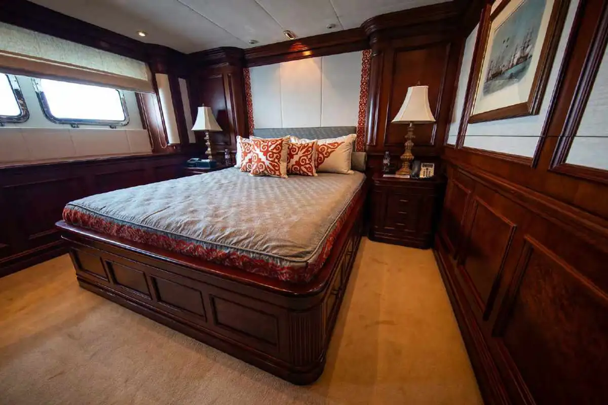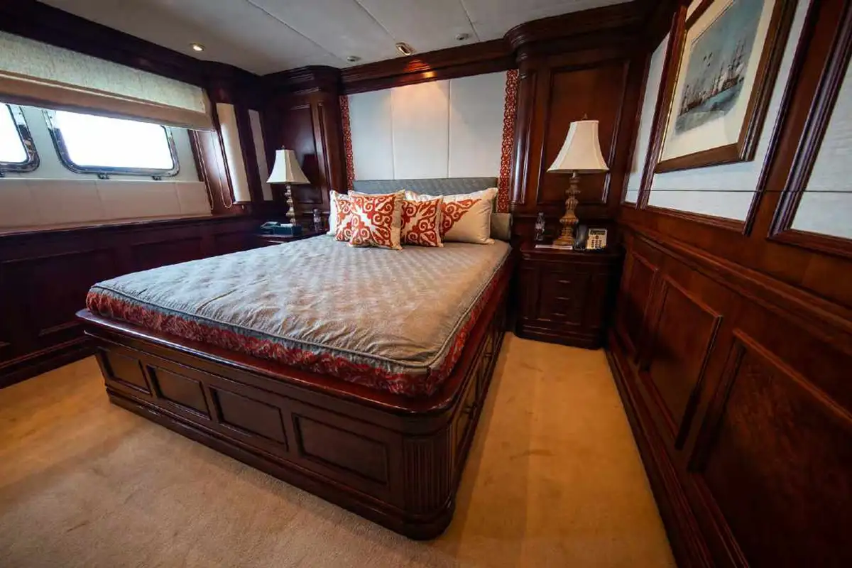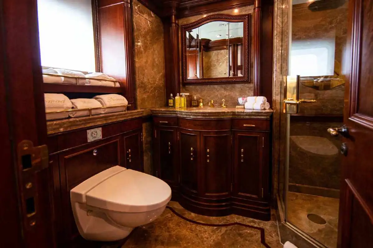 NOMAD's harmonious and classic interior offers generous reception areas decorated with intricate wood panelling and lavish antique furnishings. A secluded cinema has state of the art surround sound and projection systems and tiered seating on sumptuous sofas and chairs. She also has a spectacular observation lounge, large formal dining and lounge areas on both her main and upper decks. She accommodates up to 12 guests in six luxurious and well appointed cabins including a full width master cabin on the main deck with dressing area and library. Two VIP cabins are located on the lower deck amidships, and she has a further double cabin and two twin cabins with additional pullman berths.