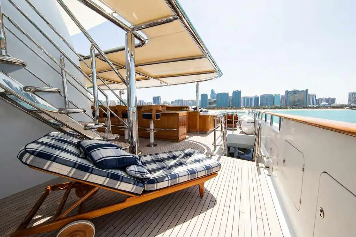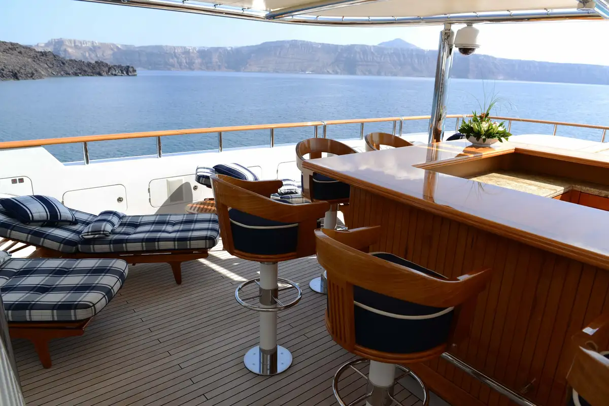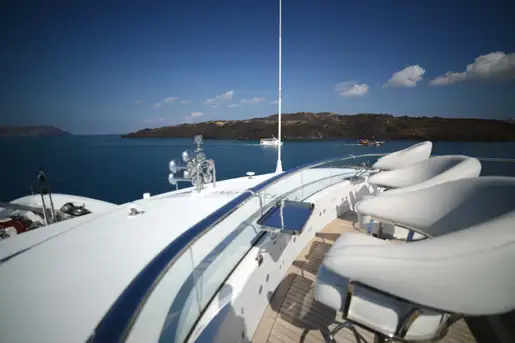 Beautifully designed for long range exploration and comfortable cruising, NOMAD is the perfect charter yacht for those looking to venture further afield. Built to the most exacting standards by Oceanfast, she has had significant refits during her time afloat but her new owners have wisely kept her stunning pool, which is one of the most impressive to be found on a yacht of her size. Situated on the sun deck, the pool features a swim up bar complete with bar stools in the water. The area is further enhanced by sun pads on each side of and a fantastic BBQ area. The upper deck has ample seating areas and a large dining table for up to 14 guests, while the main deck aft has several seating areas with coffee tables.
