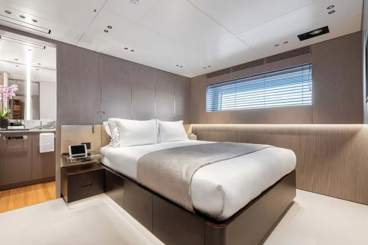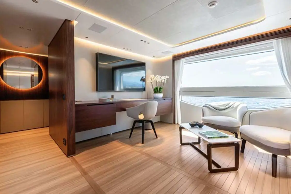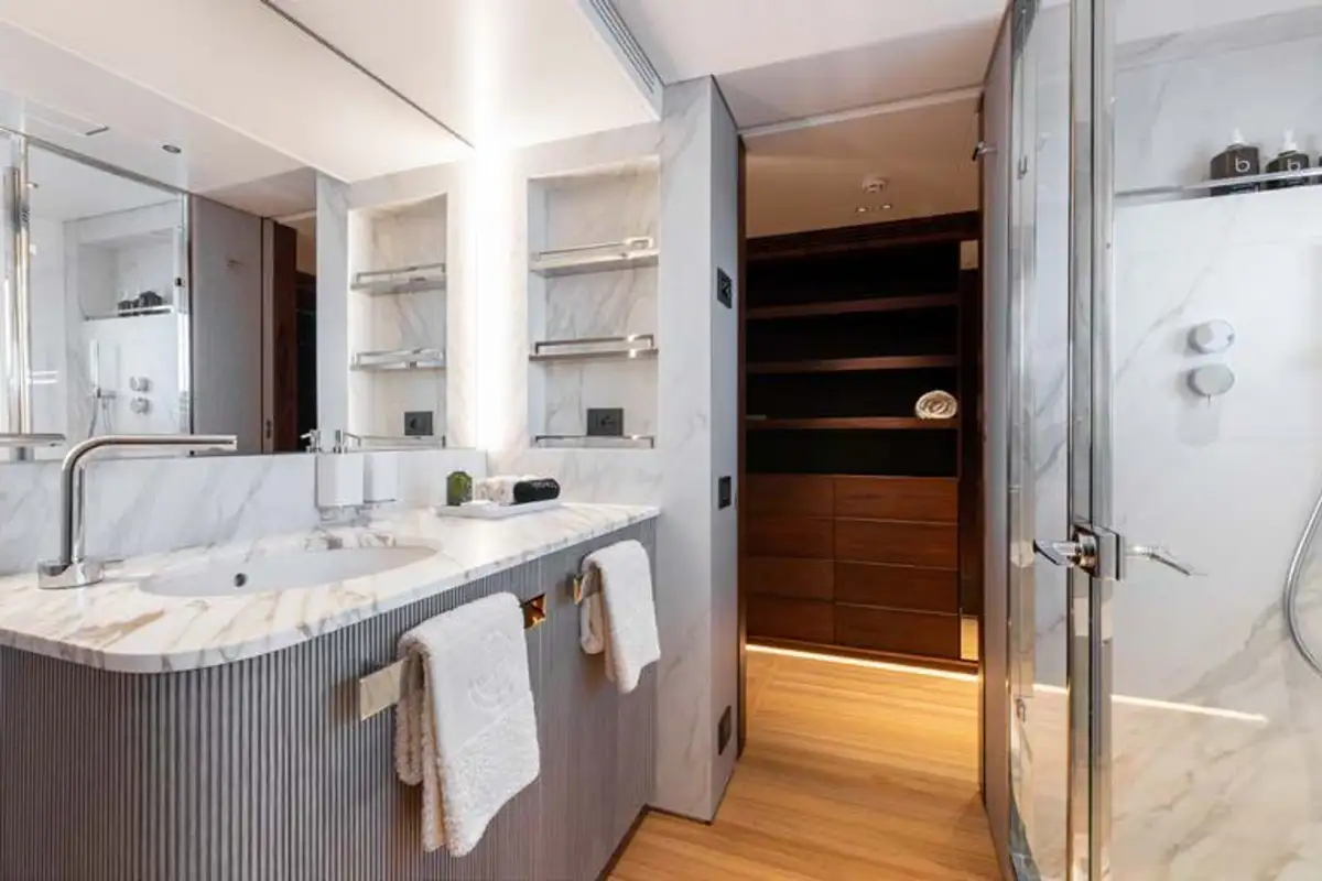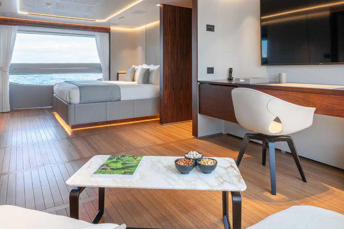 The master suite on the main deck is a harmonious haven dedicated to you. From the main lobby, there is access to a twin cabin that can be converted into a well-being suite or gym or used as a suite for children or staff. The full-beam master suite has a private lounge area to starboard and an aft-facing berth to port. On either side large windows present the full glory of the world outside. Forward you can revive in the his and hers bathrooms, each accessed via individual dressing rooms.