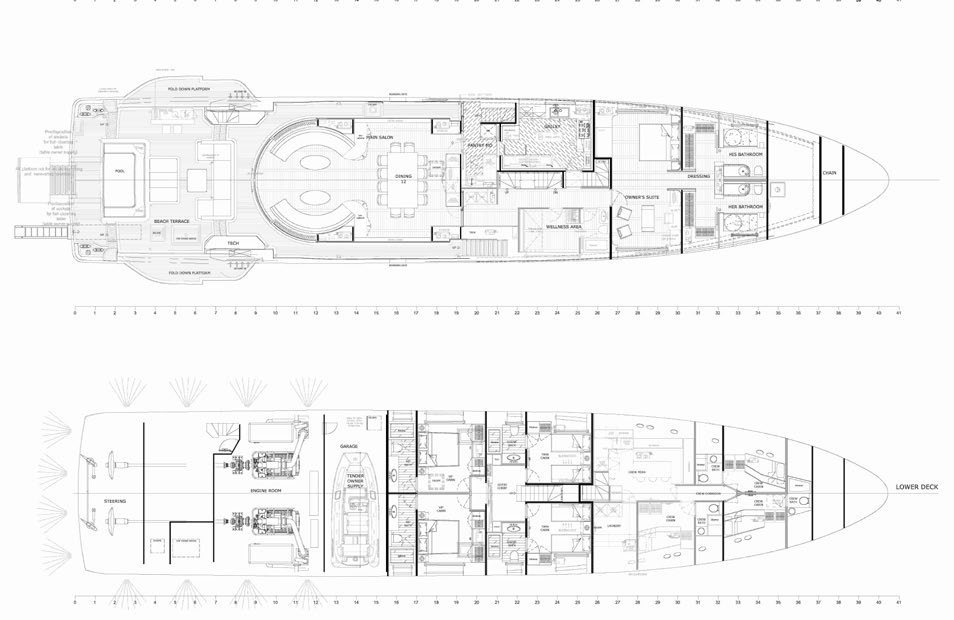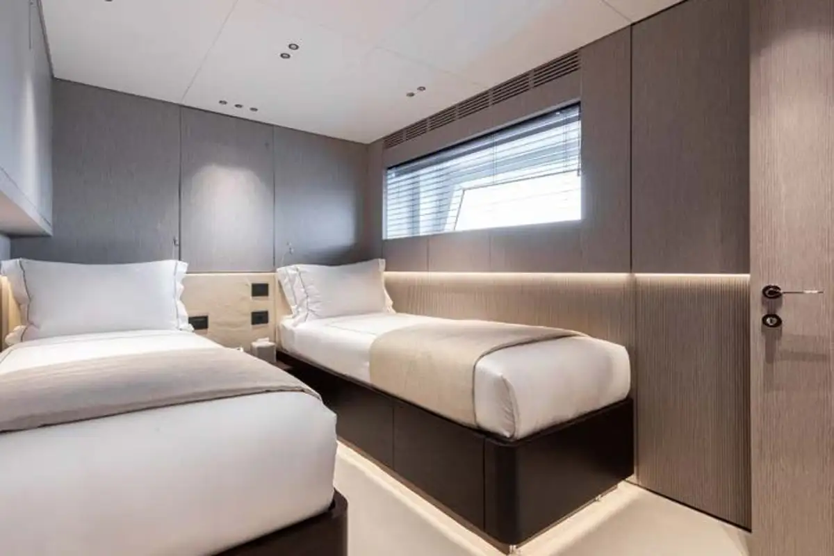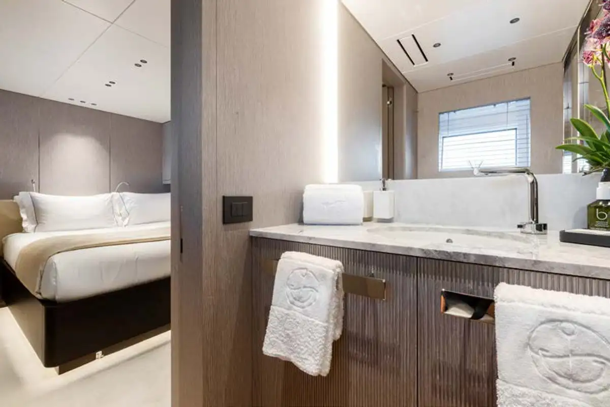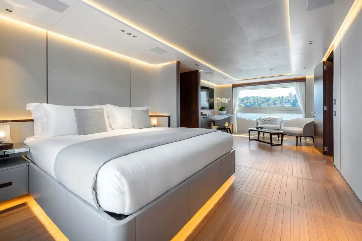 The master suite on the main deck is a harmonious haven dedicated to you. From the main lobby, there is access to a twin cabin that can be converted into a well-being suite or gym or used as a suite for children or staff. The full-beam master suite has a private lounge area to starboard and an aft-facing berth to port. On either side large windows present the full glory of the world outside. Forward you can revive in the his and hers bathrooms, each accessed via individual dressing rooms.