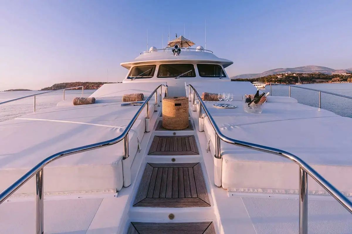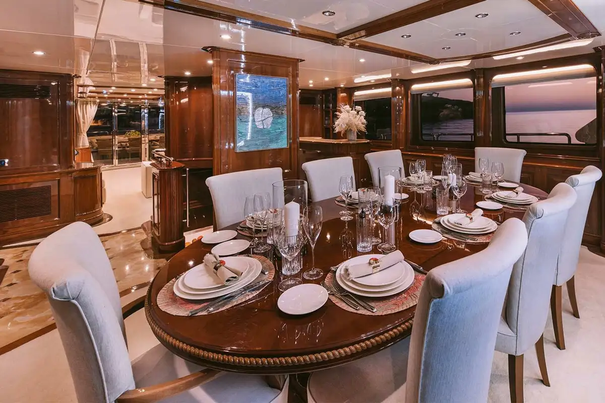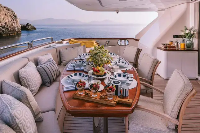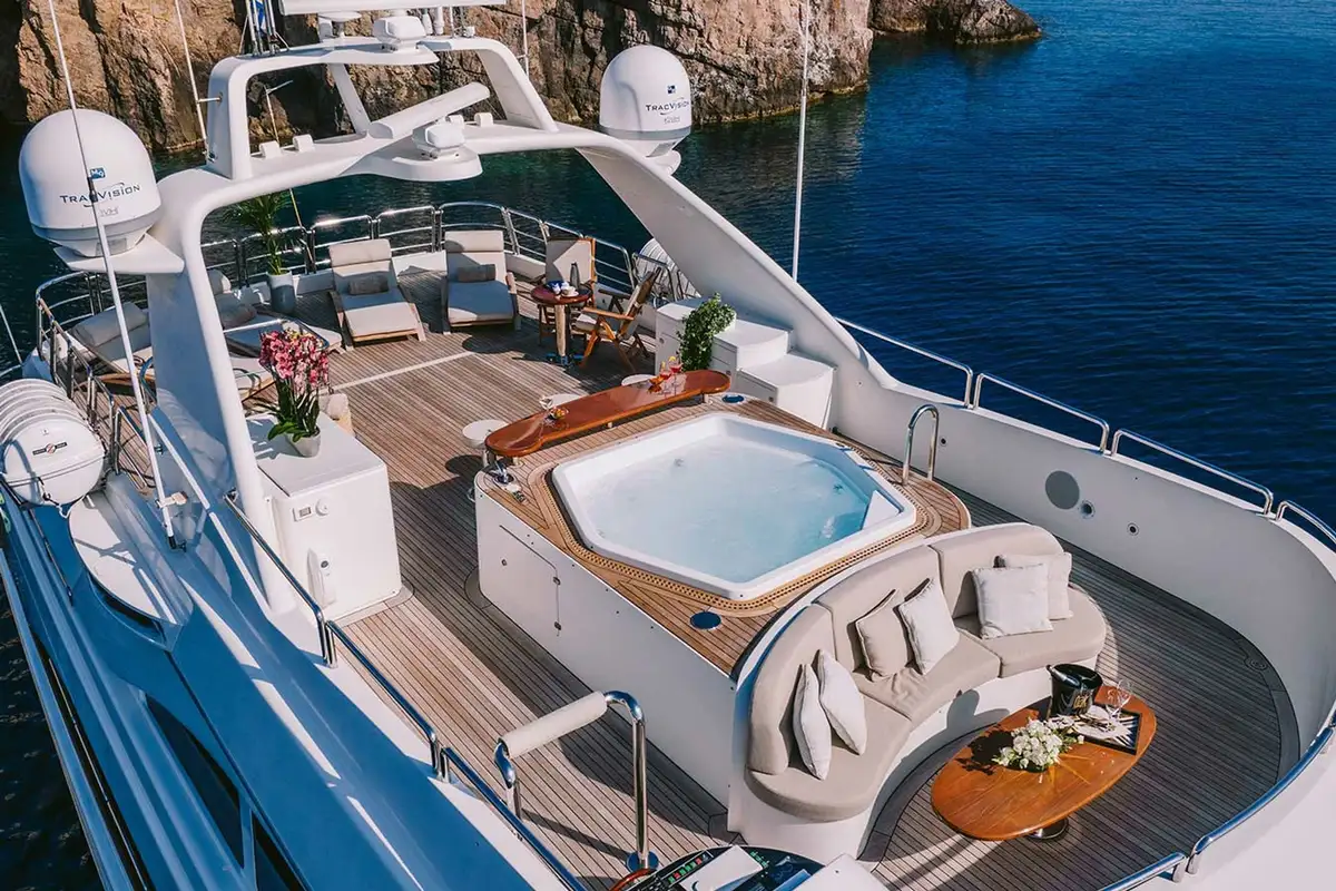Key features include a large, elevated jacuzzi pool on the sundeck, powerful active stabilisers to smooth her motion at anchor and at sea, the remarkable sense of space throughout her interior, a separate dining room and a wide range of watersports equipment.