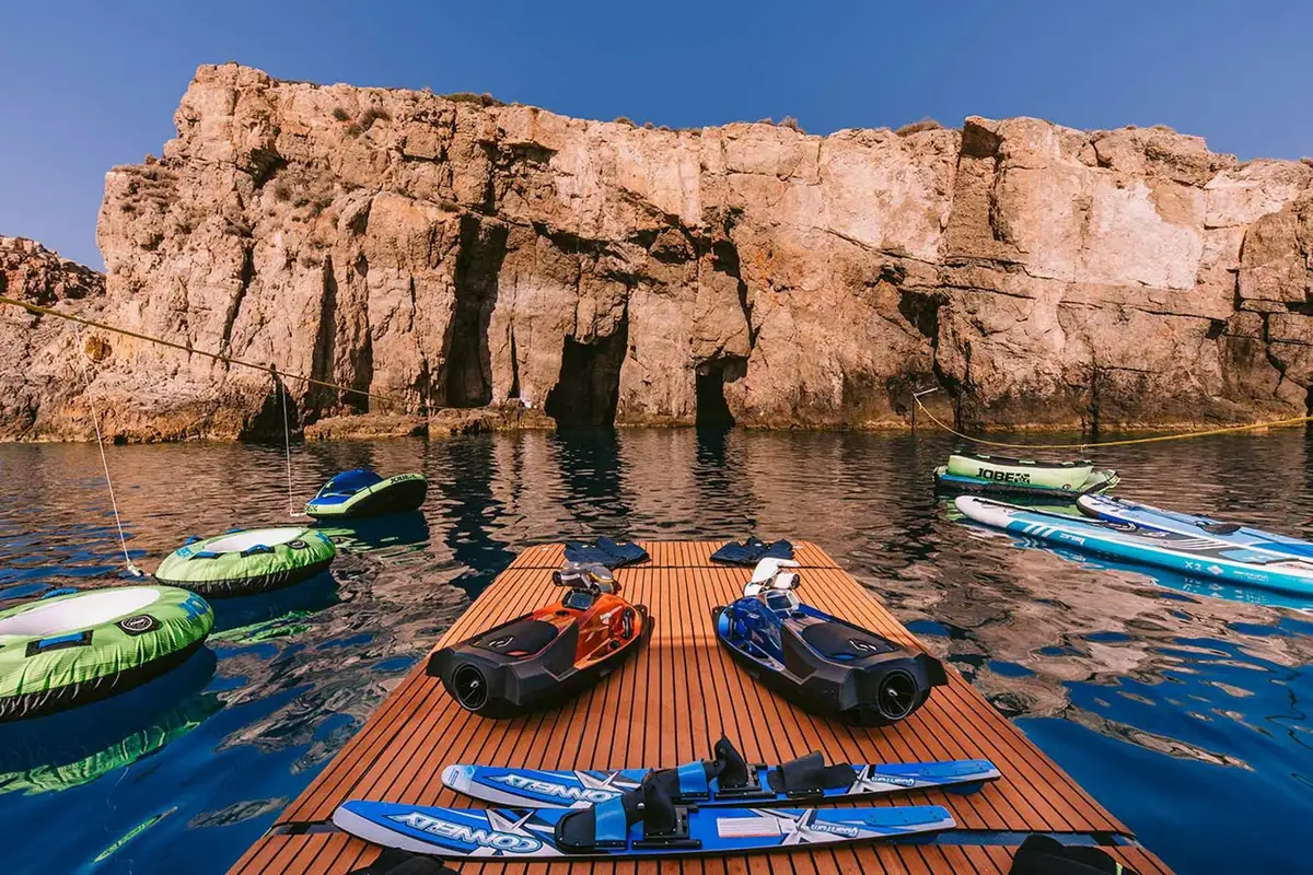 She carries four Sea Scooters, a Hydroflyer, towable tubes and sofa, waterskis in kids’ and adults’ sizes, a wakeboard, a mono ski, paddleboards and snorkelling gear.
