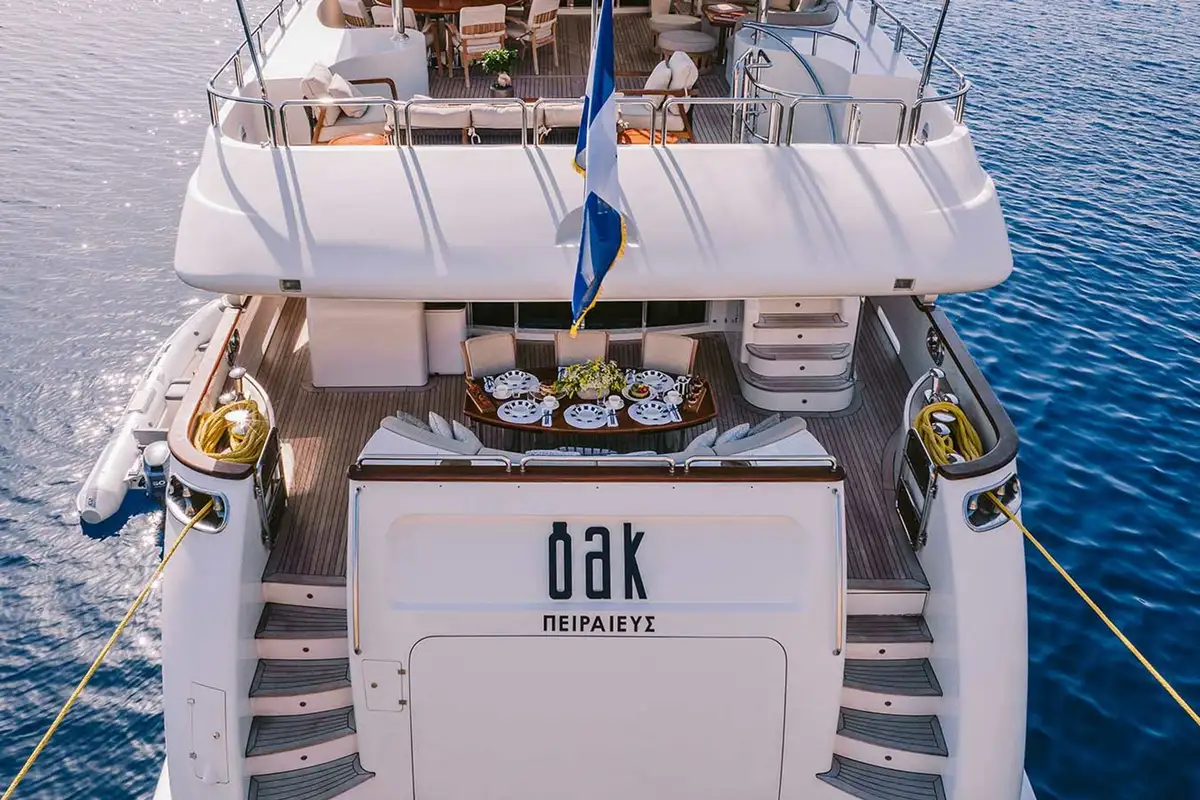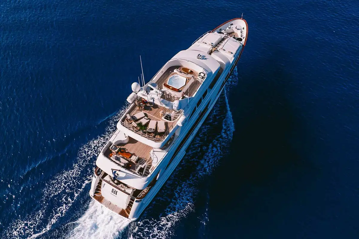 A classic 35m (114ft) Benetti tri-deck yacht with the distinctive look and glamour of her brand, OAK is well endowed with iconic yachting features and motifs that are sure to elicit approving nods from those in the know. Sweetly flowing lines, solid mahogany capping rails, sculpted mullions and a beautiful flare to her overhanging bow – she’s got it all.