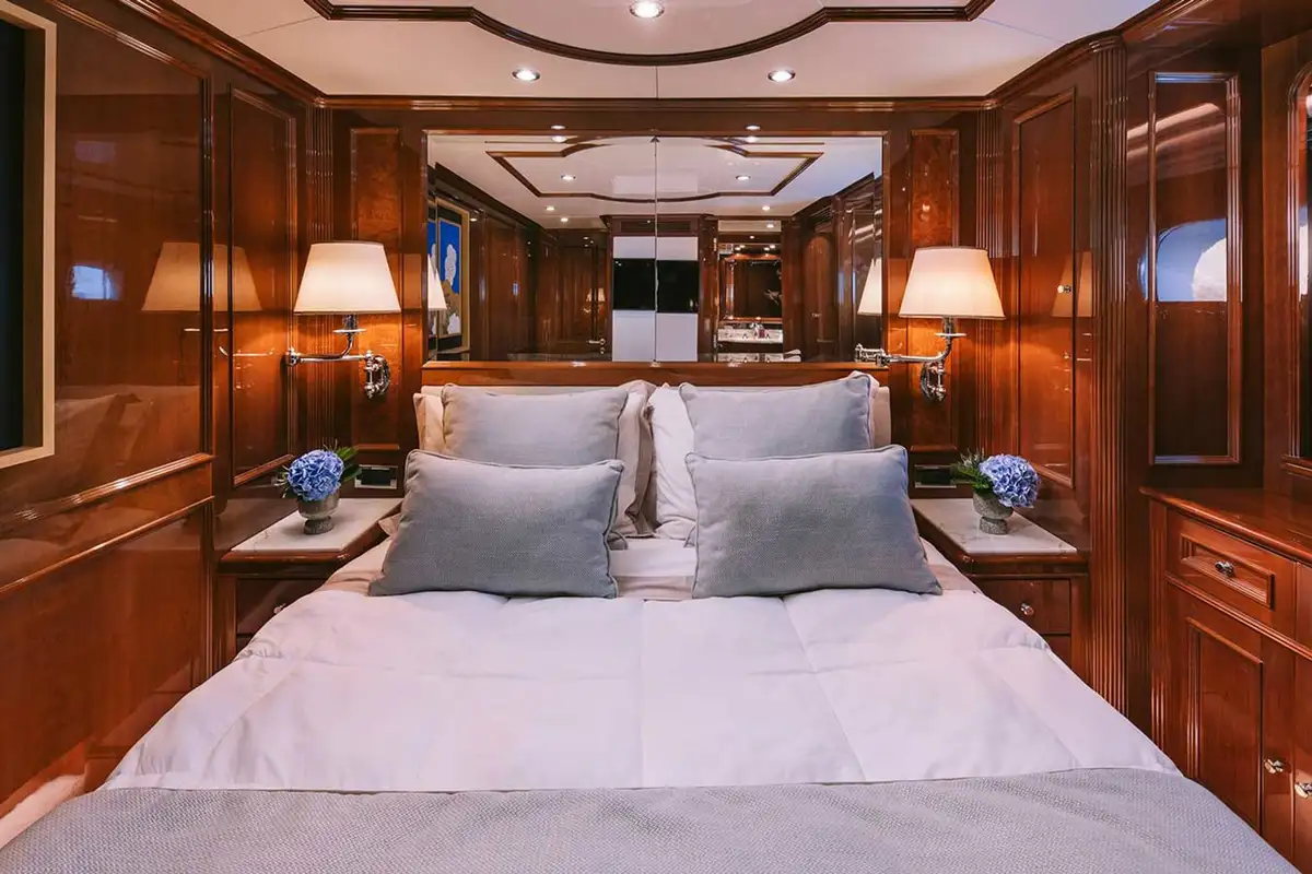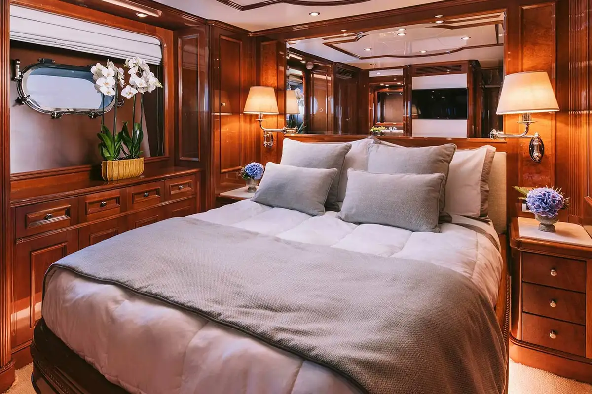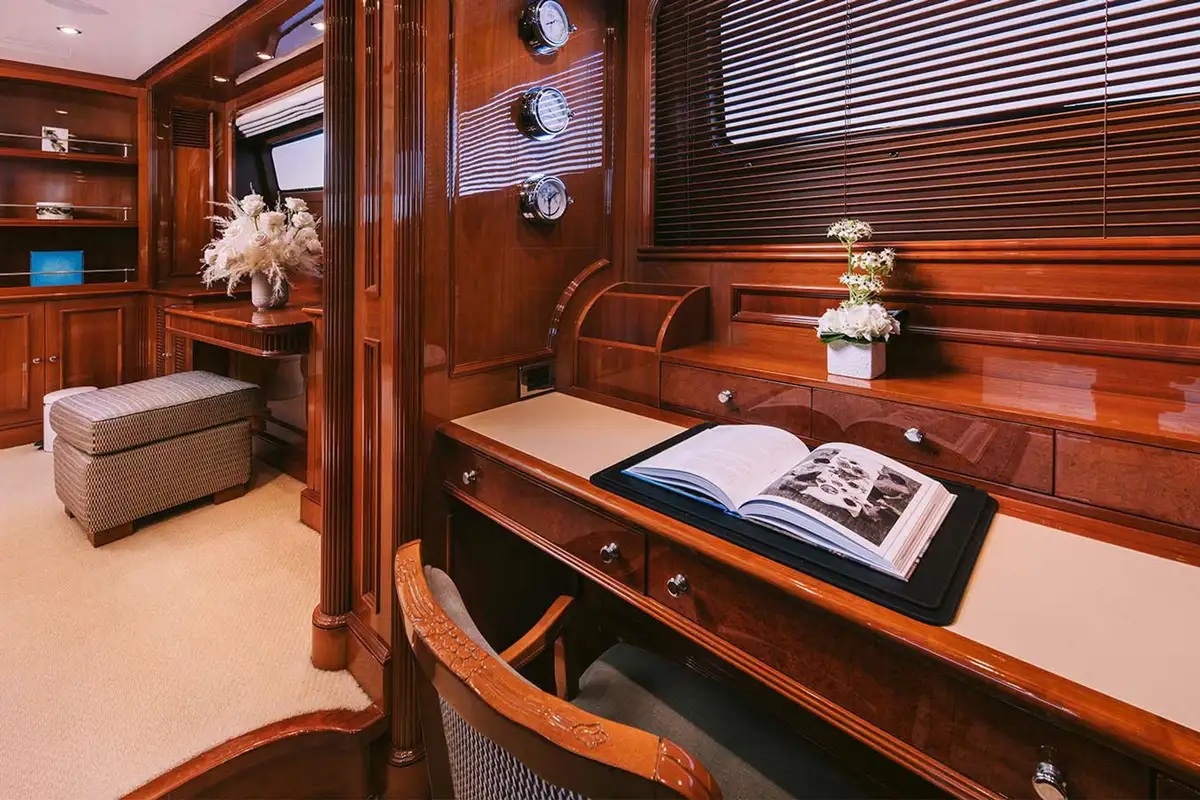 The master suite is up forward on the main deck with a traditional finish in beautiful high-gloss hardwoods, and includes a separate study. The same quality of fit-out continues throughout the lower deck cabins which are two doubles and two twins, one with an extra pullman bunk.