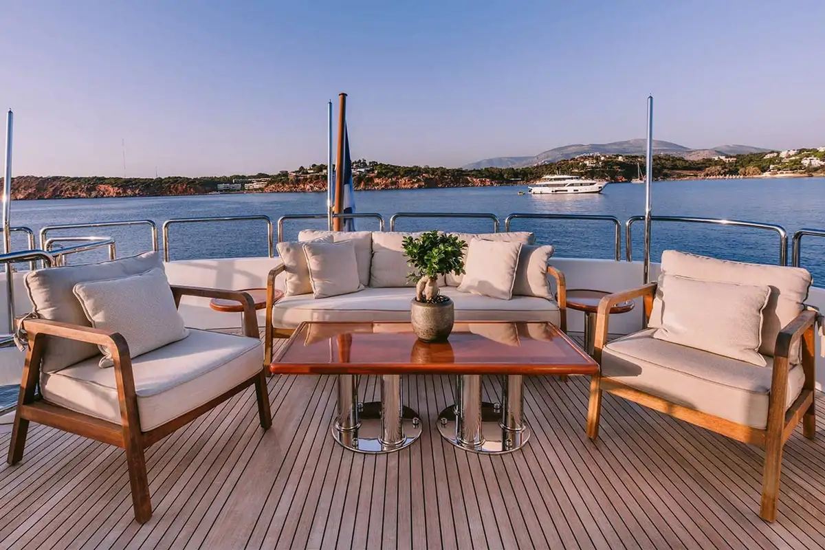 Her upper aft deck has three separate social areas – an oval dining table, a C-shape of sofas in shade, and a comfortable lounge astern in full sun with sweeping views. There’s also a comfortable lounge/dining area on her main deck aft, plus a sunbathing zone on the coachroof and another on the top deck, so guests have plenty of scope to spread out or gather together, with a variety of spaces available to suit any occasion or mood.