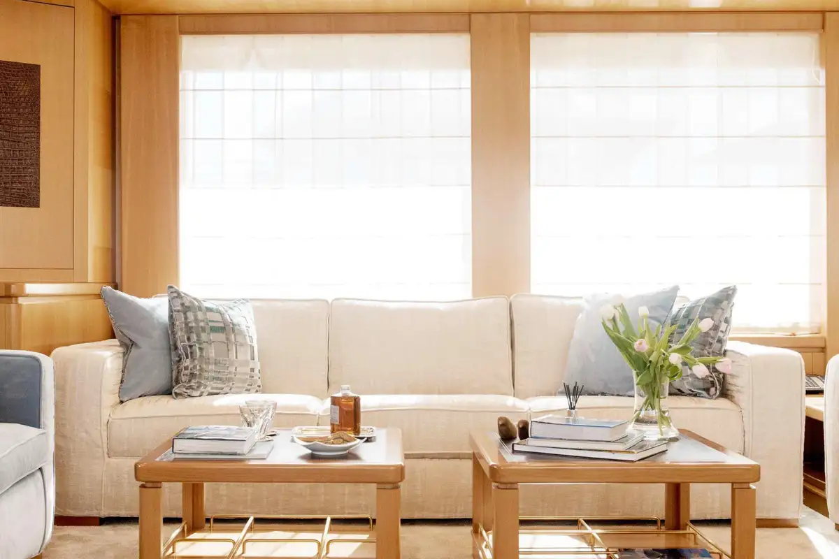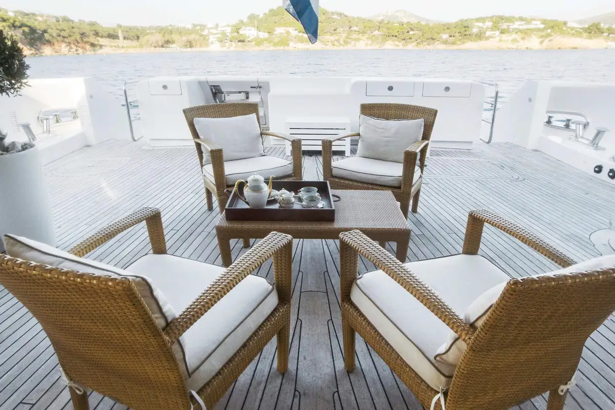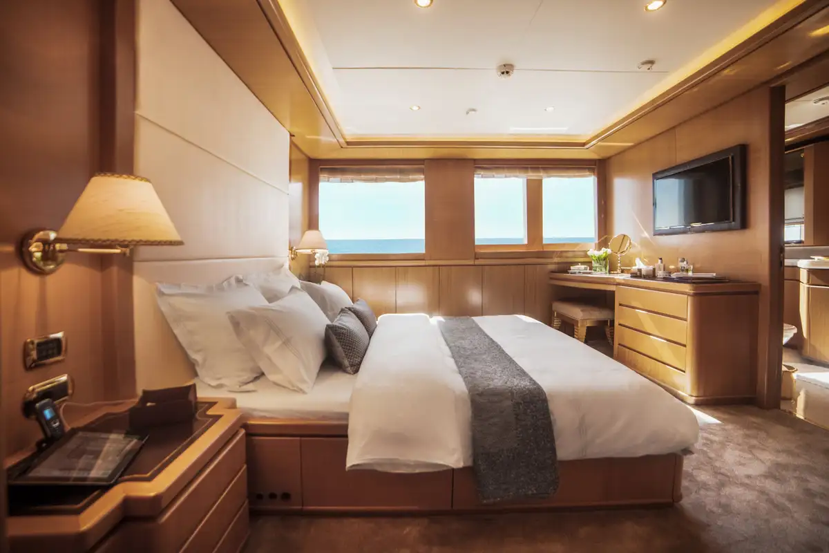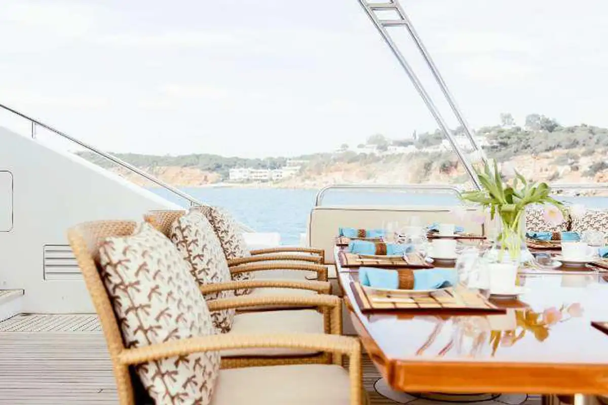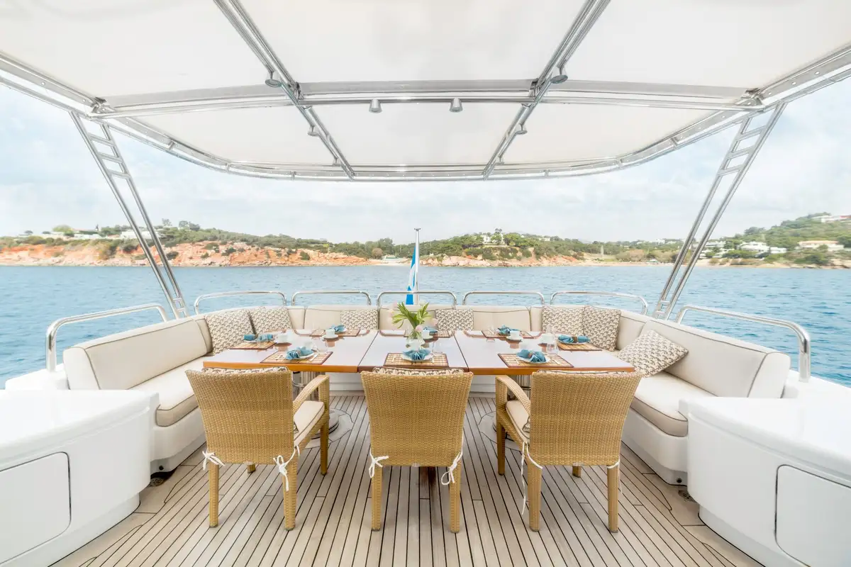 Morning sun caresses the wood panelling in your generous master cabin as you wake each morning. After luxuriating in your crisp white sheets, slip a kaftan over a swimsuit and you’re ready for an al fresco breakfast – served only a few steps away.