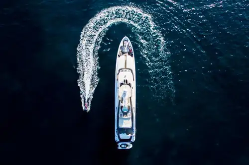 The beach club opens up on either side of the swimming platform astern to reveal a sea level terrace for your morning yoga ritual, or just to sit and hang out. Astern the watertoys are tethered to the wide swim platform, from here you can take out a paddleboard or jetski. A sturdy swimming ladder offers safe water access.
