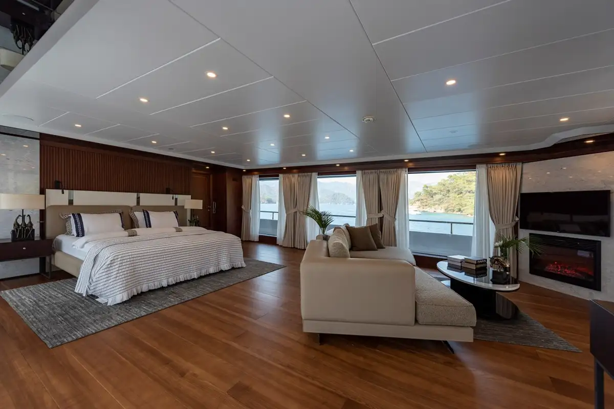 The upper deck master suite is just as inviting. Here, floor-to-ceiling windows line both sides, framing wide sea views. A second fireplace with a TV above creates a cosy spot to unwind at the end of the day. Direct access to the aft deck places you just steps away from al fresco dining and evening drinks with friends or family.