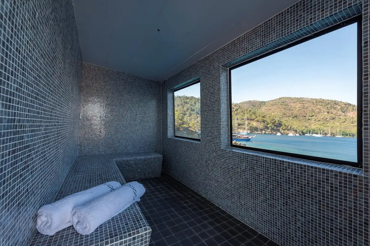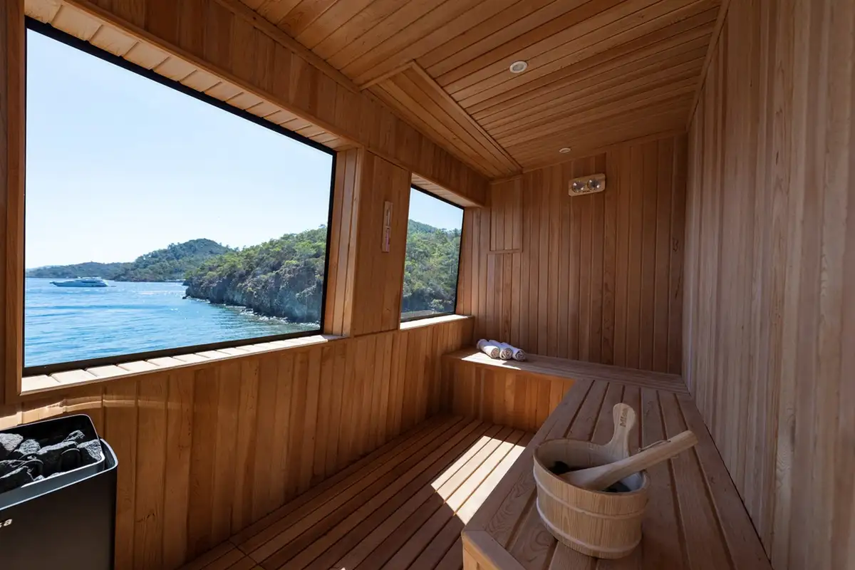 On deck, OCEAN BREEZE offers plenty of ways to relax and recharge. The 12sqm (129sqft) sundeck seawater pool has sun loungers and shaded seating close by. There’s also a hammam and sauna – each with elevated views – plus a treadmill and exercise equipment for those who prefer to start the day with a workout.