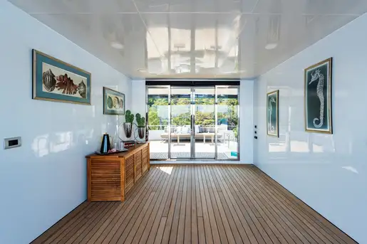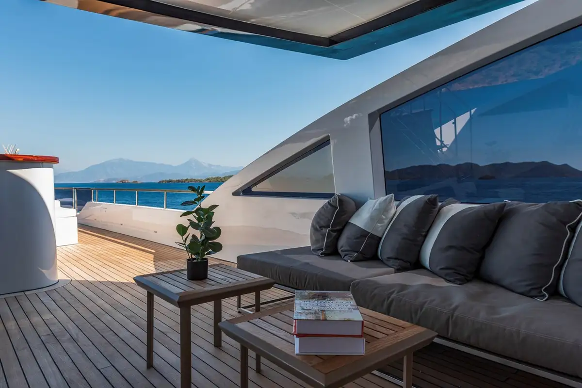 Down by the water, a shaded lounge opens onto the swim platform, protected by high bulwarks for added privacy. This is your gateway to the sea and the yacht’s collection of watersports equipment, including two SeaBobs, a jetski, and inflatable tow toys. Whether you’re exploring quiet bays or simply drifting with the current, the choice is always yours.