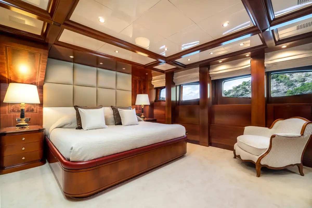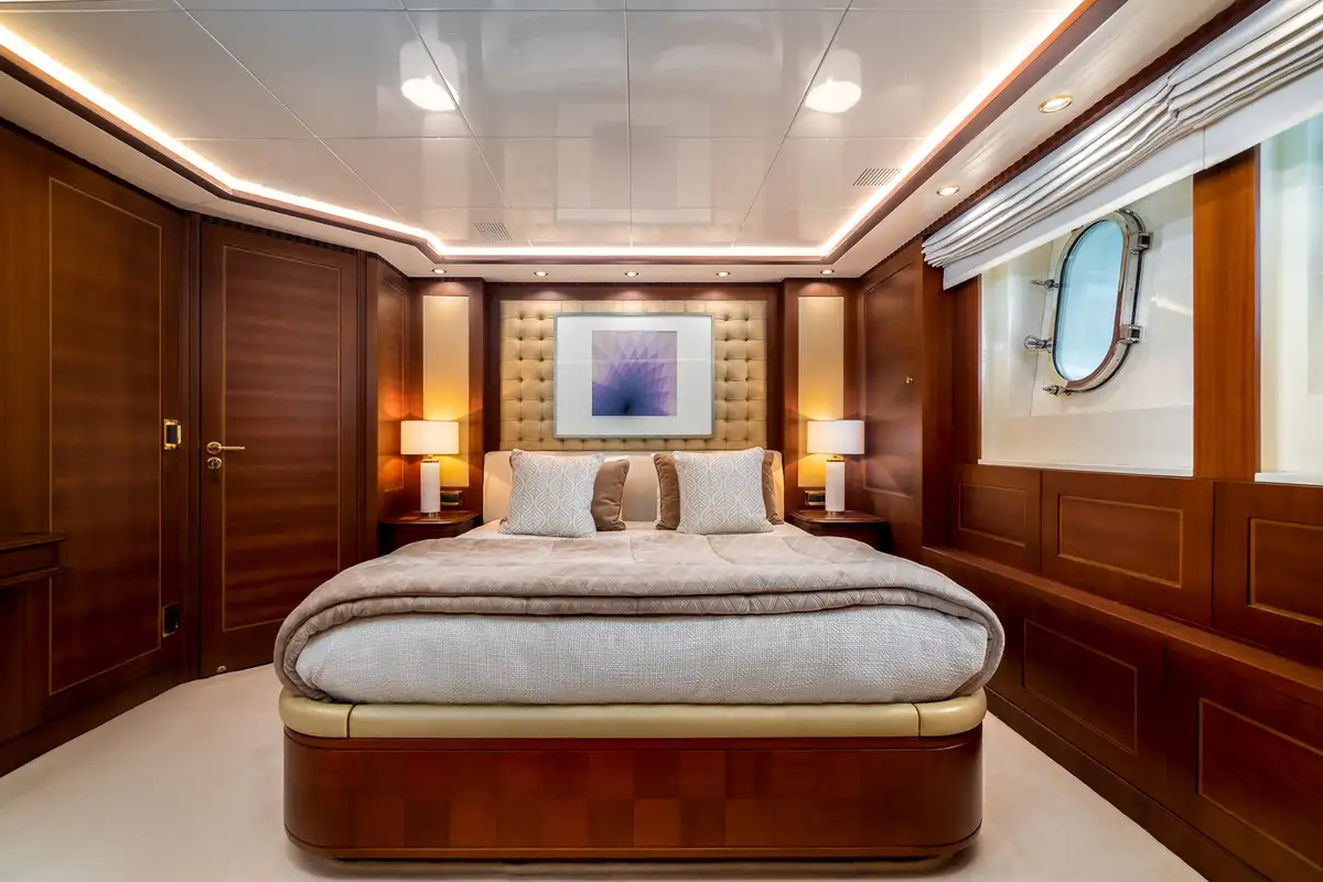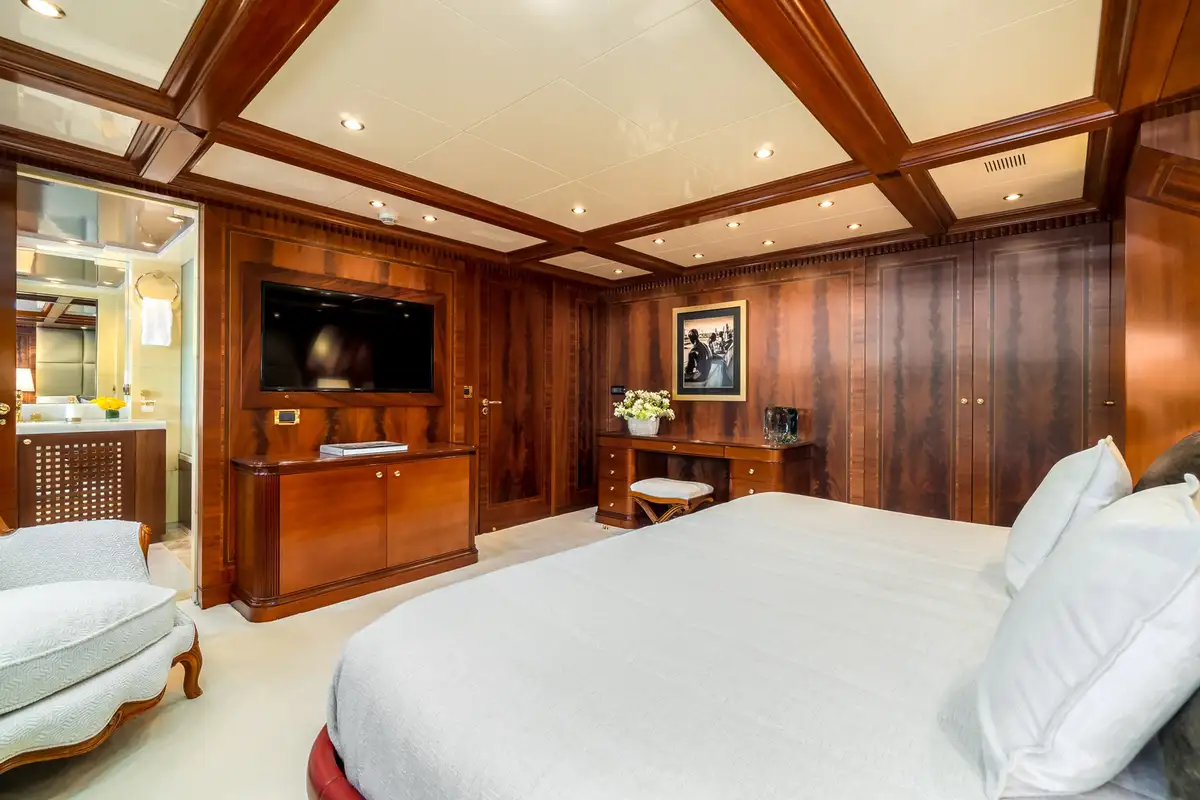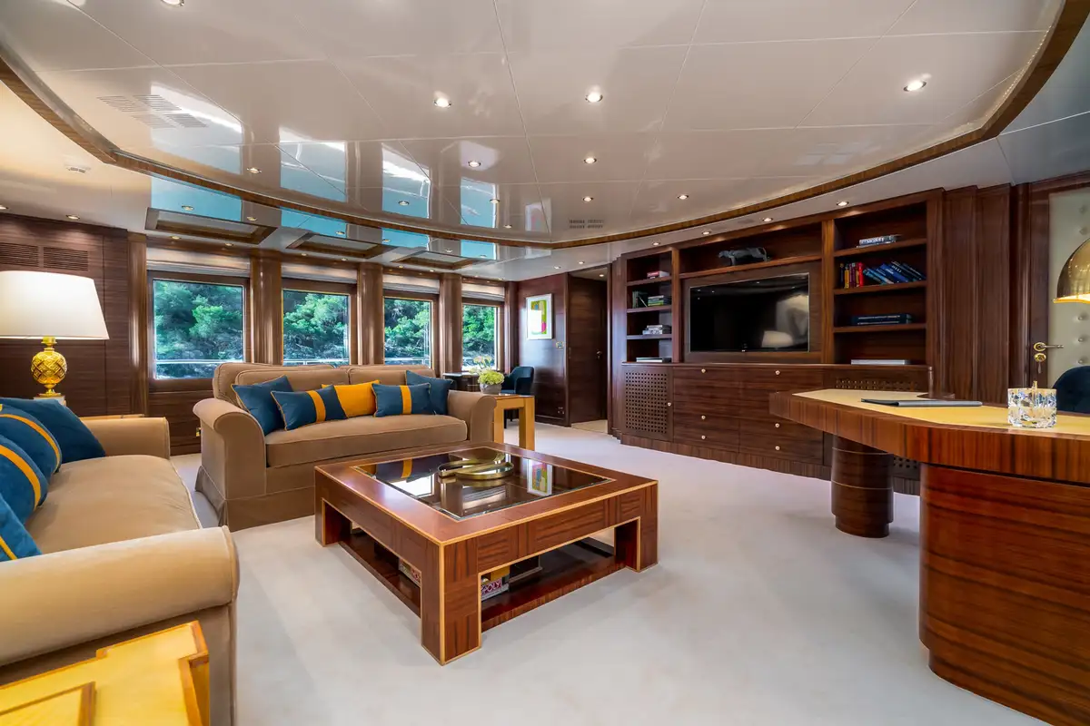 While the captain guides your yacht into a new port, take some time to enjoy the spacious cabins as you dress for the party. The gloss woodwork and velvet sofas create a timeless interior, and each cabin has a TV with home-theatre system.