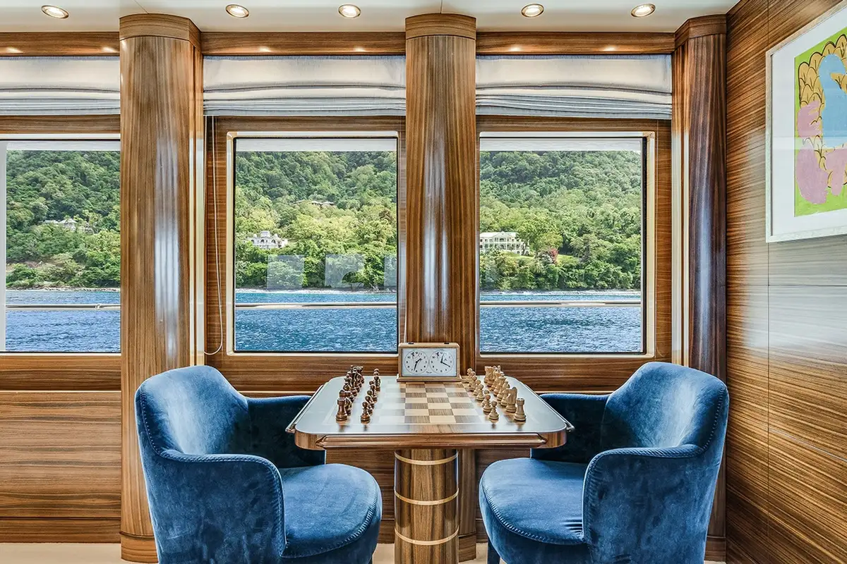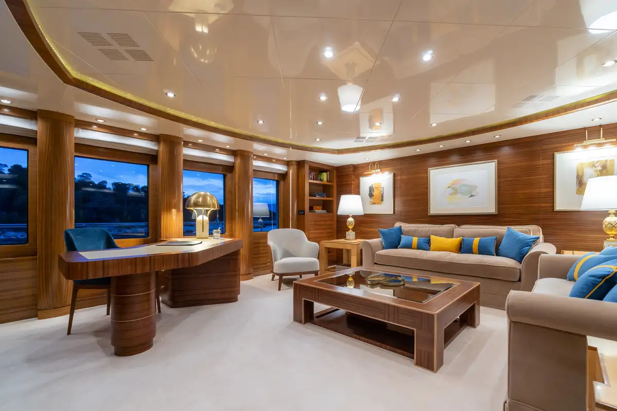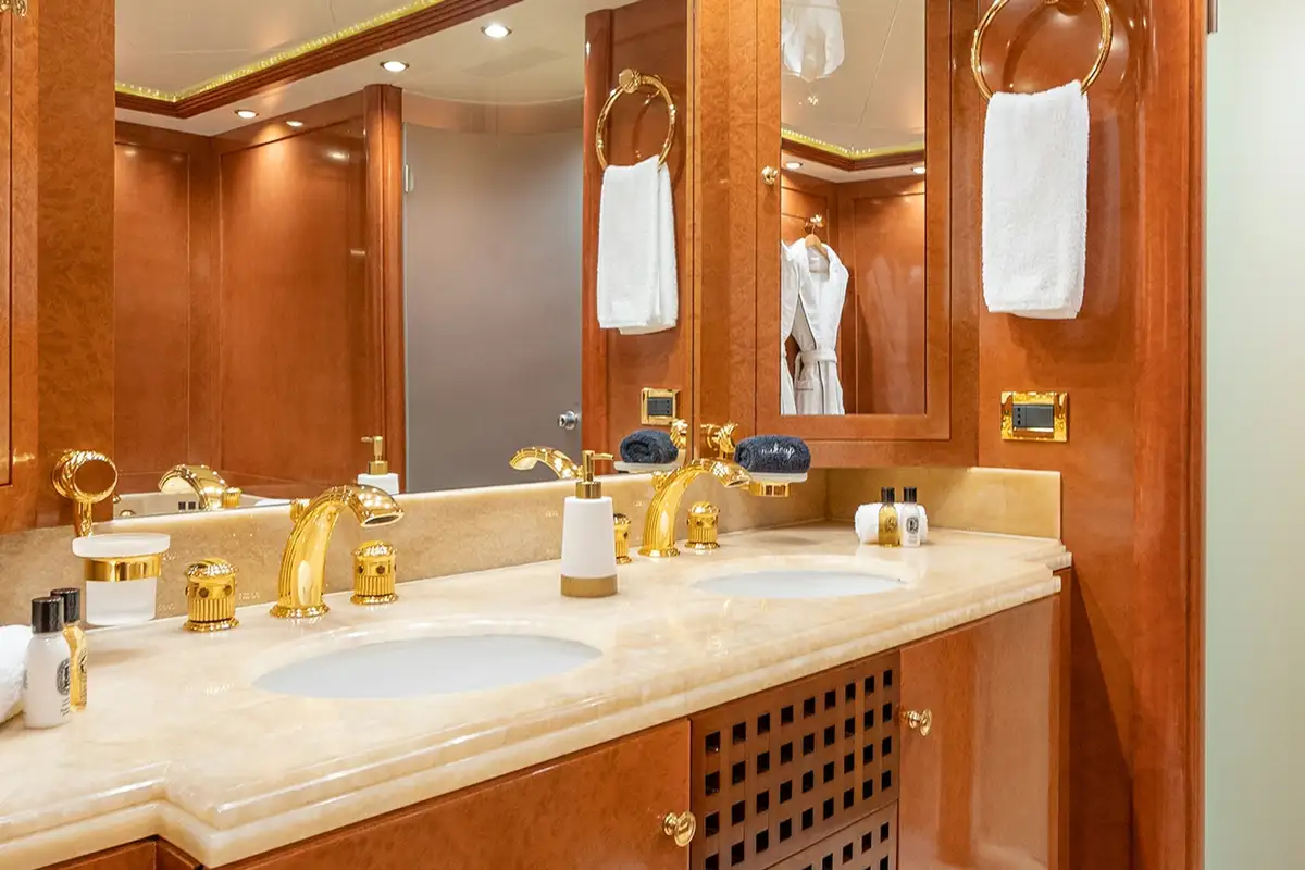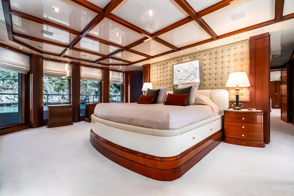 While the captain guides your yacht into a new port, take some time to enjoy the spacious cabins as you dress for the party. The gloss woodwork and velvet sofas create a timeless interior, and each cabin has a TV with home-theatre system.