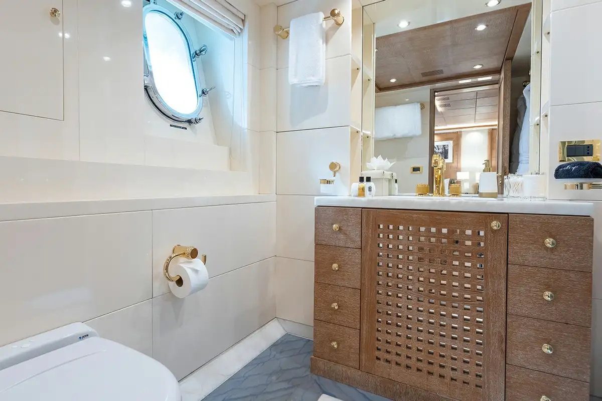High on the upper deck, your master suite includes a teak decked terrace aft, bedroom and TV lounge for your private use. So you will wake each morning to views of the coast and the bright waters sparkling through your windows. The air scented by thyme and pine gently reaches you as you step out for breakfast.