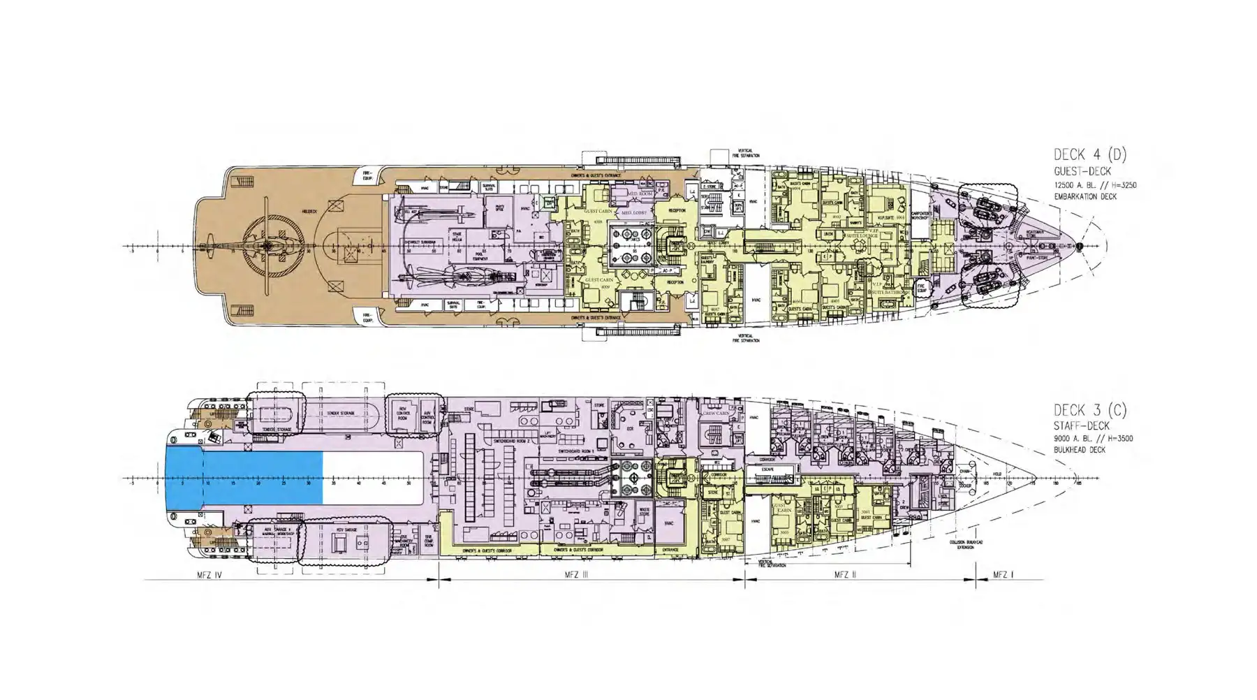 On the bridge deck below, guests have plenty of room for outdoor entertainment as a pool is located aft along with al fresco dining, a bar and pizza oven. Just beneath the bridge deck is a deck dedicated to entertainment where guests can enjoy a range of facilities including a spa, library and bar, cinema, gym, multiple lounges including a forward-facing observation area and a basketball court on the deck below.