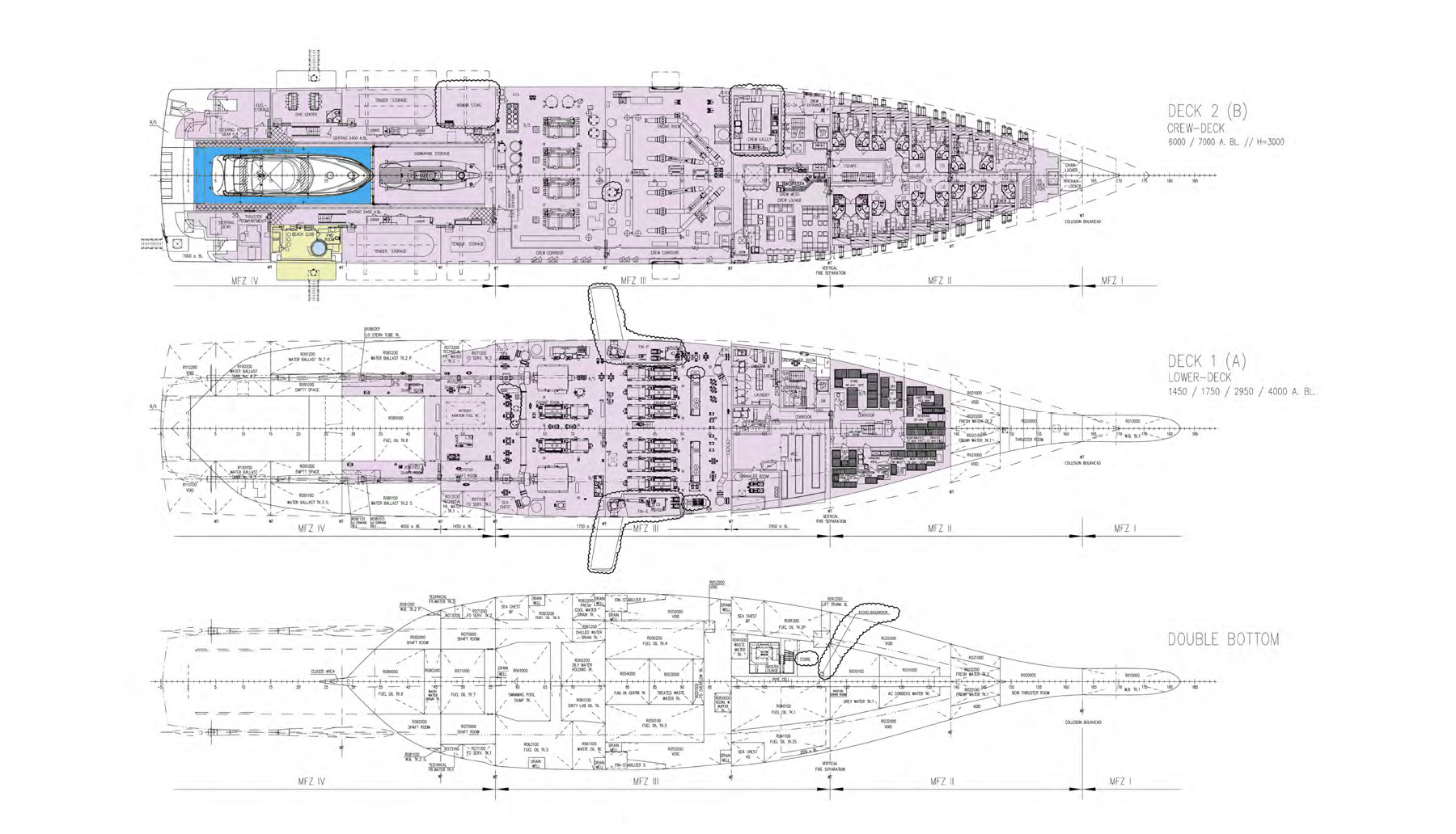 In addition to seven tenders, two life rafts, and an ROV, OCTOPUS is capable of housing an SUV and two helicopters in the garage, and her stern-access dock is home to a Pagoo, a submarine accommodating eight guests and two crew that can dive for up to eight hours. A dive centre and hyperbaric chamber are also on board, along with a beach club with bar.