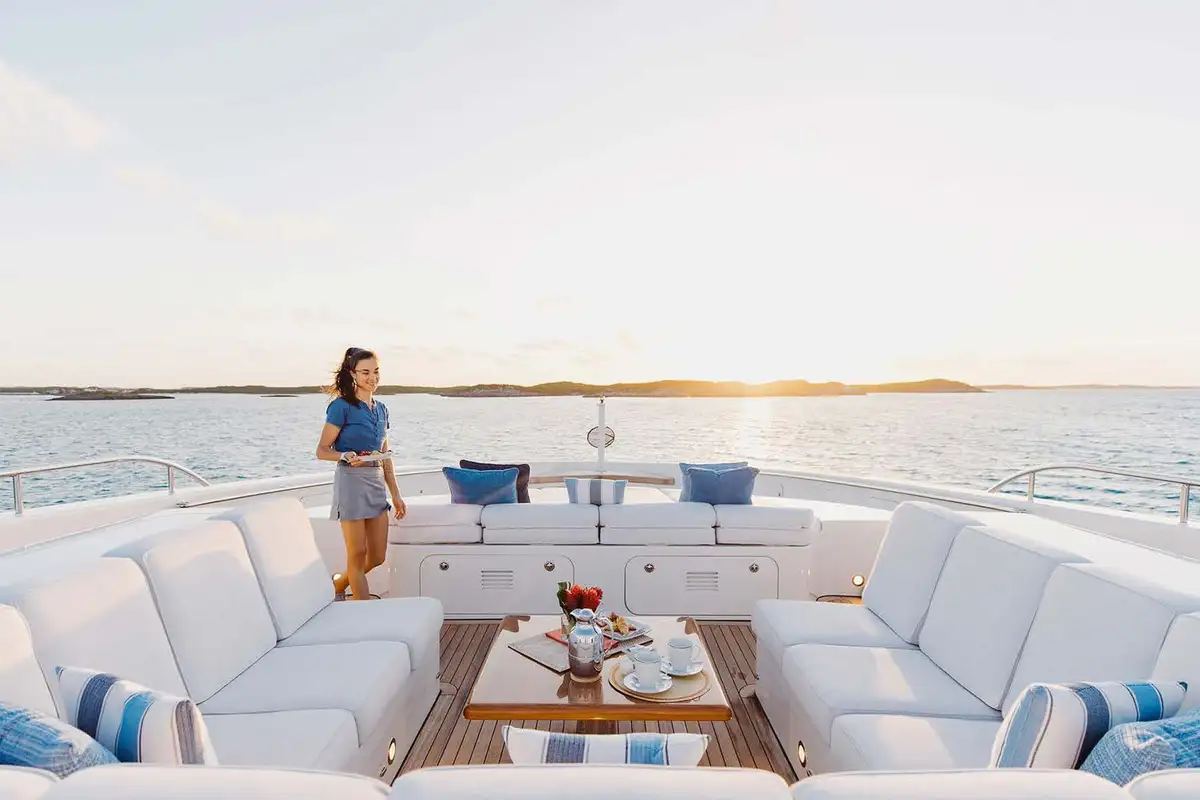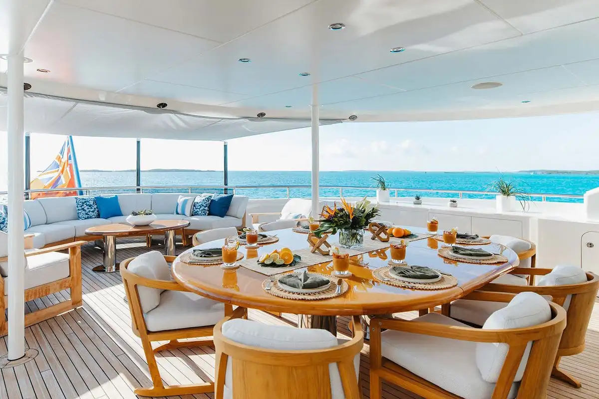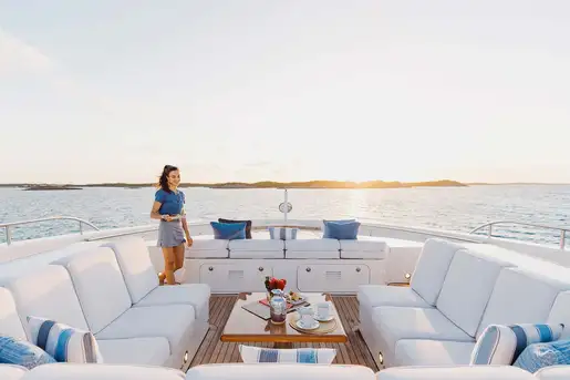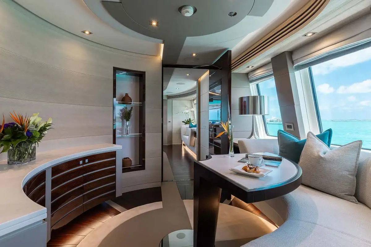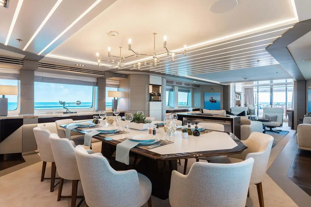 There’s roomy, comfortable seating for the whole charter party around solid teak tables on the main aft deck – a perfect place for a leisurely brunch to start the day. The bright main lounge has a smart, sociable and spacious lounge with great views out through big picture windows, and an elegant yet comfortable fine dining space at the forward end of the room.