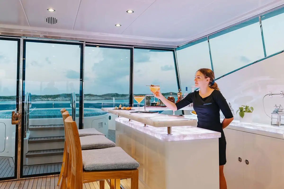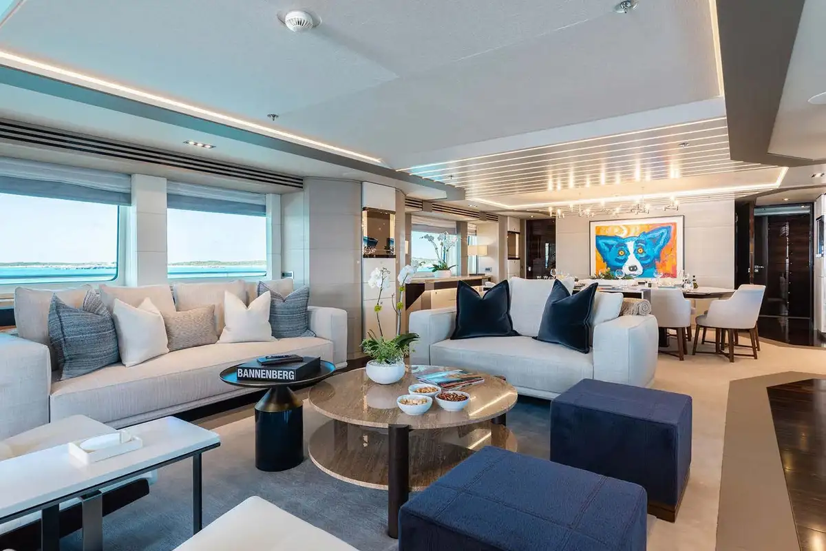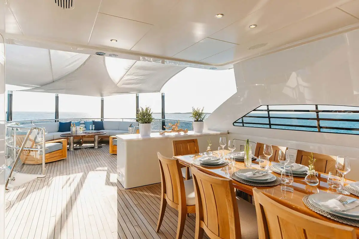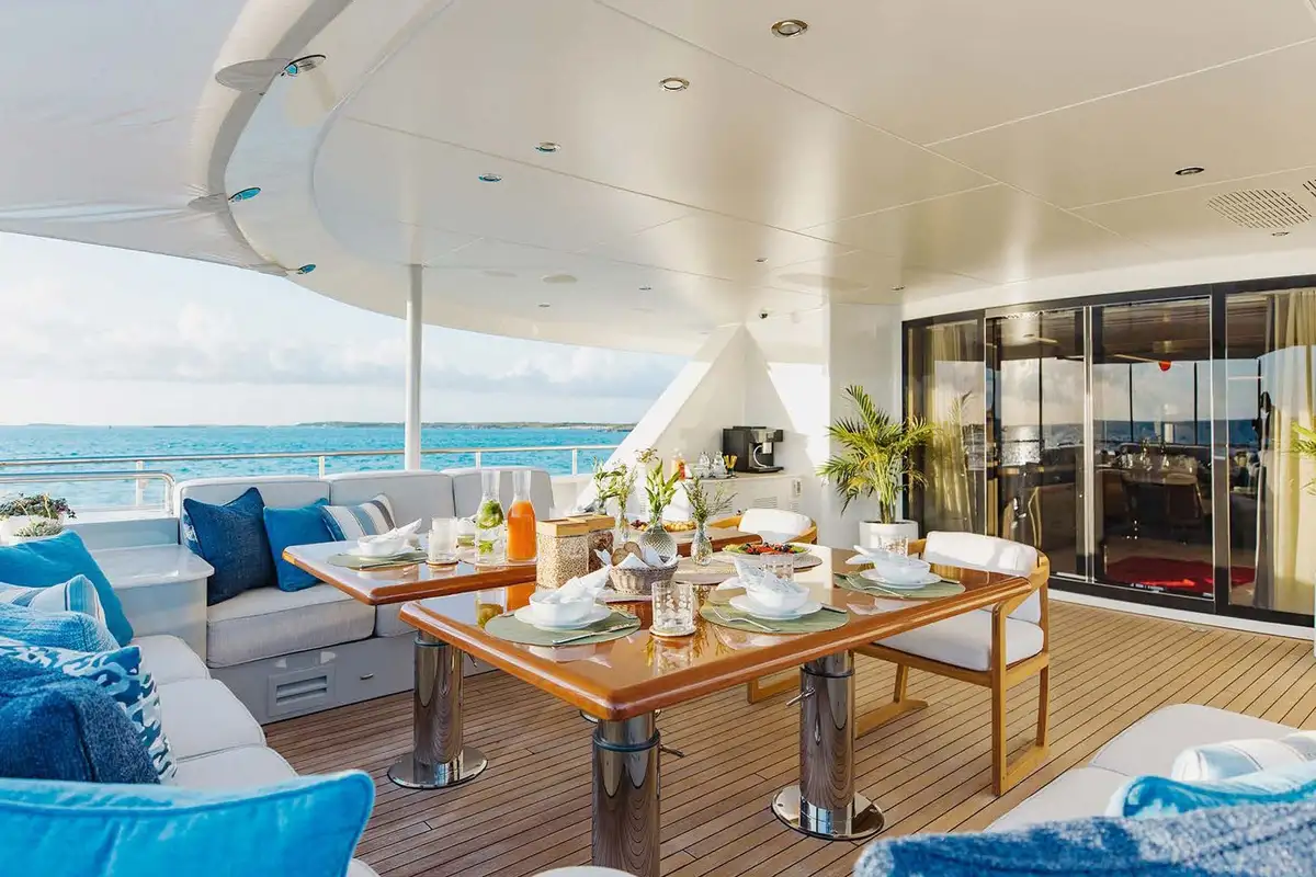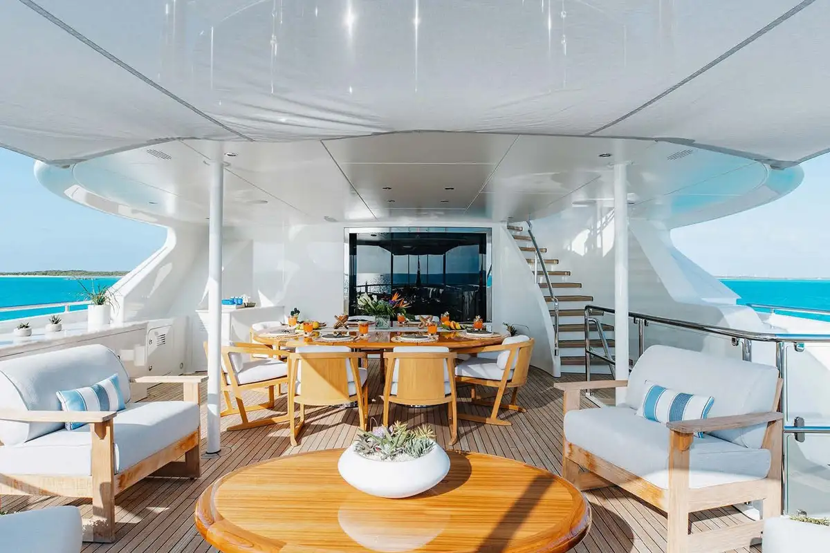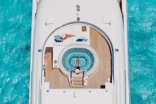 Her stand-out features include a large, sociable open-air seating and sunbathing space on the foredeck as well as a good-sized beach club in the stern and sun deck on top. The sun deck has an enclosed lounge amidships with a dining room and bar, as well as a jacuzzi tub up front in full sun, and a large open-air living space astern. The entire sun deck can be fully shaded with awnings when required.
