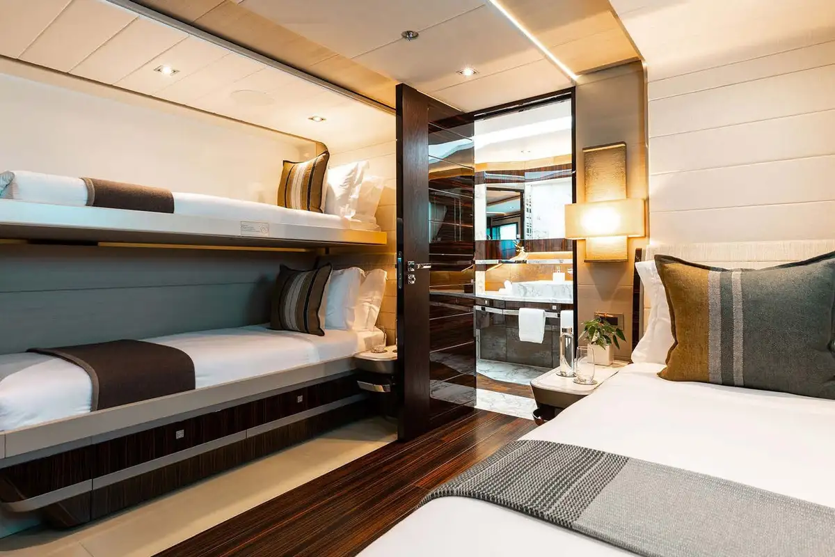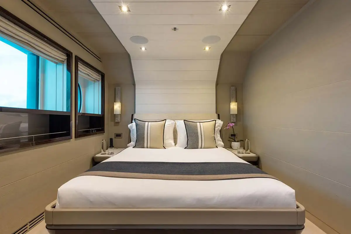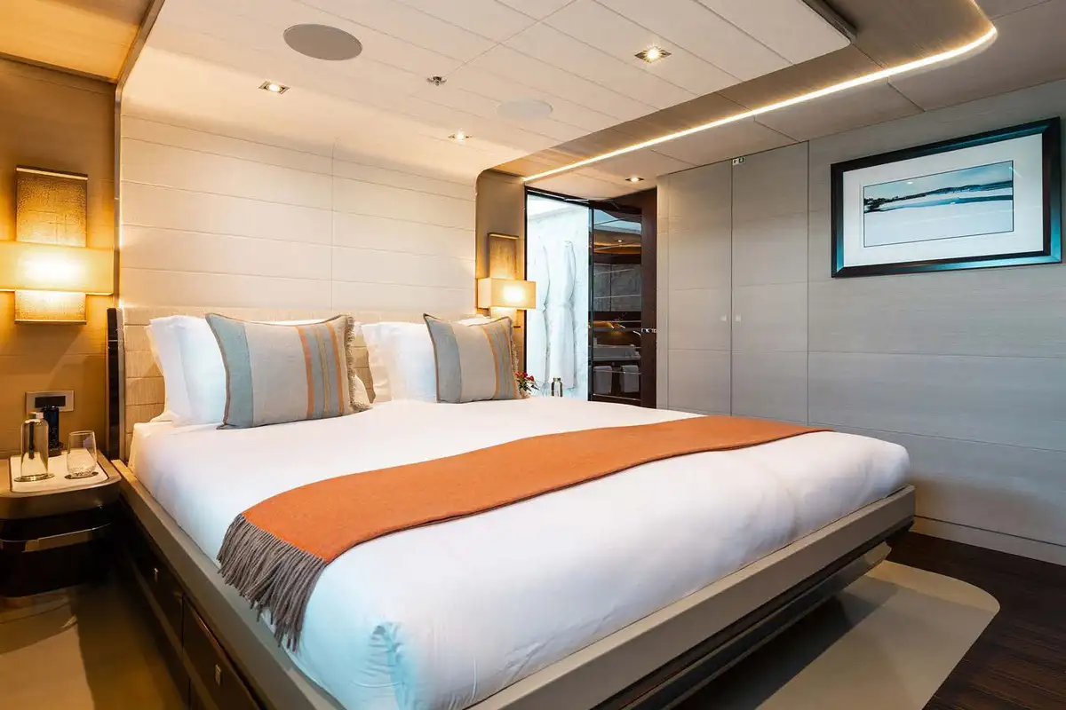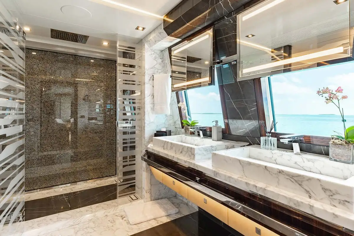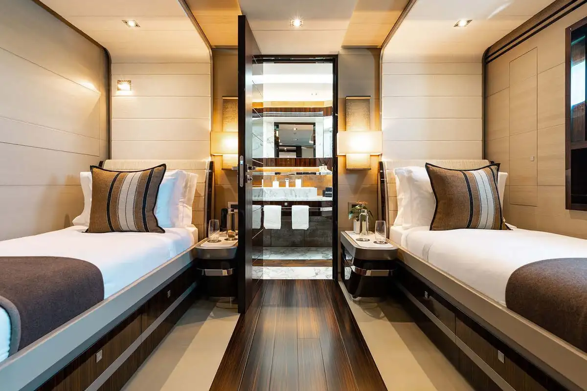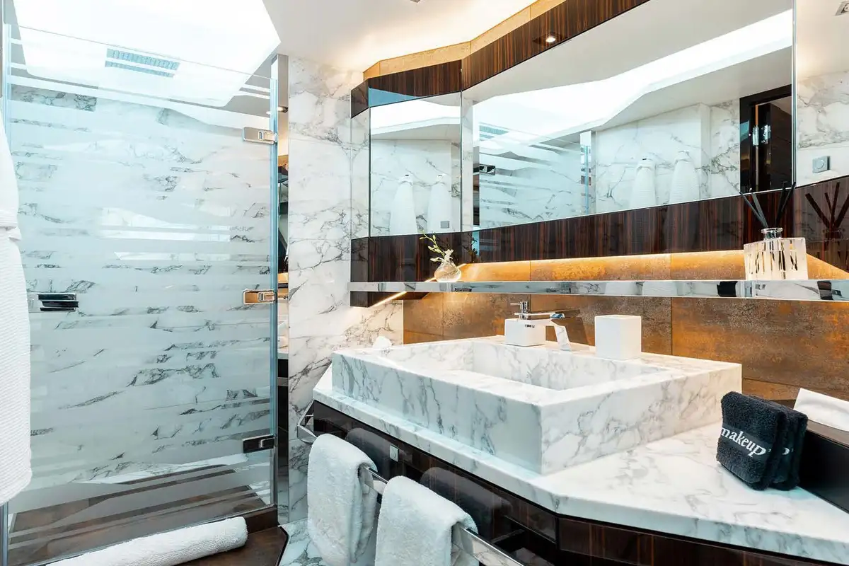 The master suite is on the upper deck, facing aft, with far reaching views and glass doors leading onto a private outdoor deck with its own dining, lounge and sunbathing areas. The master cabin itself is stylish and beautifully finished with a marble bathroom en suite plus a private lounge. The same contemporary style extends into the other guest cabins on board, which include three more doubles and two twin-berth cabins.