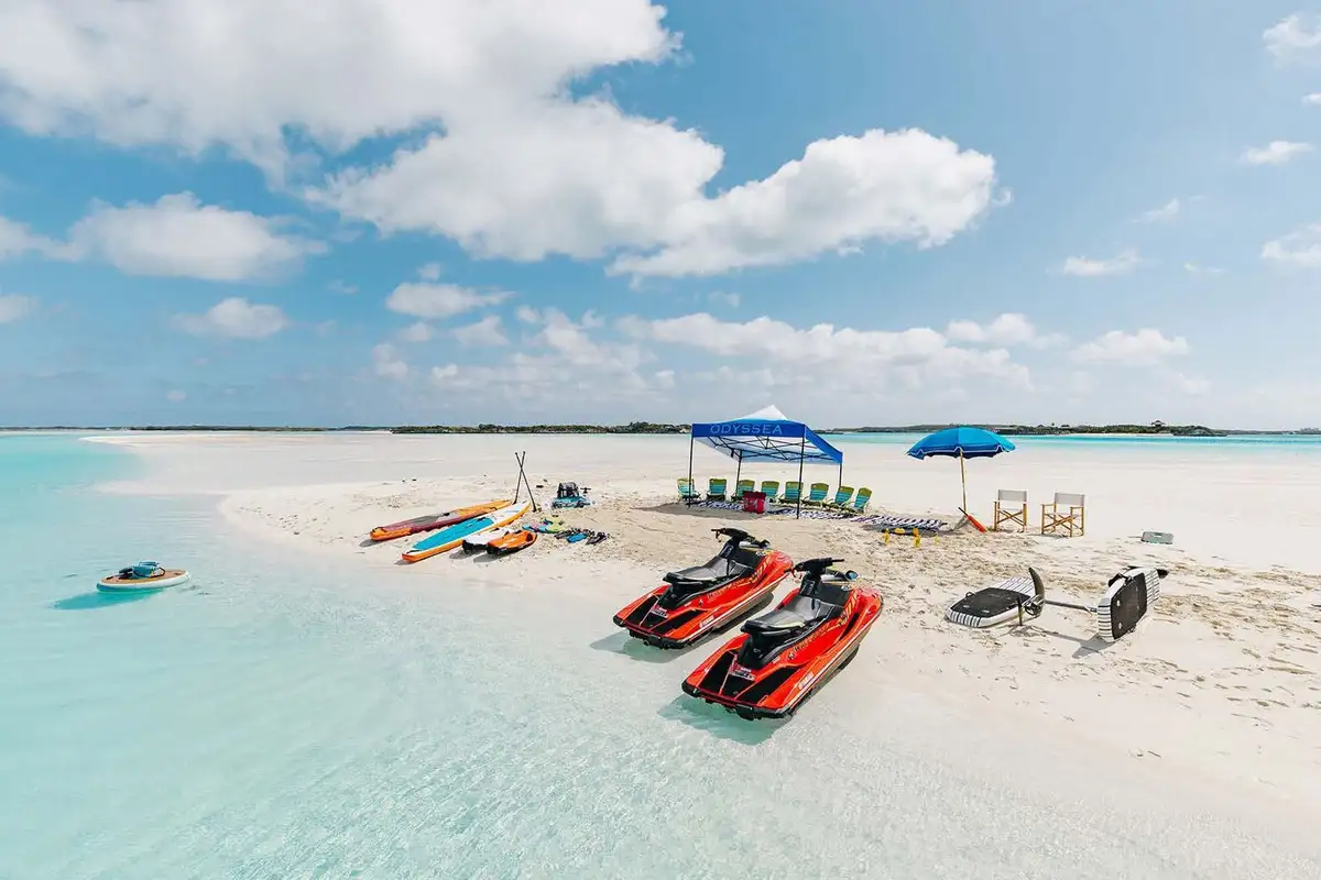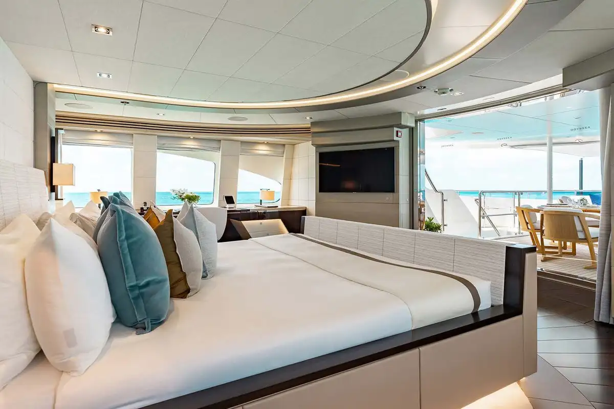 ODYSSEA is very well equipped with tenders and watersports gear. There’s a 37ft (11m) power cat tender with amazing 1,400hp performance, plus a vast array of towable toys – including a glider. She also has e-bikes, jet skis, SeaBob water scooters, a fleet of paddleboards, six kitesurfers including training gear and foil boards, three electric jet-powered foil boards, a full load of fishing gear including spinning, trolling and beach setups. There’s also a high-spec private cinema system on board in its own separate lounge.