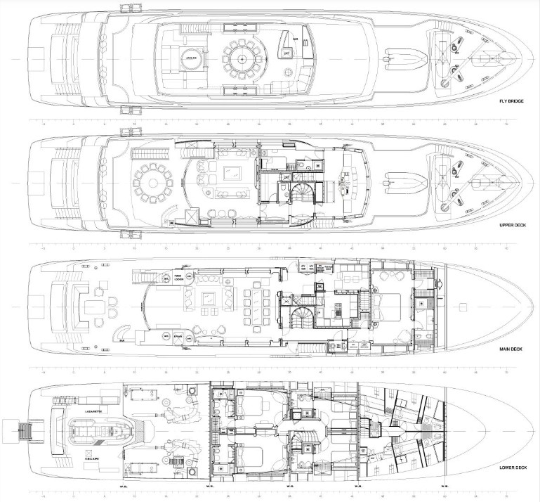 The main deck configuration is a traditional layout with the forward part devoted to the master suite, which has a full-beam main cabin with a lounge area, an ornate and luxurious en suite bathroom and a dressing room with a door that gives direct access to the foredeck. The open plan lounge on this level is lavishly finished and inviting, with a comfortable lounge, a big dining table and great views out through large picture windows on both sides.