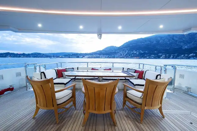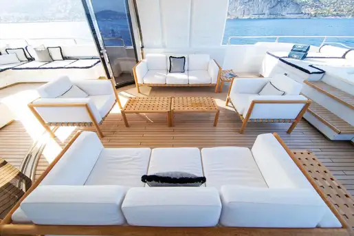 She has a hardtop sundeck with a main lounge area amidships that can be partially enclosed to exclude the breeze, a BBQ lounge forward and a sunbathing zone aft with a jacuzzi pool. The guest elevator serves the sundeck as well as the other three levels of accommodation.