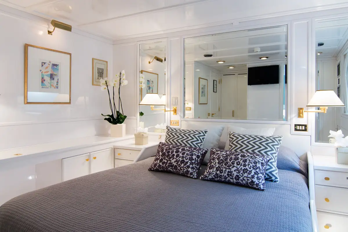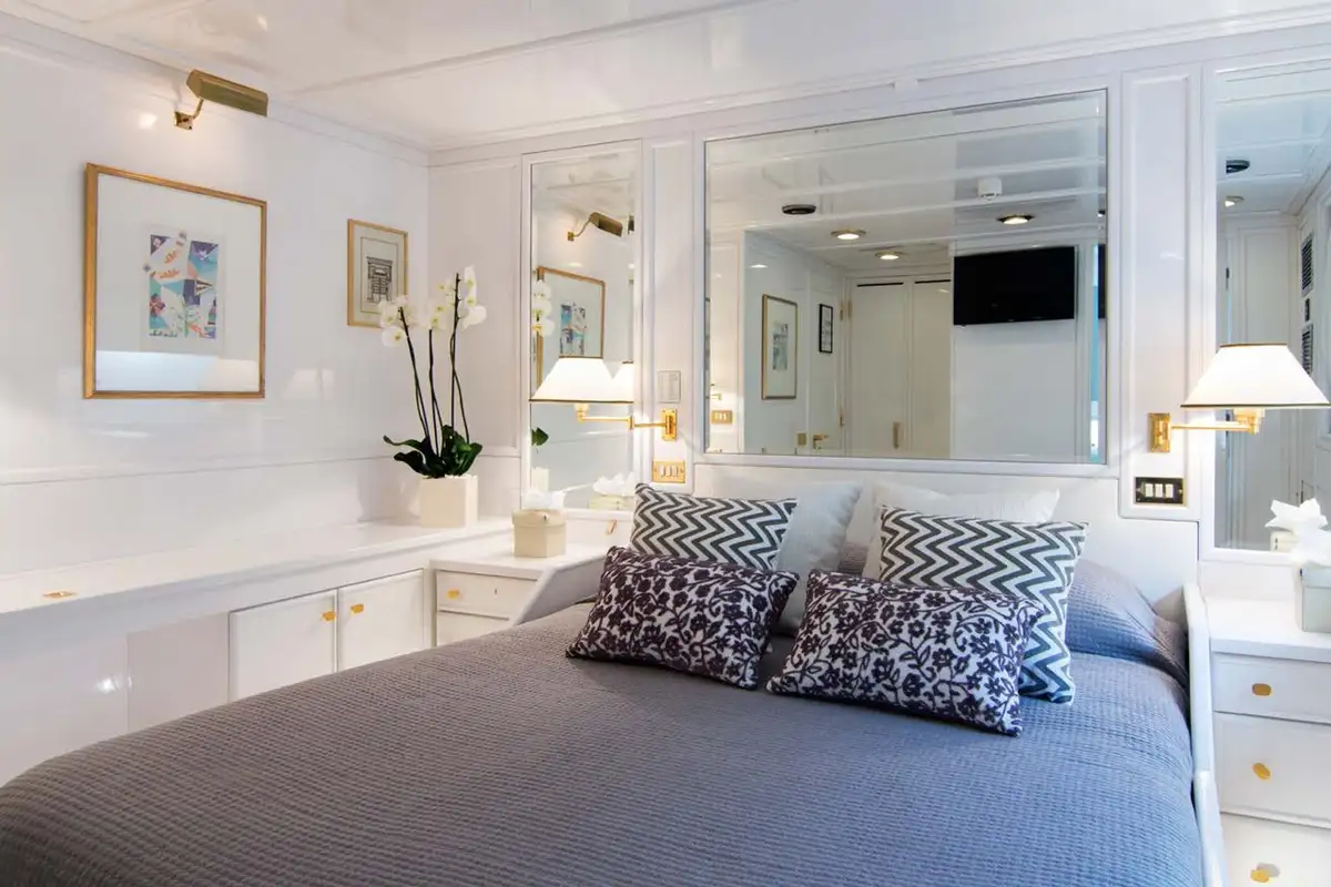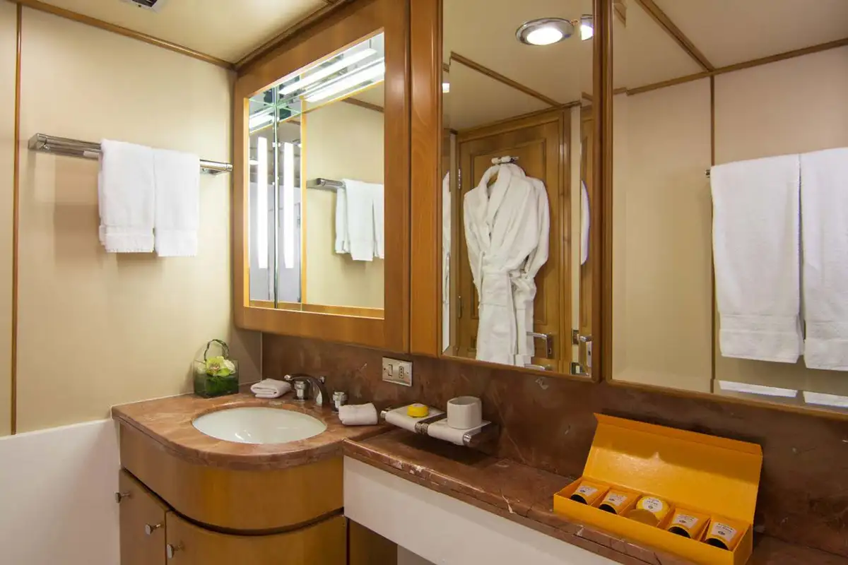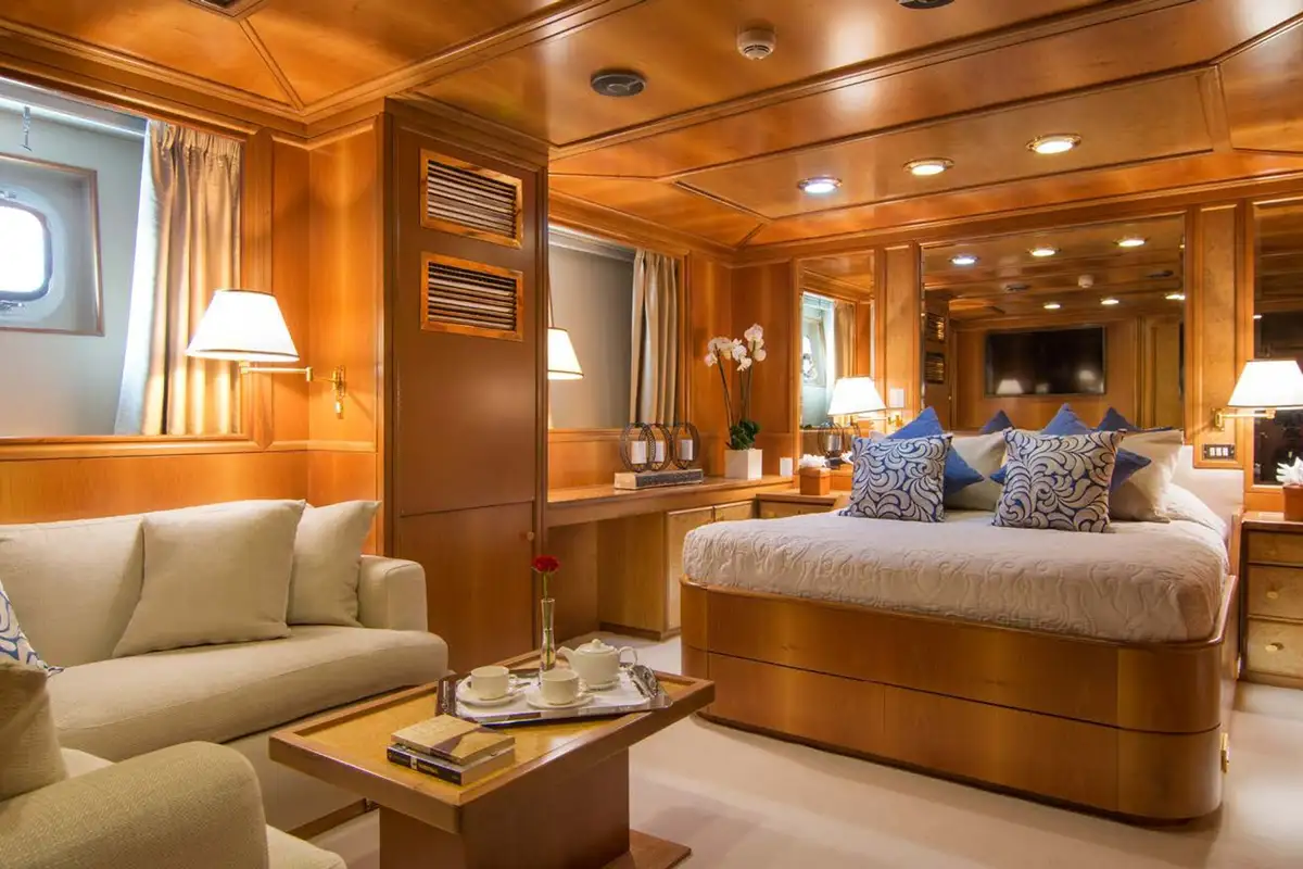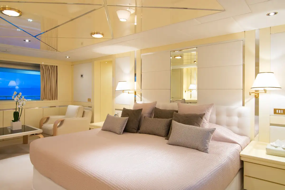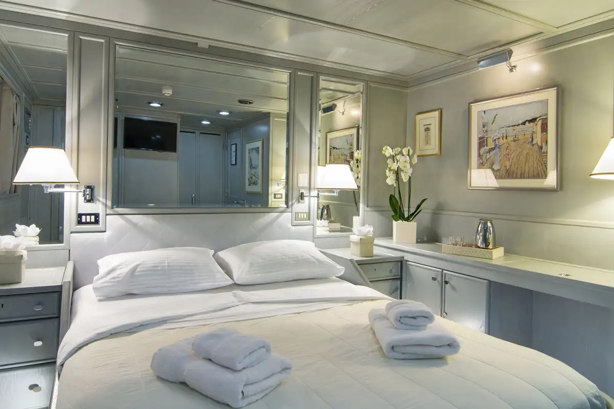 Boarding O’NATALINA, sit back and relax on the large main deck sofas with a refreshing drink while being introduced to the attentive crew. Entering O’NATALINA’s open plan main lounge, with its soft colour palette, the eye is immediately drawn to the artwork that crowns the formal dining area forward. Note this location for later in the week when you might choose to gather for a special occasion. Moving through the main lounge, your crew will escort you to your cabin. O’NATALINA accommodates 12 guests in seven cabins consisting of a master suite, two VIP suites, two double cabins and two convertible cabins.