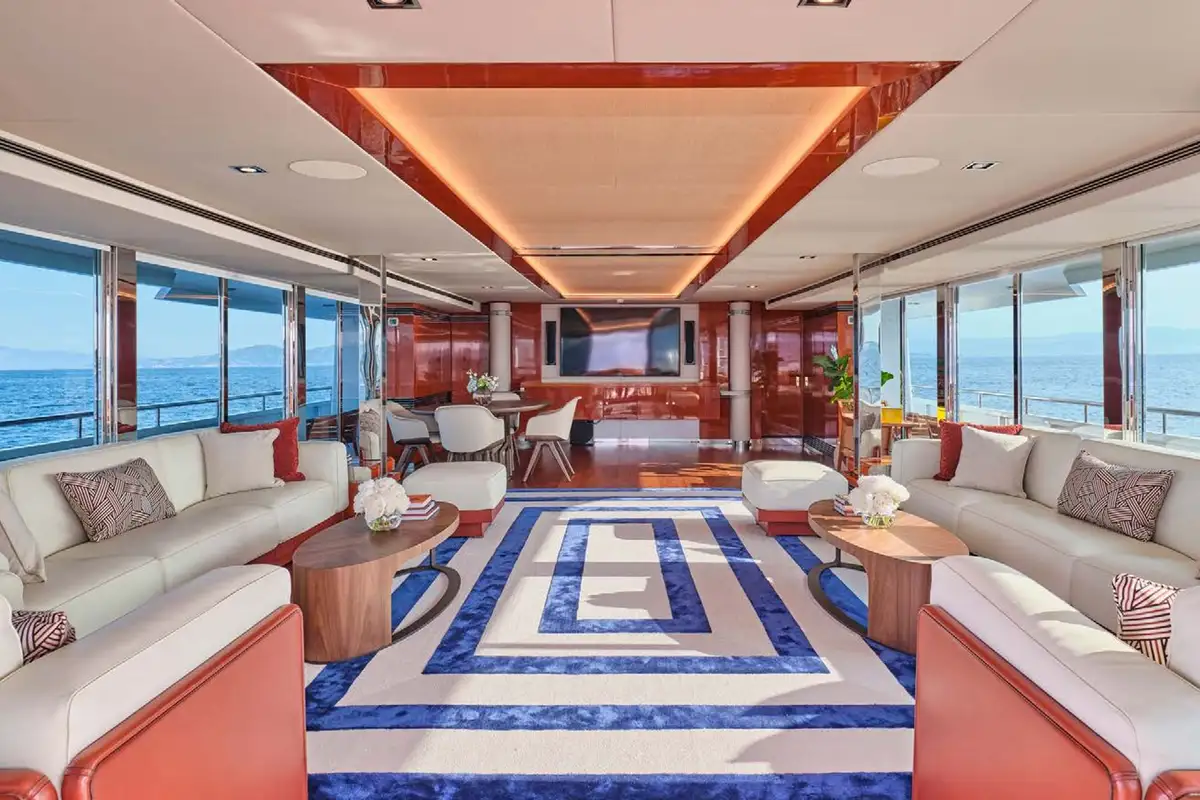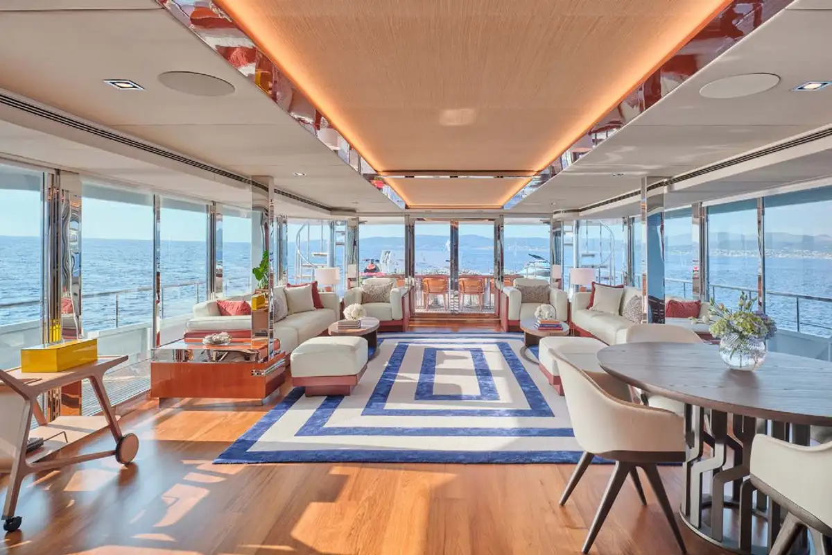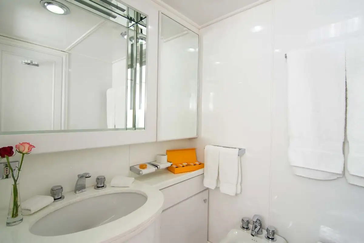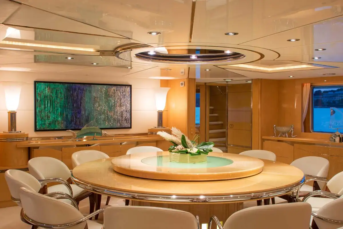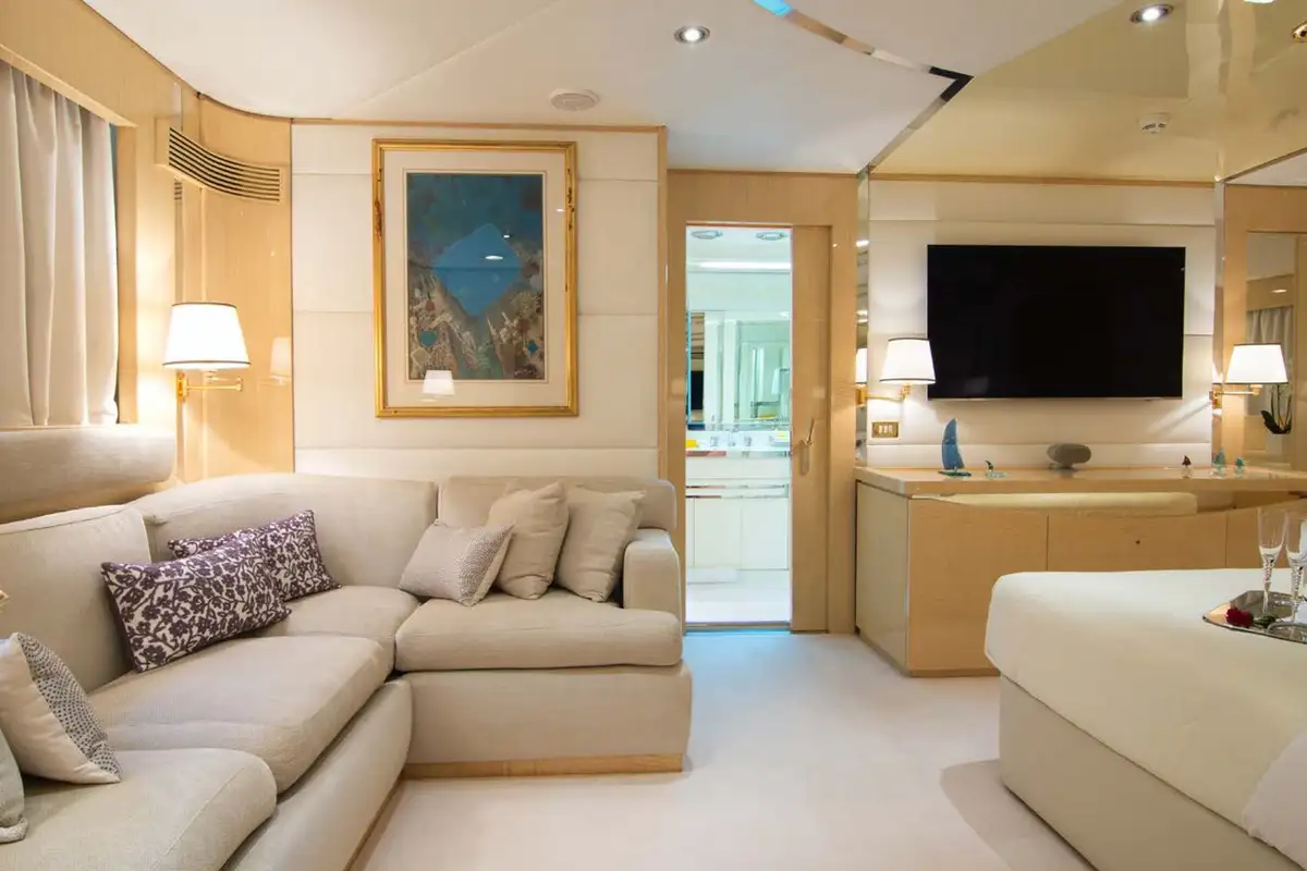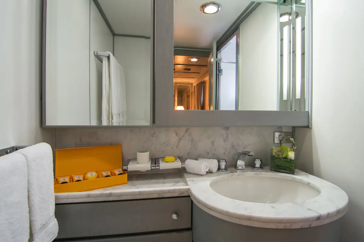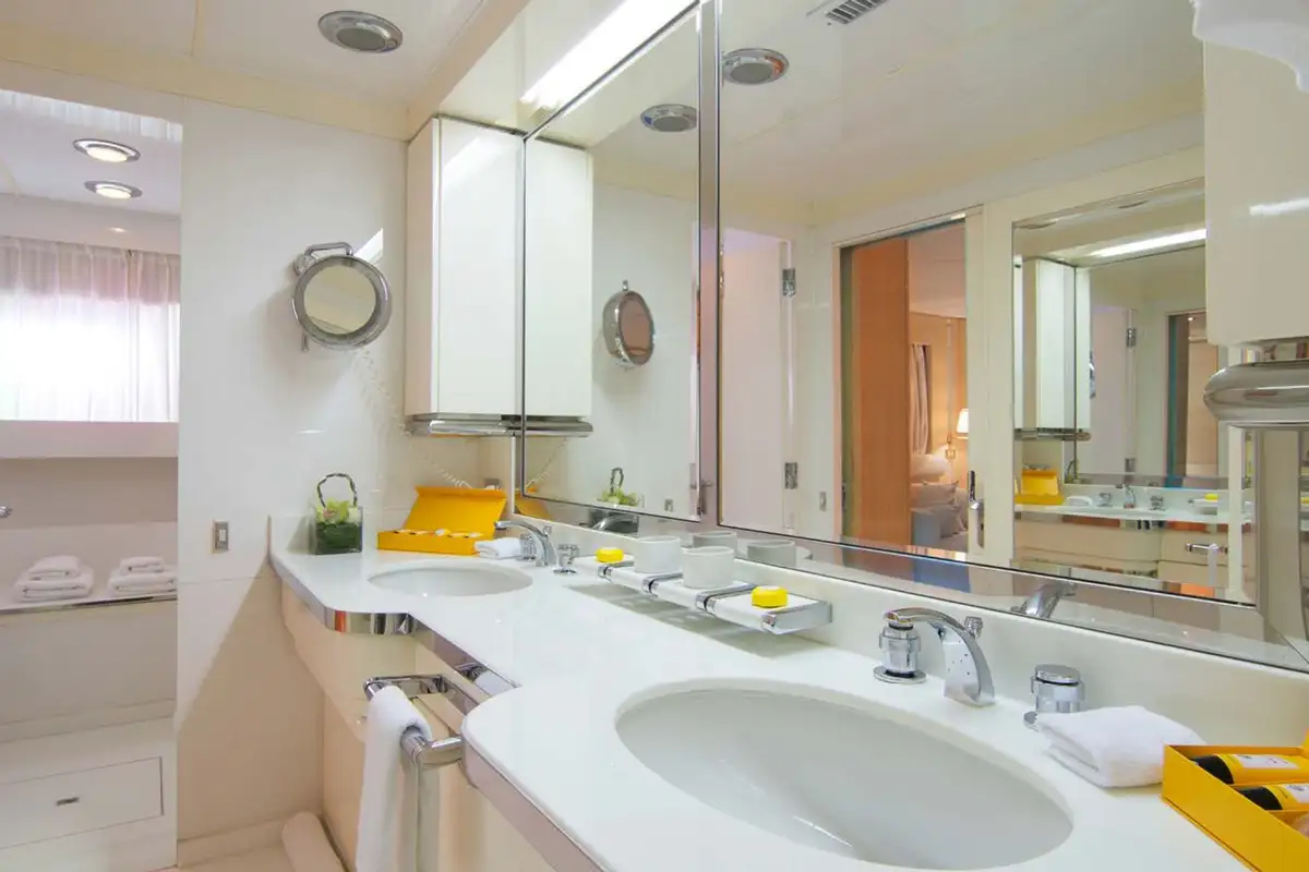 Boarding O’NATALINA, sit back and relax on the large main deck sofas with a refreshing drink while being introduced to the attentive crew. Entering O’NATALINA’s open plan main lounge, with its soft colour palette, the eye is immediately drawn to the artwork that crowns the formal dining area forward. Note this location for later in the week when you might choose to gather for a special occasion. Moving through the main lounge, your crew will escort you to your cabin. O’NATALINA accommodates 12 guests in seven cabins consisting of a master suite, two VIP suites, two double cabins and two convertible cabins.