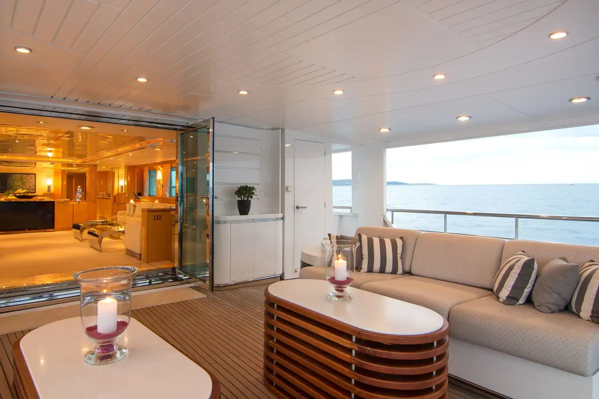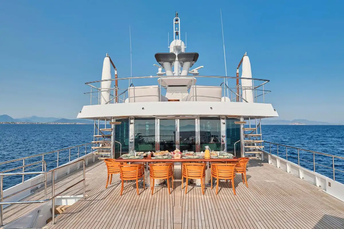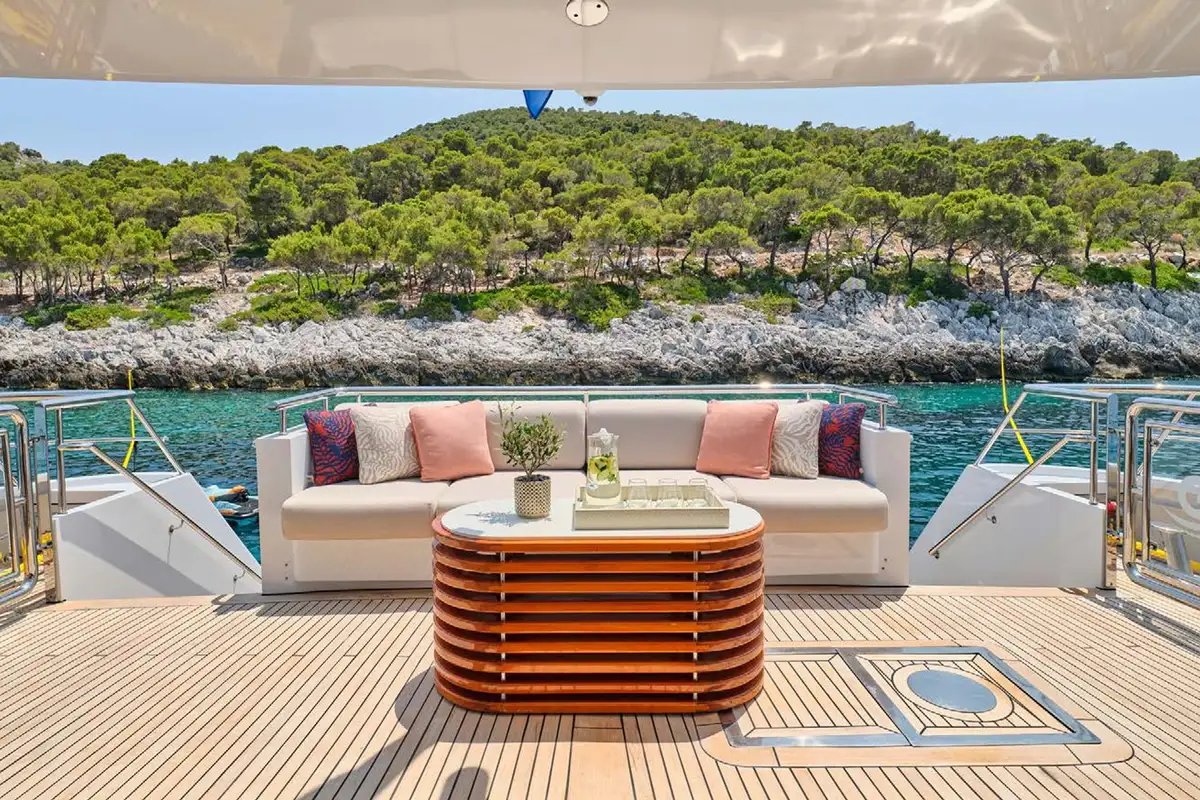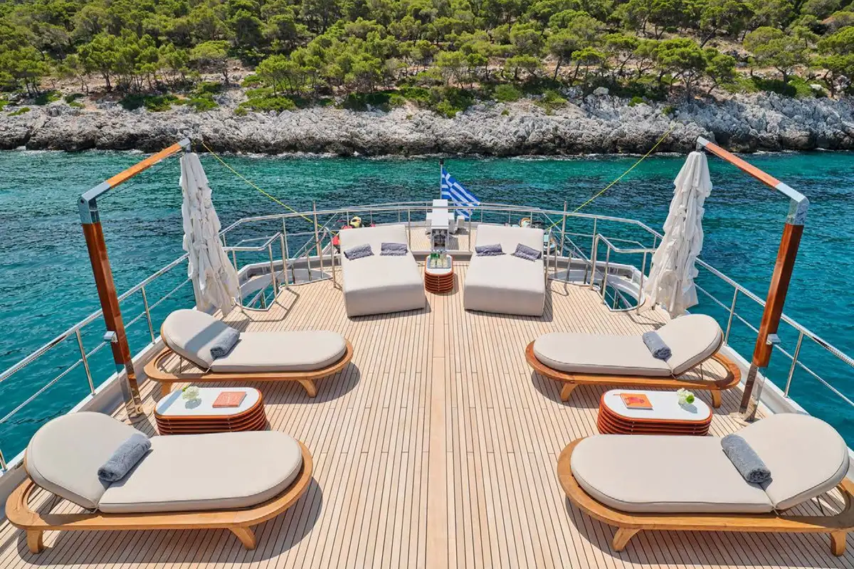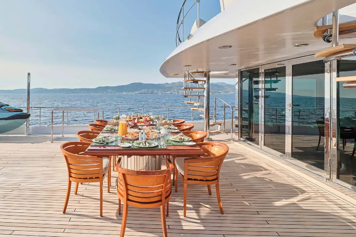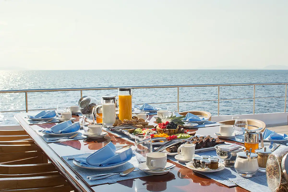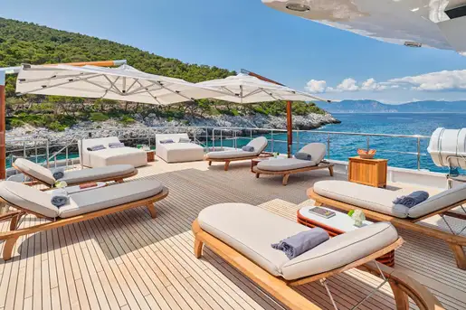 Once you have settled into your accommodation, it’s time to head outside to discover the yacht’s entertainment and lounging areas spread over her three spacious decks. You will most likely choose to spend most of your day on the sun deck where double and single loungers are spaced around, some in full sun and others beneath the shade of the yacht’s hardtop. This large area doubles as an outdoor gym – the perfect place to get your pulse racing complete with fresh air and sea views.