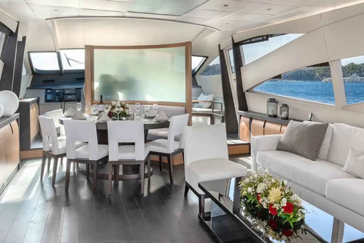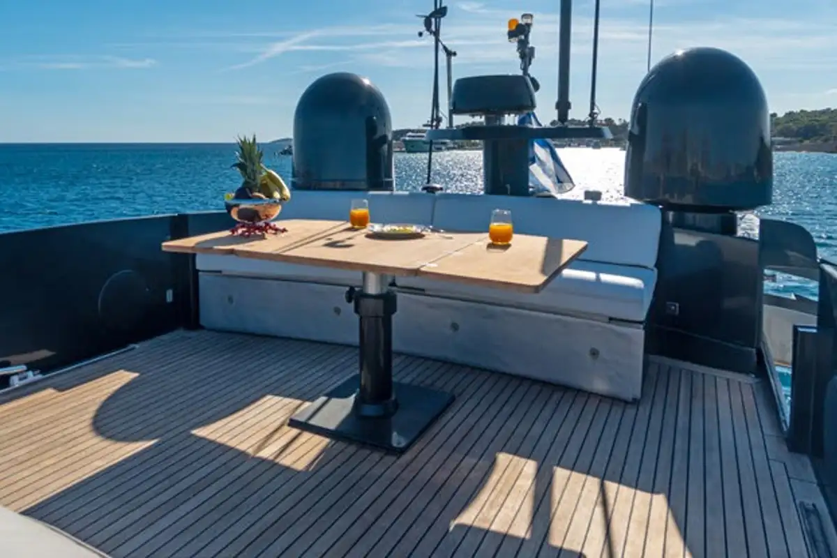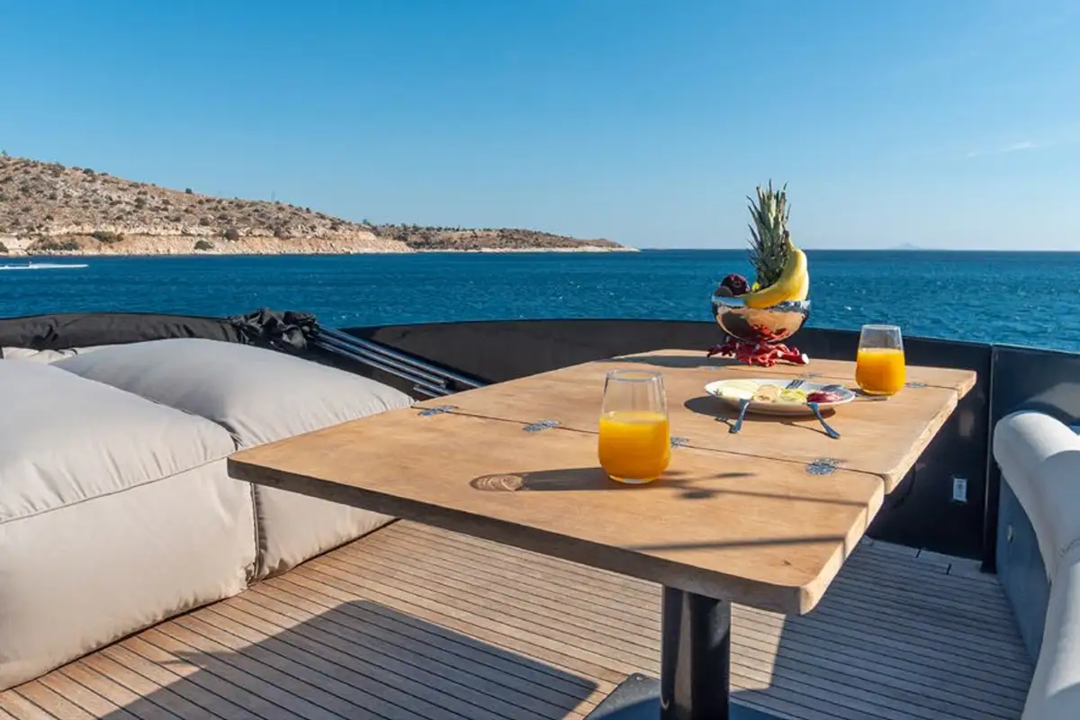 Perfect for families or small groups, ONE accommodates up to eight guests across four beautifully appointed cabins – two doubles and two twins, including pullman bunks for added flexibility. Her interiors are cool and contemporary, while outside it’s all about lounging, dining, and soaking up the views as the coastline rushes by at up to 40 knots.