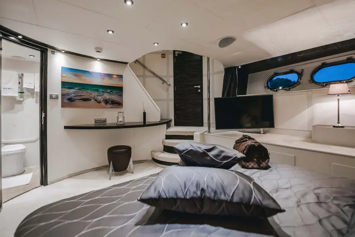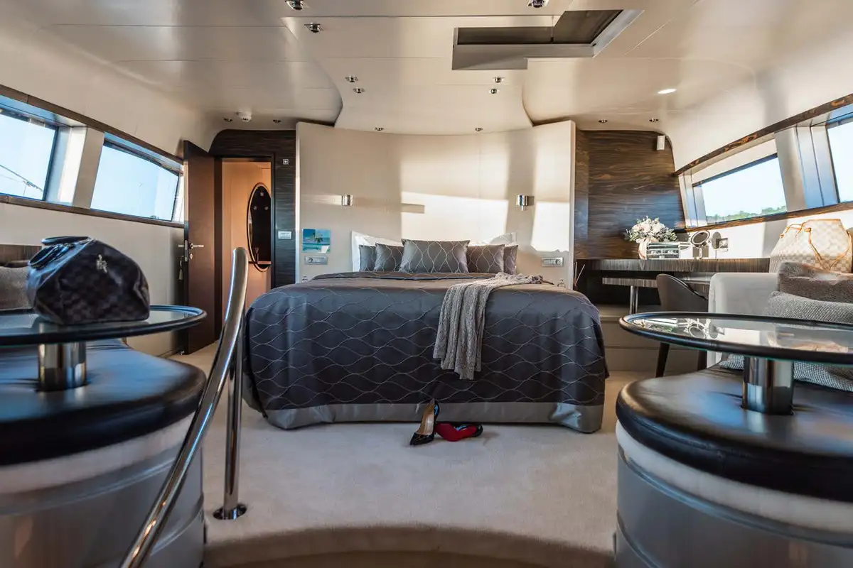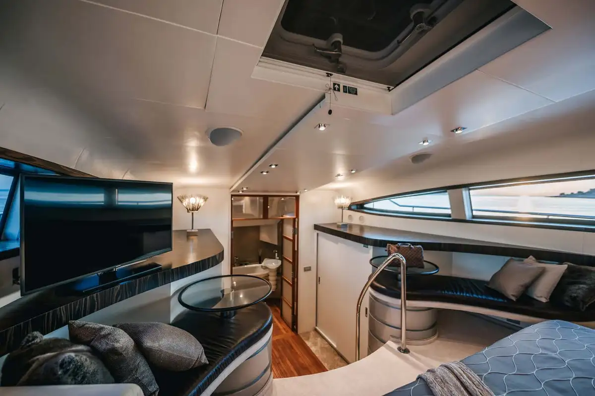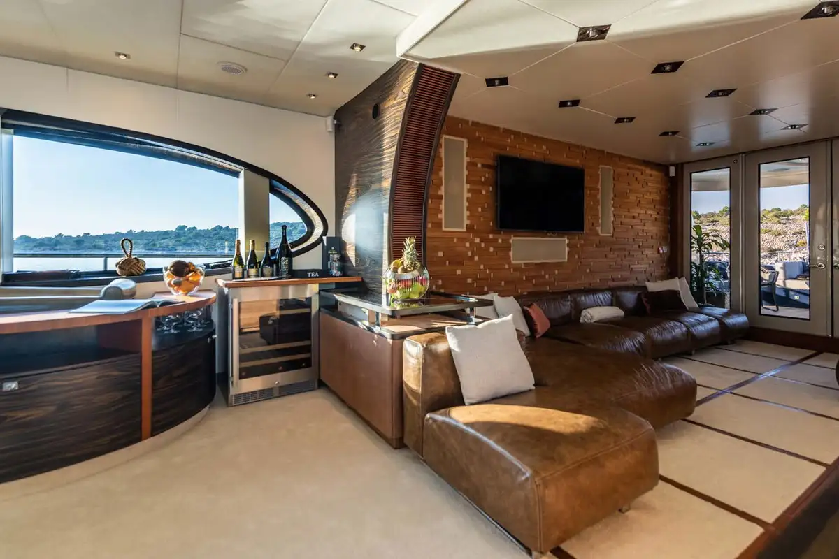Entering from the al fresco dining area in the cockpit, you find yourself in the lounge with wooden blocks covering the walls. With no windows and just a large flatscreen TV to distract you, the focal point of the room is the circular entrance to the forward lounge, formed from Macassar ebony. Light pours through the picture windows, enticing you into this stunning space. You cannot miss the central raised dining table and stools around it; it doubles as a poker table for evening entertainment. To starboard is a cosy, raised nook with facing seats, making it perfect for a game of backgammon, chess, or any other two-person board game.