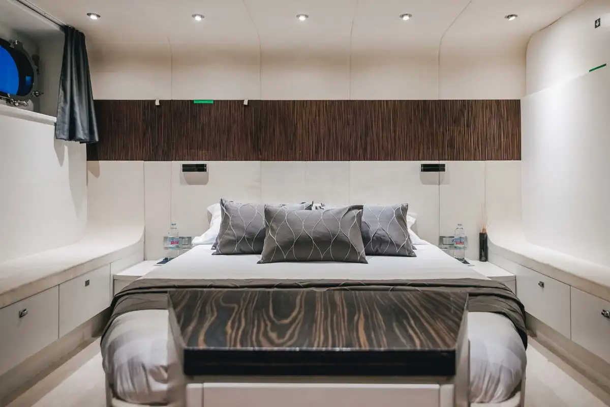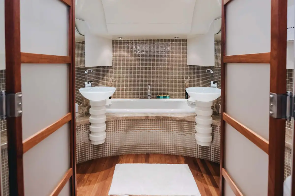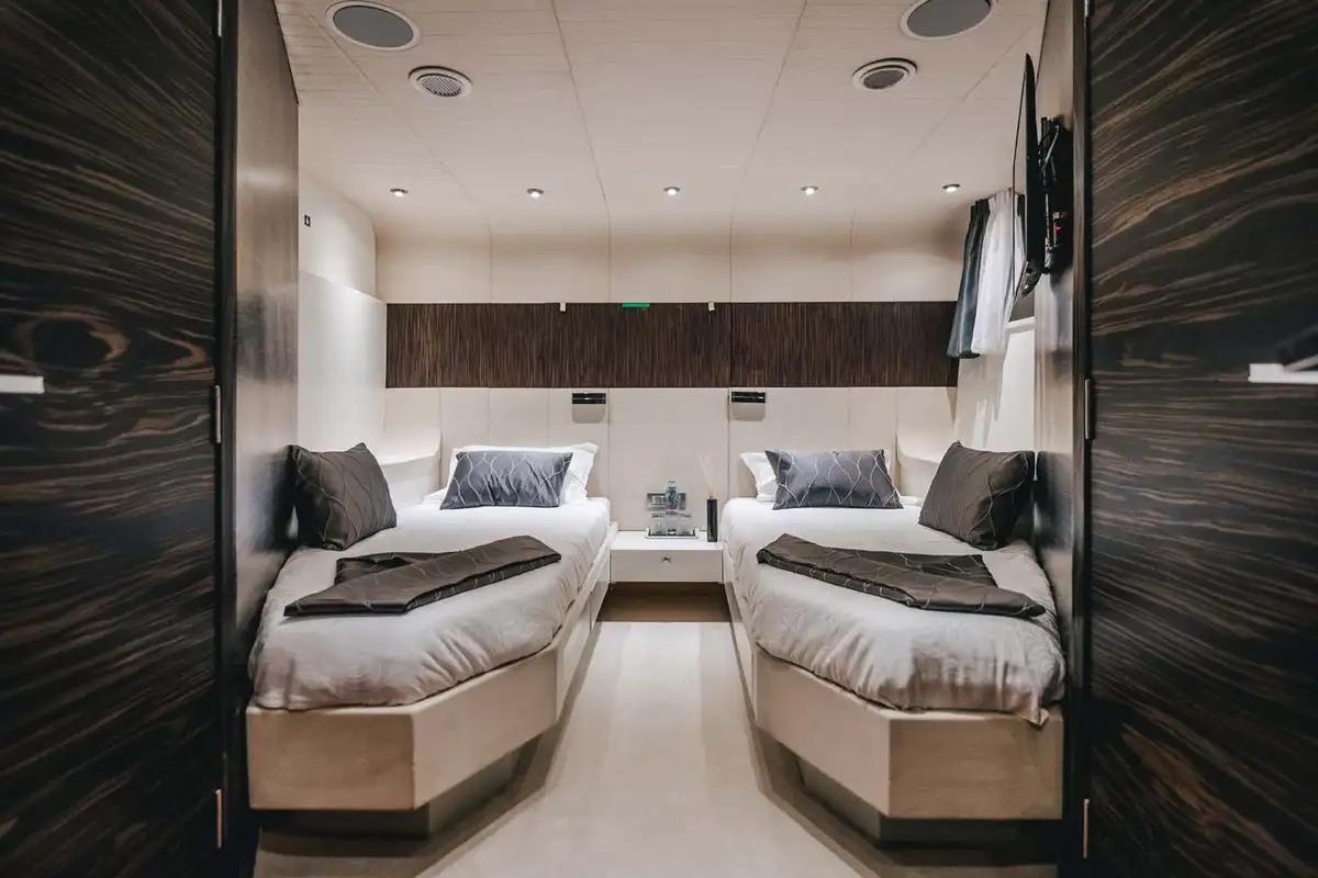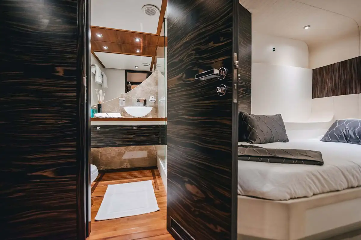 On the lower deck, there is a double VIP suite forward, two double suites to the rear and two twin-berth suites, all with more ebony detailing and en suite facilities.
