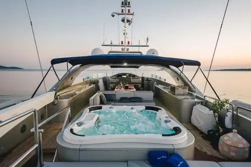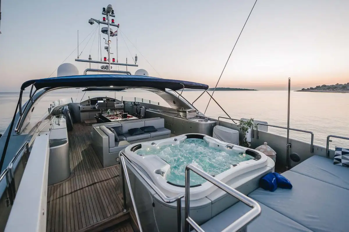 Lazy days on ONE BLUE will be spent on her sun deck. Start your day with a few km on the exercise bike before a quick dip in the jacuzzi. You could enjoy a buffet breakfast in the al fresco dining area on the main deck or take advantage of the extra height the sundeck provides. Underway, you and your guests can relax in the L-shaped seating or on the large rear sunpad. Once at your destination, everyone can enjoy some time in the jacuzzi while ONE BLUE’s crew ready the watersports equipment.
