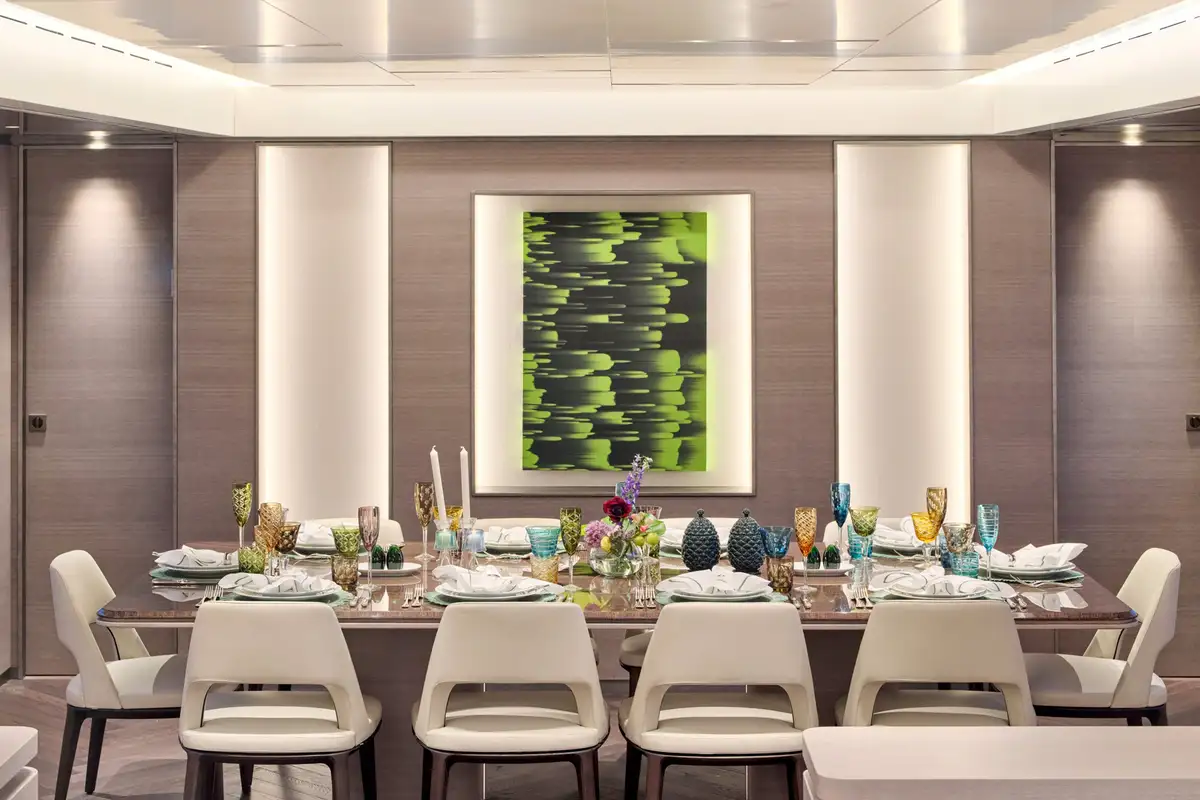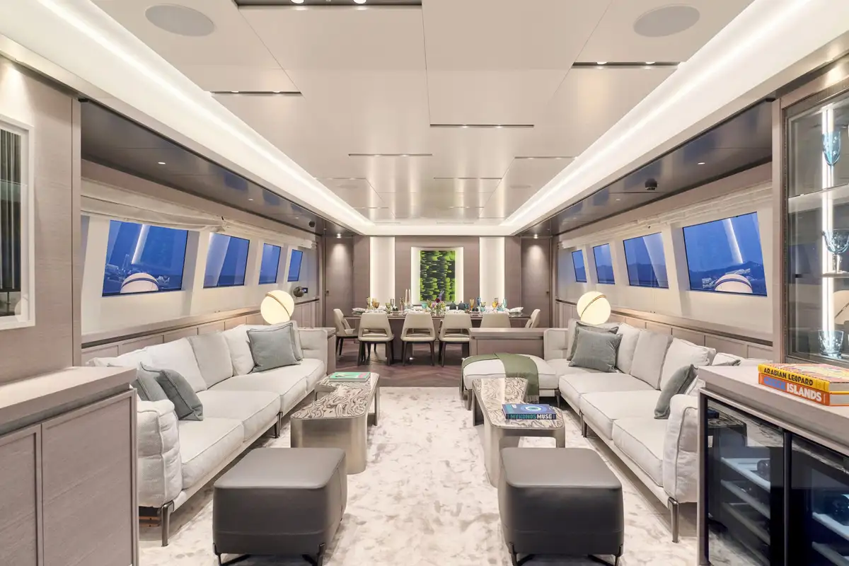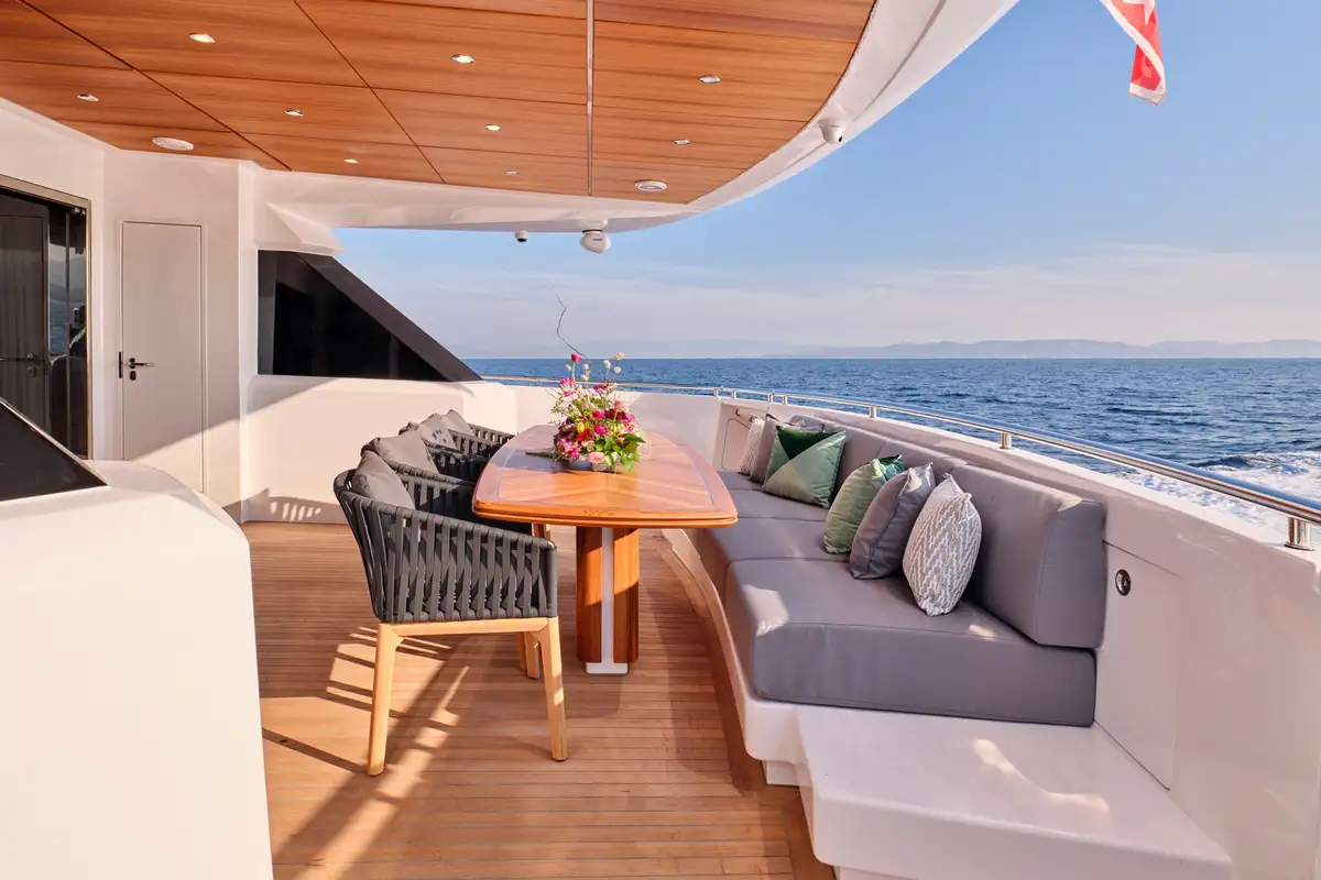 O’NEIRO’s modern design flows seamlessly to her exterior. Her spacious flybridge offers multiple configurations for lounging and al fresco dining, while the aft deck presents another inviting outdoor dining area – ideal for meals with a view.