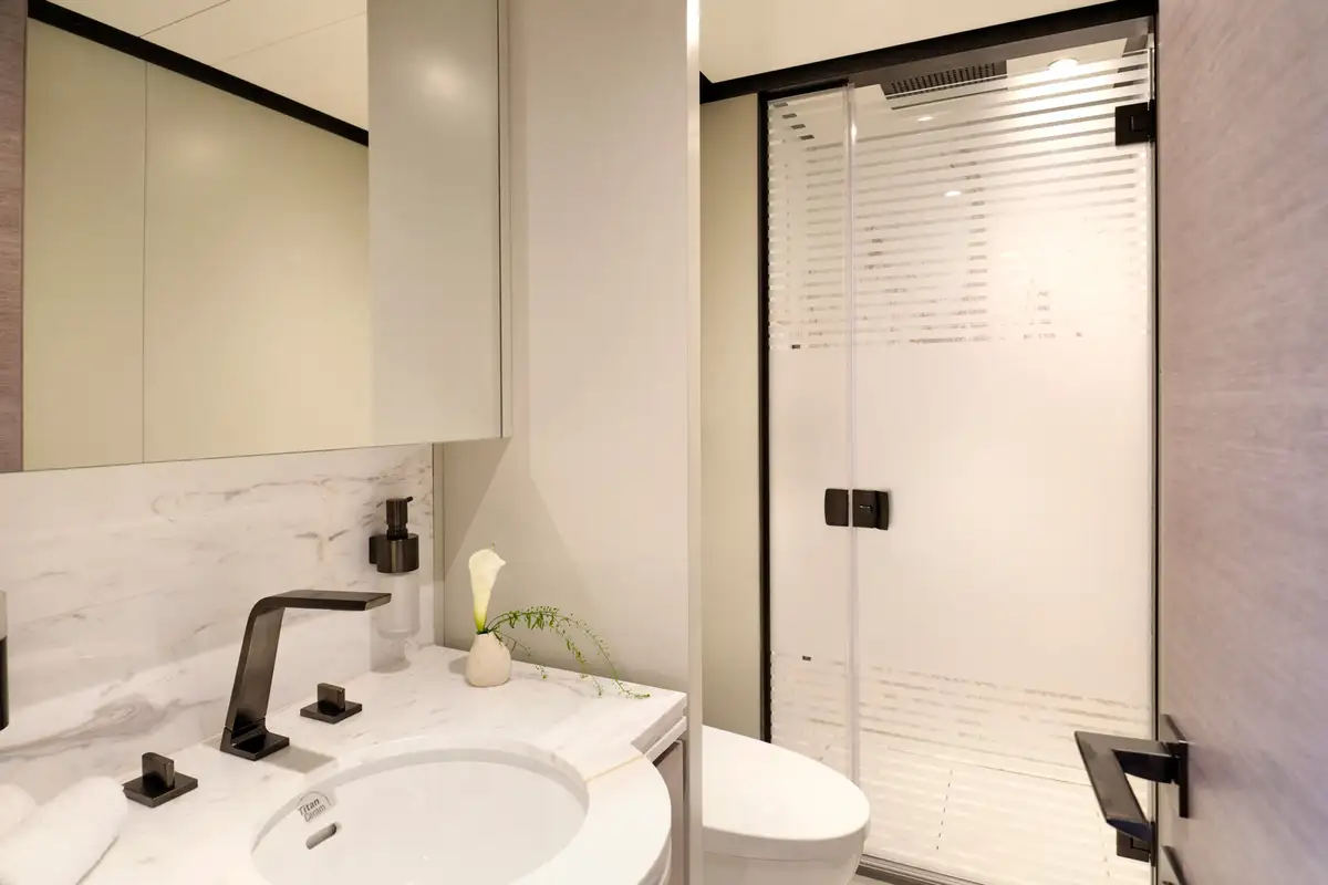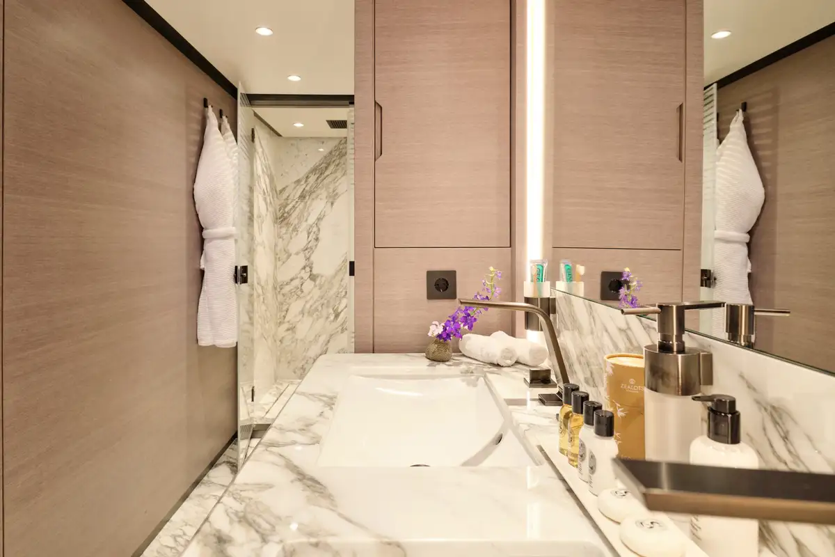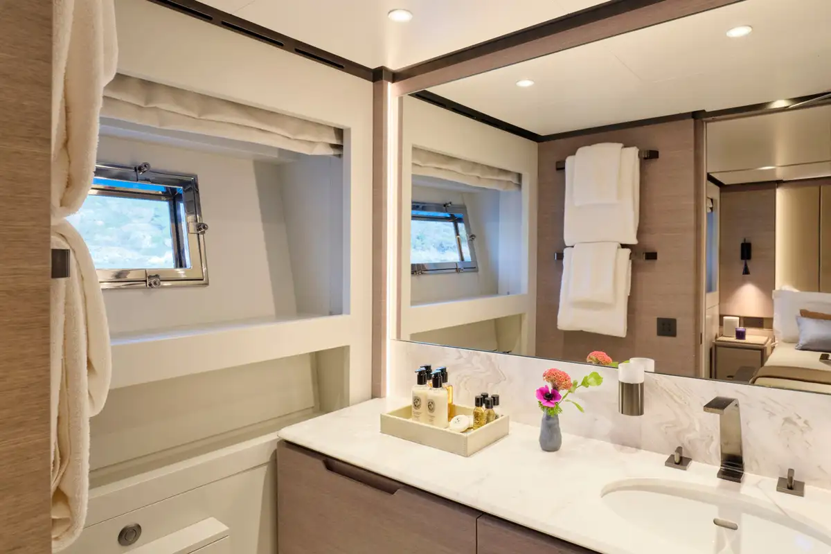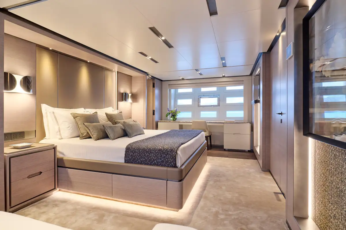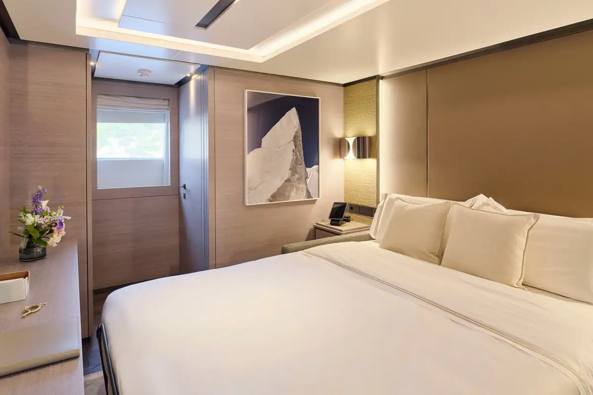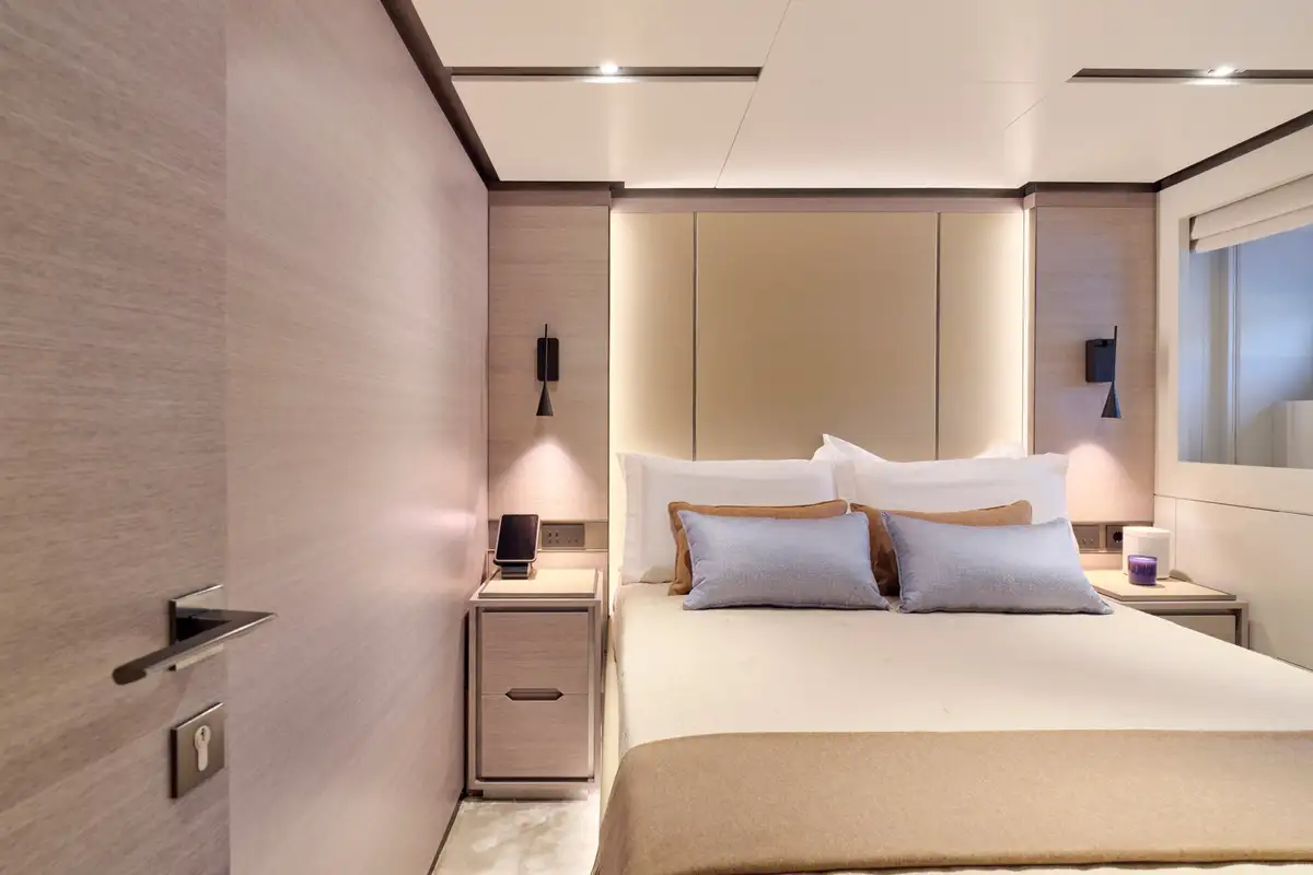 Crafted for comfort and versatility, O’NEIRO accommodates up to 11 guests in a thoughtful and luxurious cabin layout. On the lower deck, discover a full-beam master suite, two double cabins, and two twins – one with an additional pullman berth. A flexible multi-use cabin on the main deck with a sofa bed adds further convenience for families or groups.