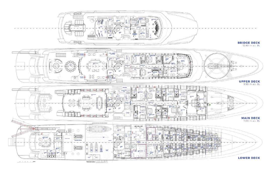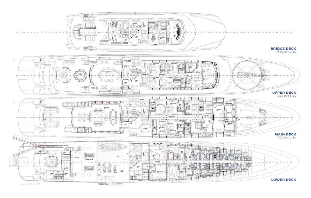 The upper deck accommodation comprises of the Owner’s suite with impressive lounge area, a VIP cabin and two double cabins whereas the main deck accommodation comprises of one VIP suite, one convertible lounge/ double cabin, three doubles, and three twin cabins with a pullman berth in each. Additional staff can be accommodated on the lower deck where there is another twin cabin with pullman berth and one single ‘hospital cabin’. All 14 cabins are en suite and feature beautiful Greek and other exotic marble. The styling is clean and bright.