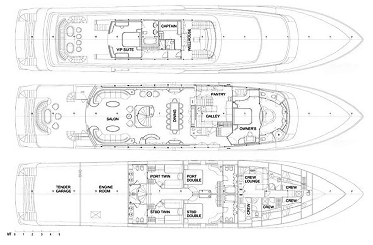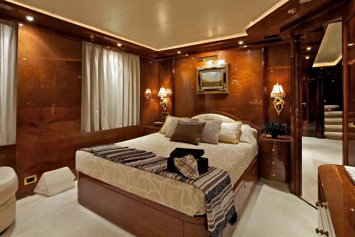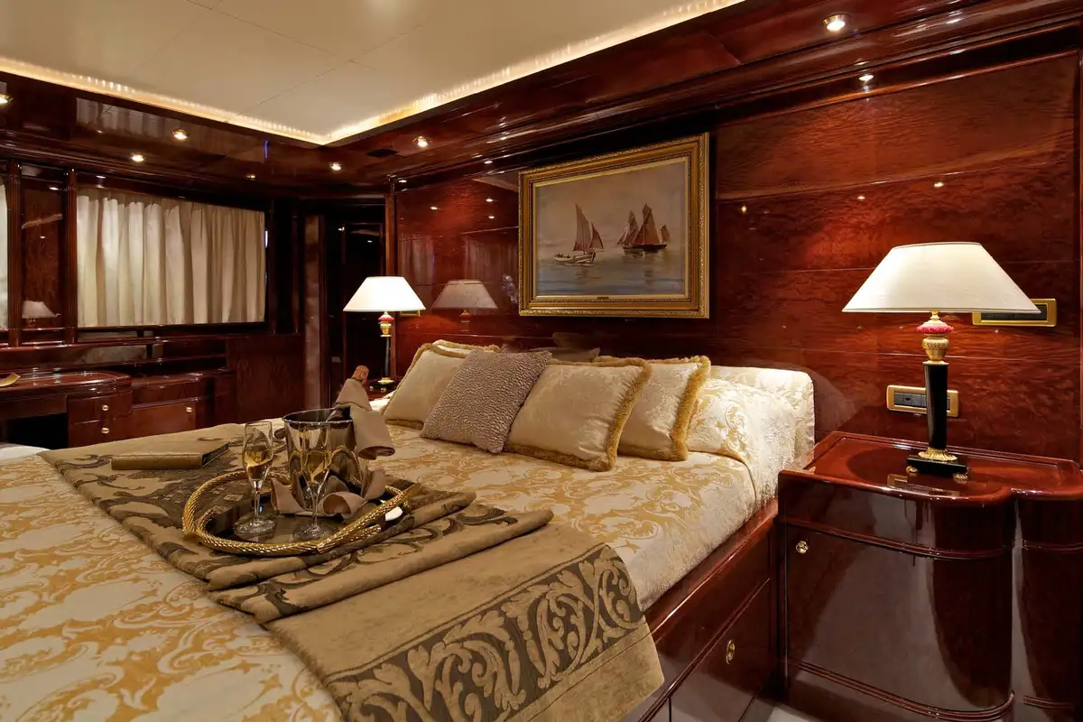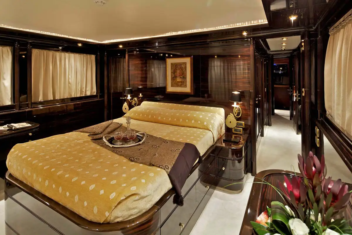 Ahead of this amazing saloon you’ll find your grand master suite. The radiant high gloss wood has an enduring charm and the fine furnishings further the suite’s quintessential traditional feel. To starboard, one finds a desk area and ahead is your stunning en suite bathroom, the focal point of which is the large circular spa bath. On the upper deck, a similarly high-standard VIP suite can be found. It opens out directly onto the aft deck and the lovely al fresco lounge area with full-width seating at the rear.