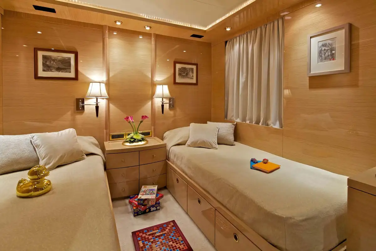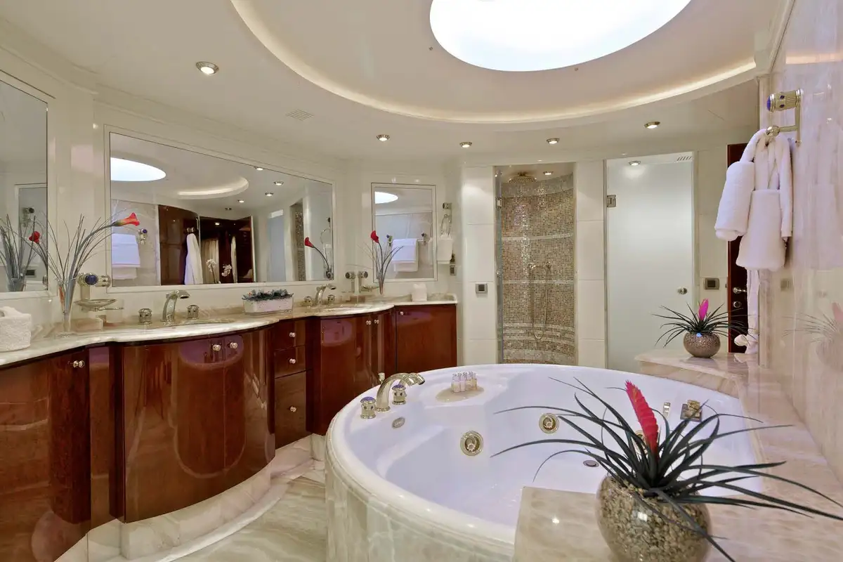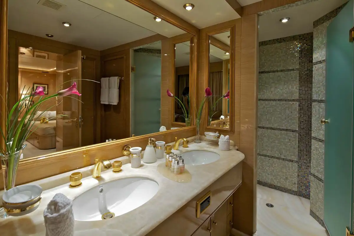 More guest suites are on the lower deck, these havens of tranquillity are the perfect places for your guests to refresh and relax. With two spacious double berth suites and two twin-berth suites available the layout offers your guests plenty of sleeping arrangements depending on their needs. All have beautiful en suite facilities.